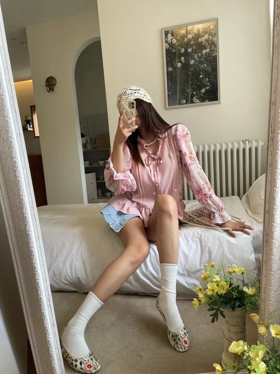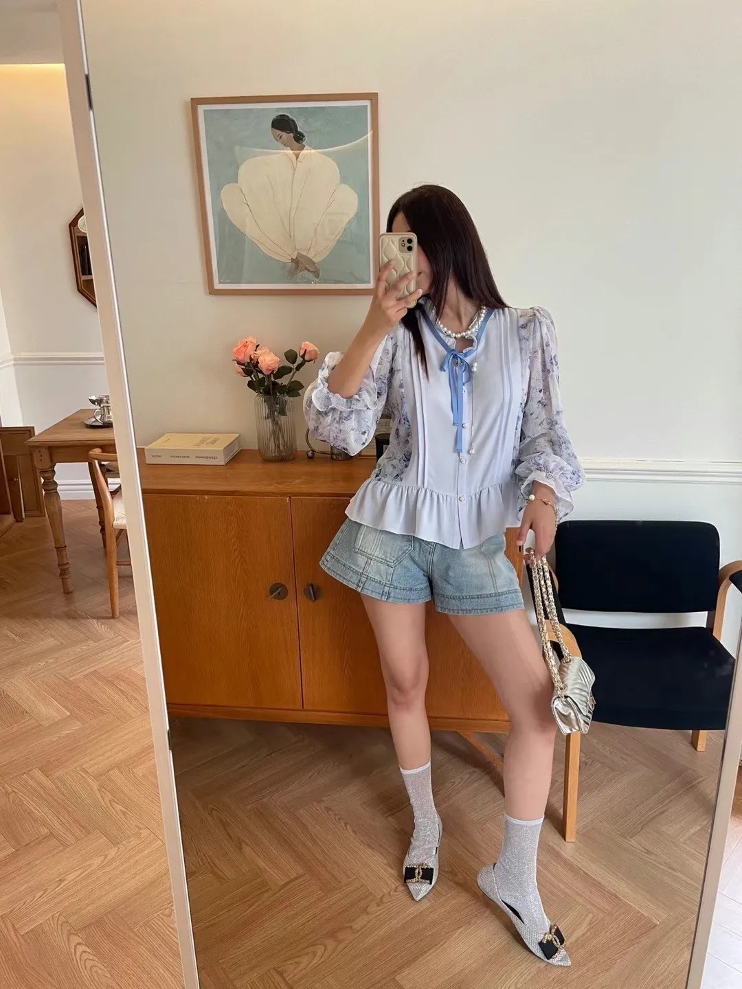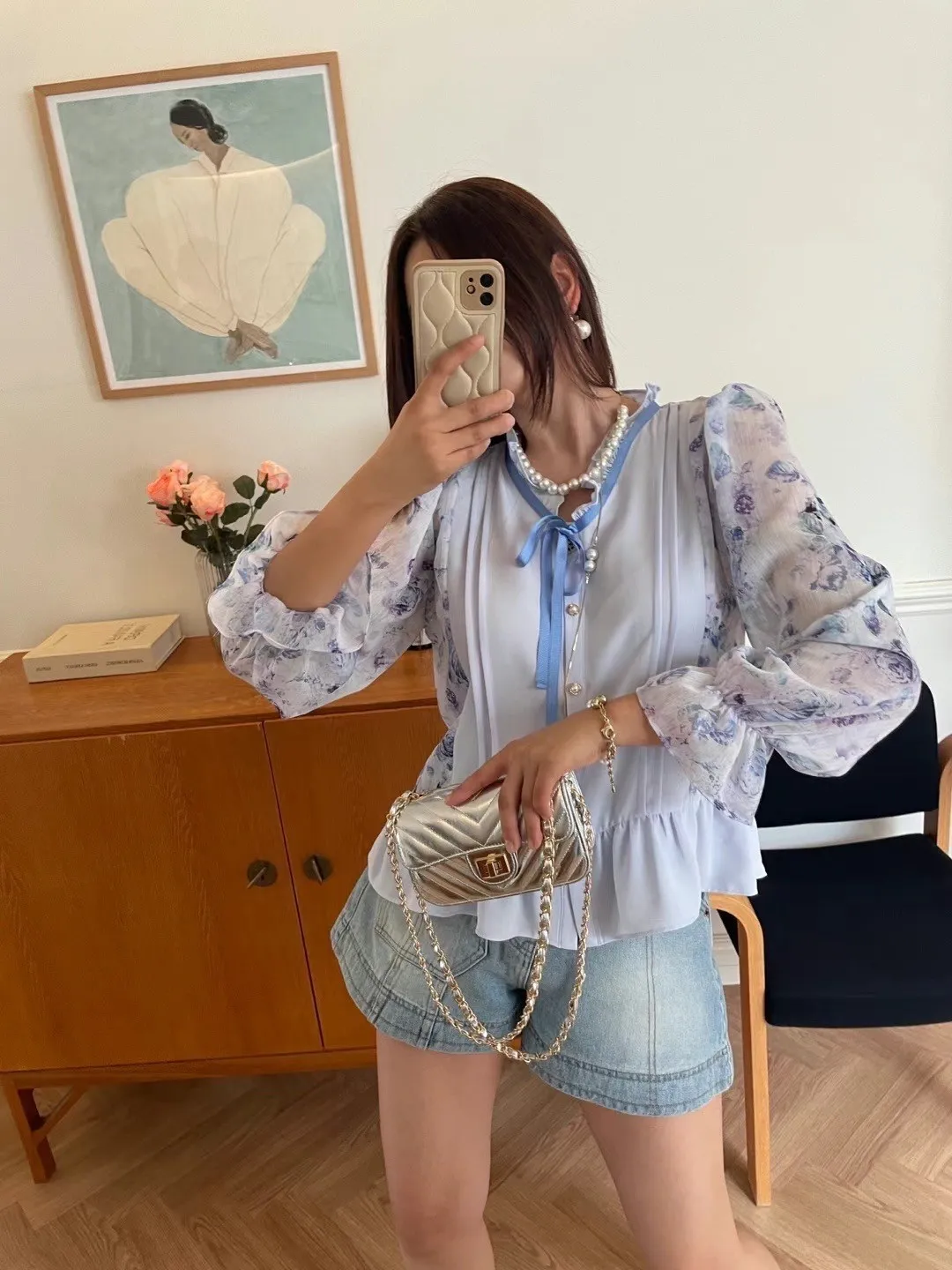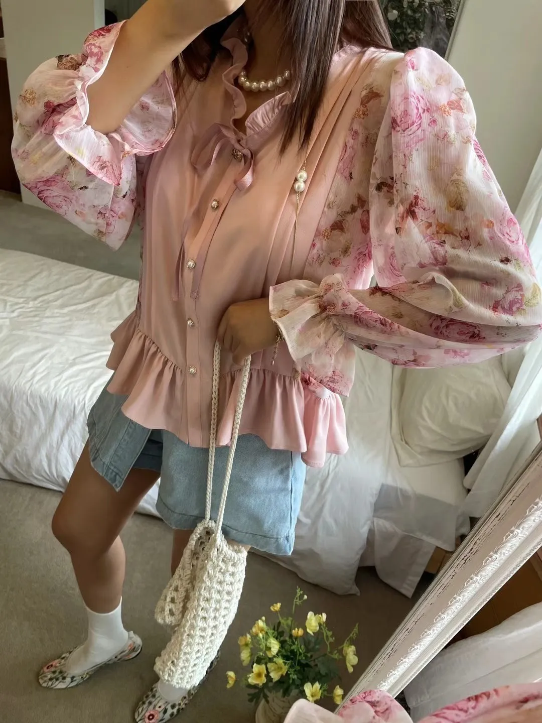 FA125高級雪紡玫瑰透光美袖上衣 粉 藍 官網價$1190 線上價$1160