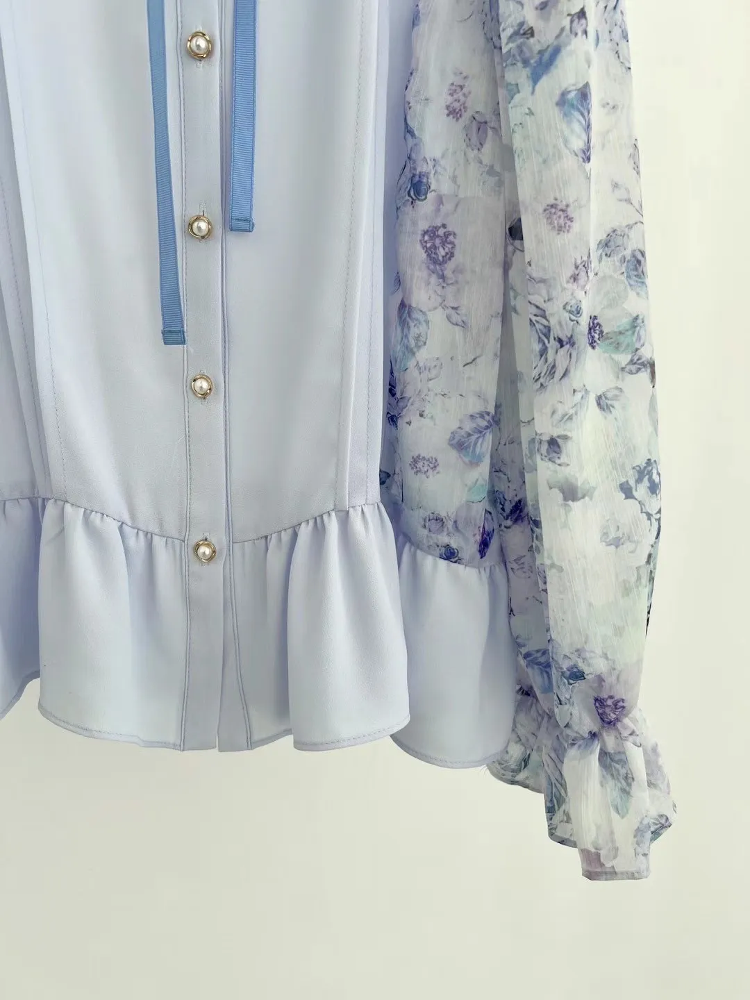 雪紡 高級雪紡 琴摺娃娃裝下擺 高級寶石釦 透光玫瑰袖 荷葉V領