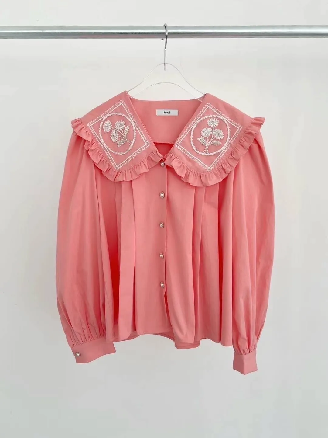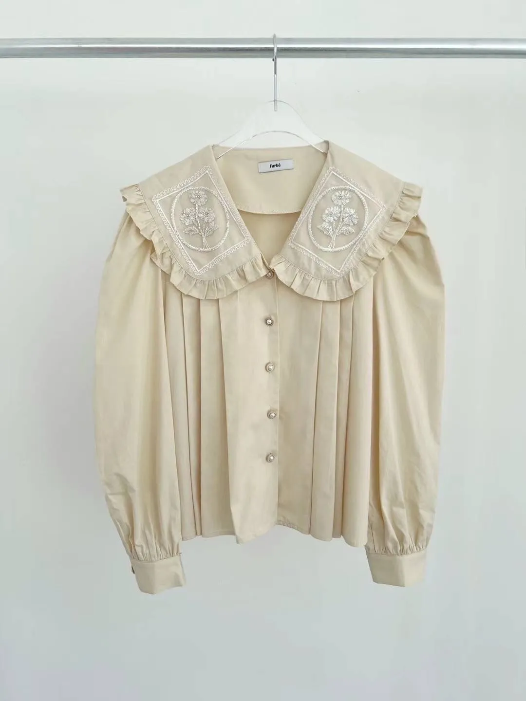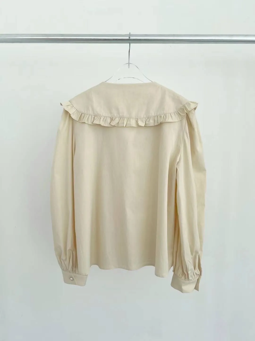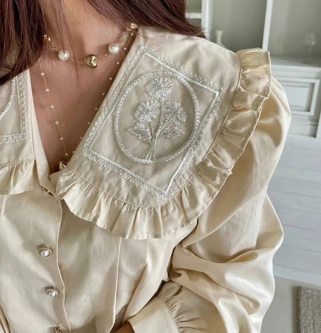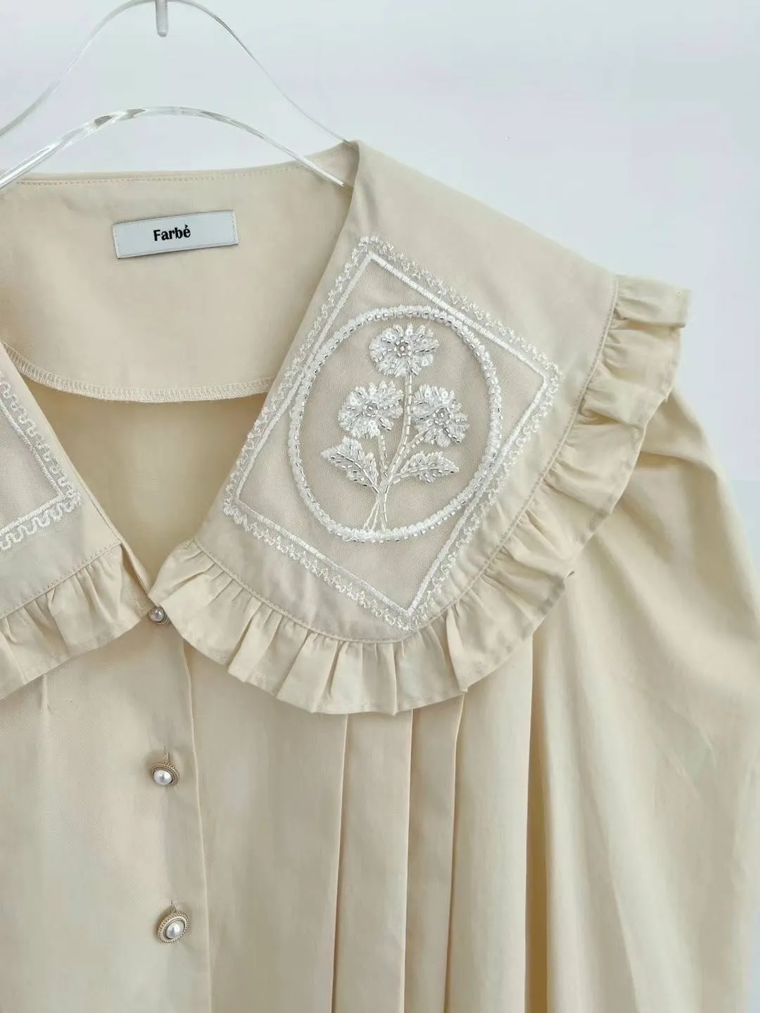 棉 荷葉領 精緻閃耀刺繡 珍珠釦穿脫 袖口有釦 空間寬鬆