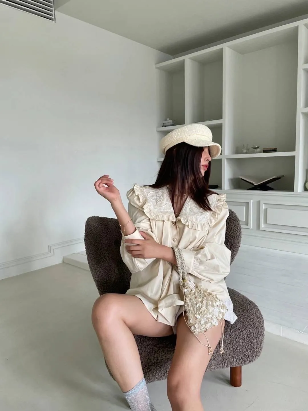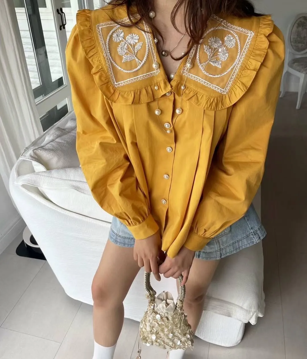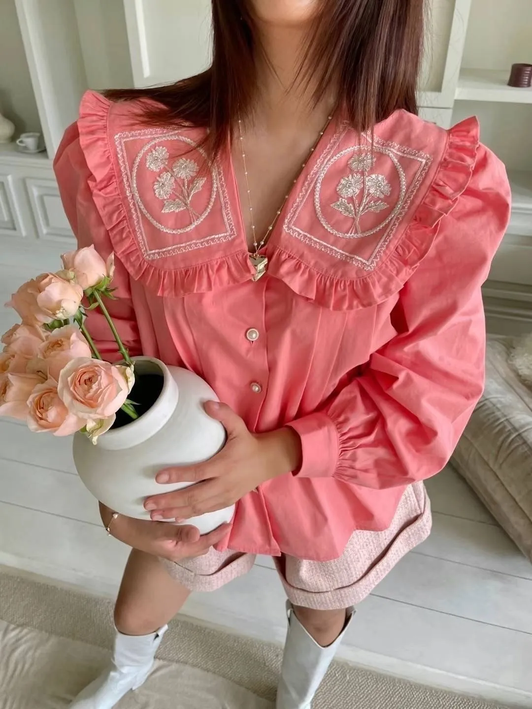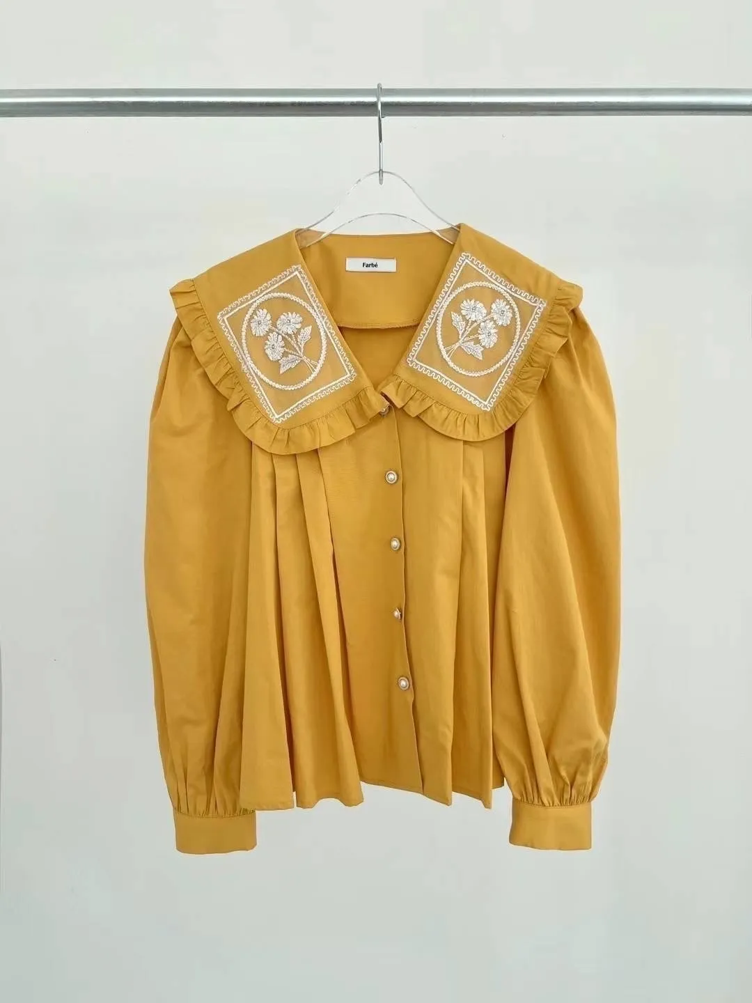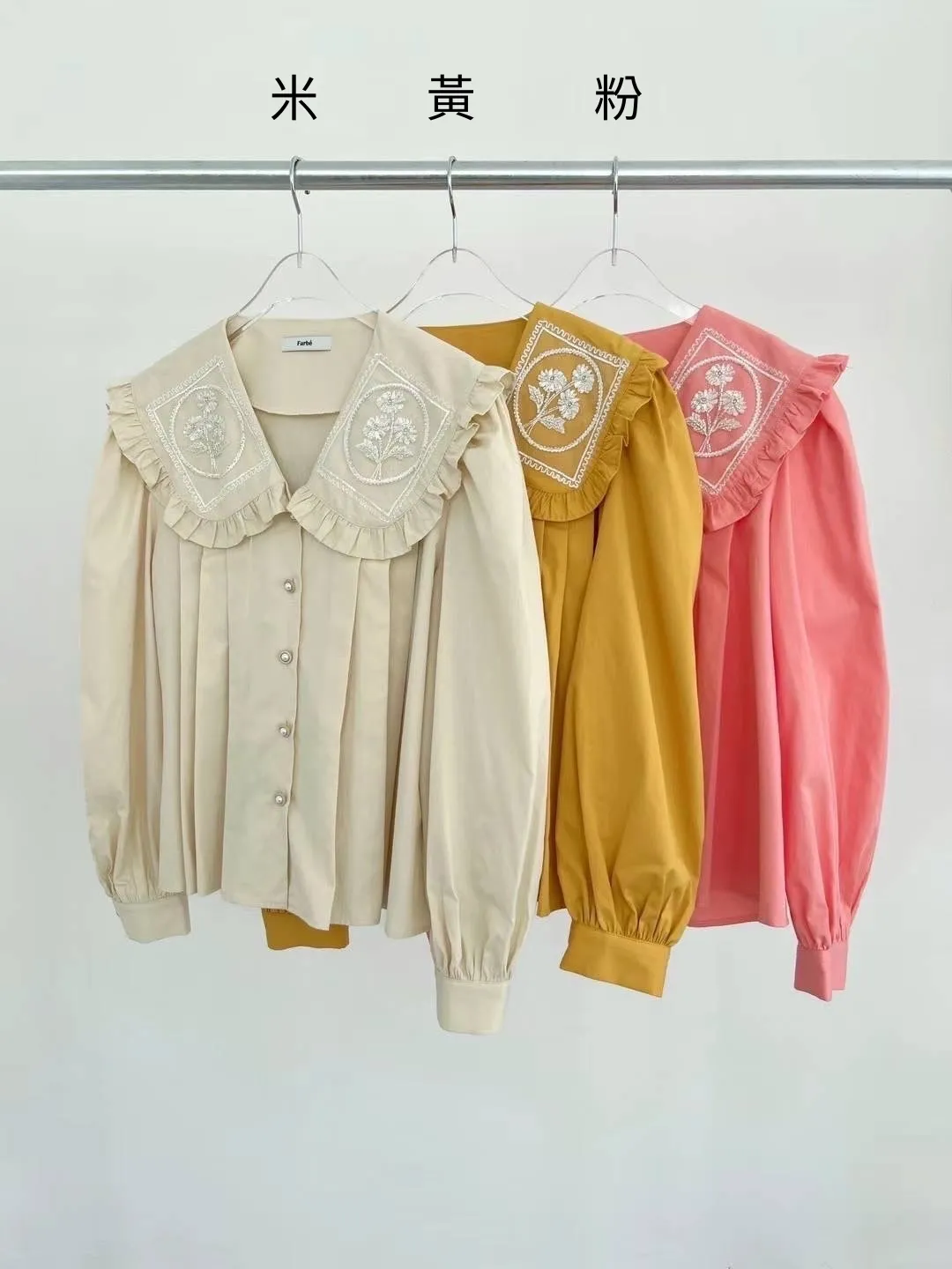 棉 荷葉領 精緻閃耀刺繡 珍珠釦穿脫 袖口有釦 空間寬鬆