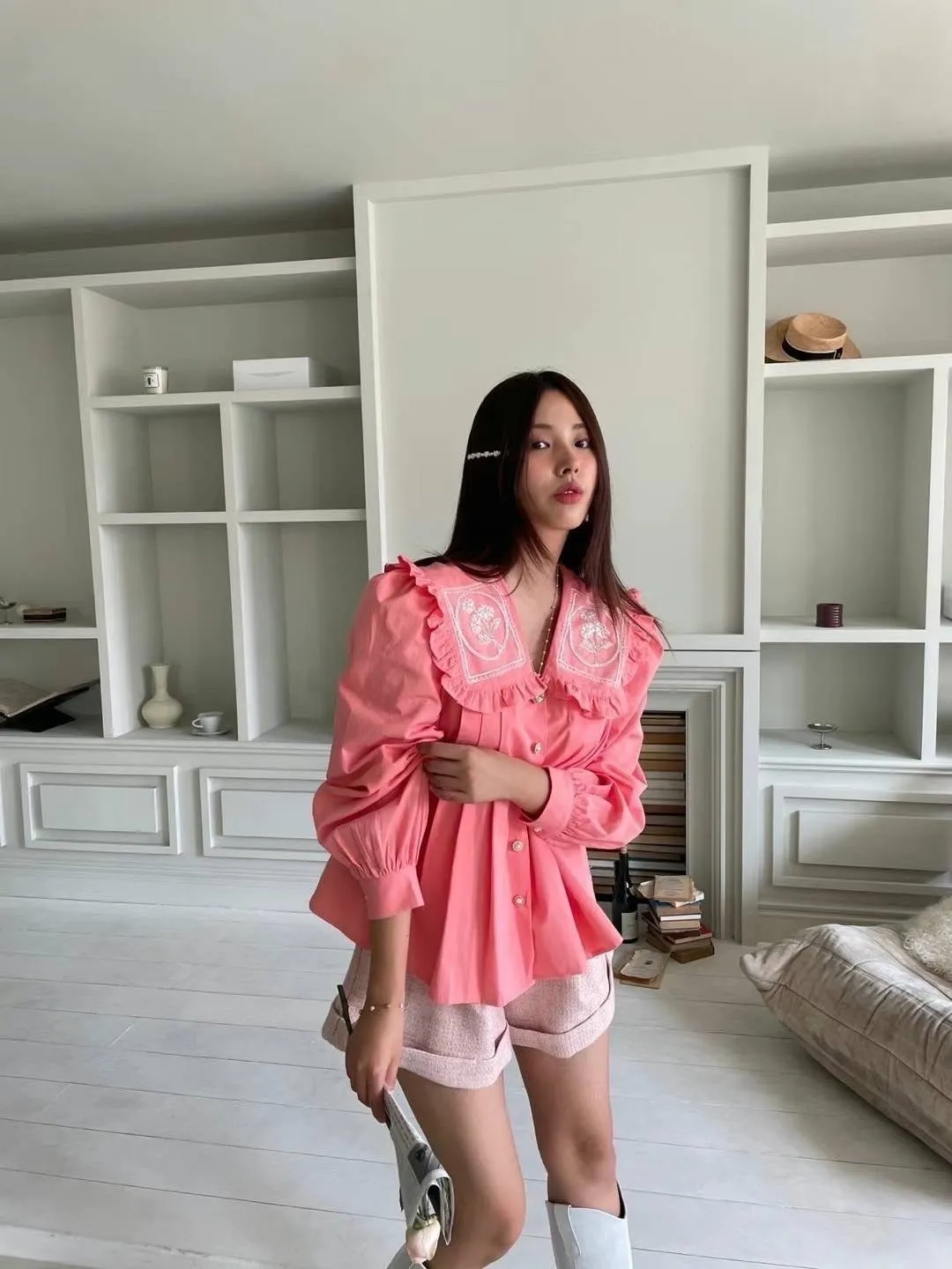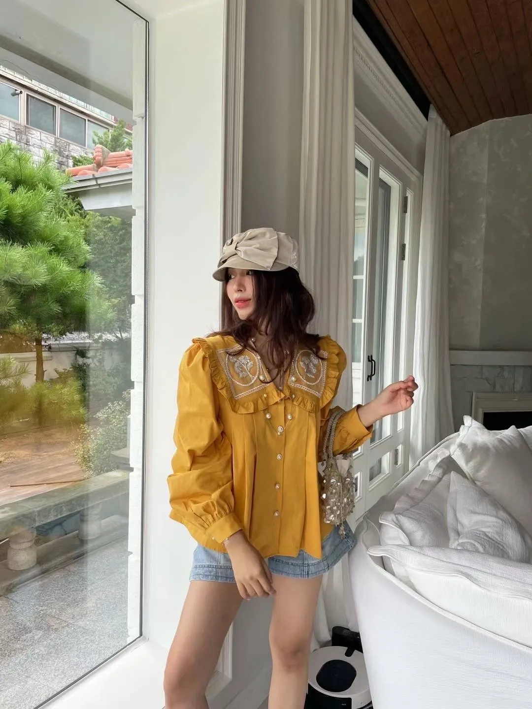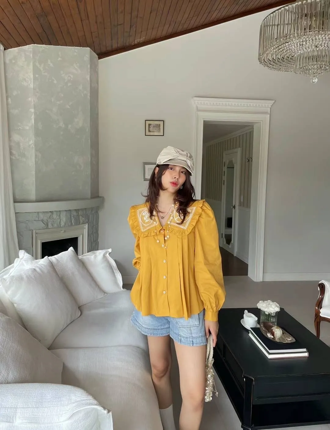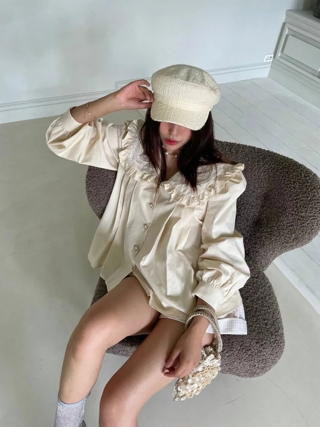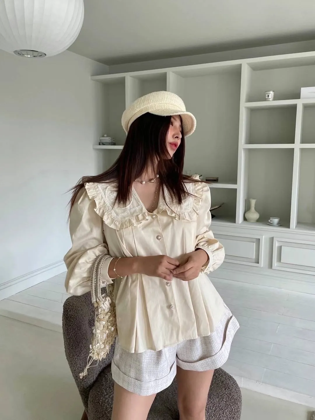 棉 荷葉領 精緻閃耀刺繡 珍珠釦穿脫 袖口有釦 空間寬鬆