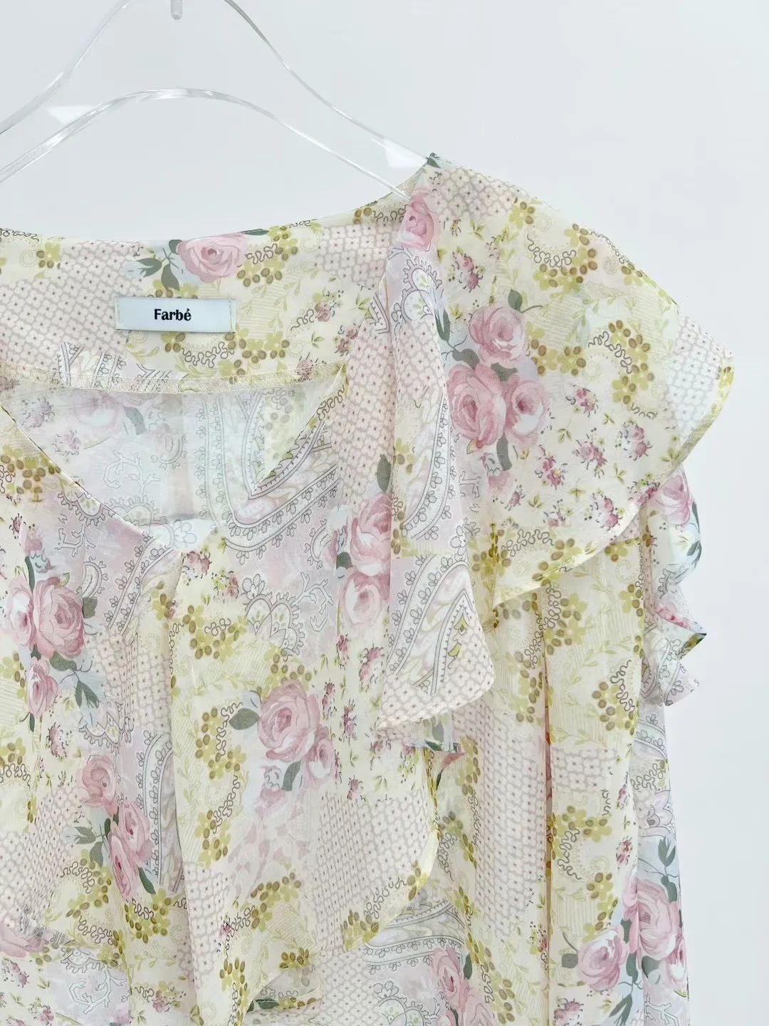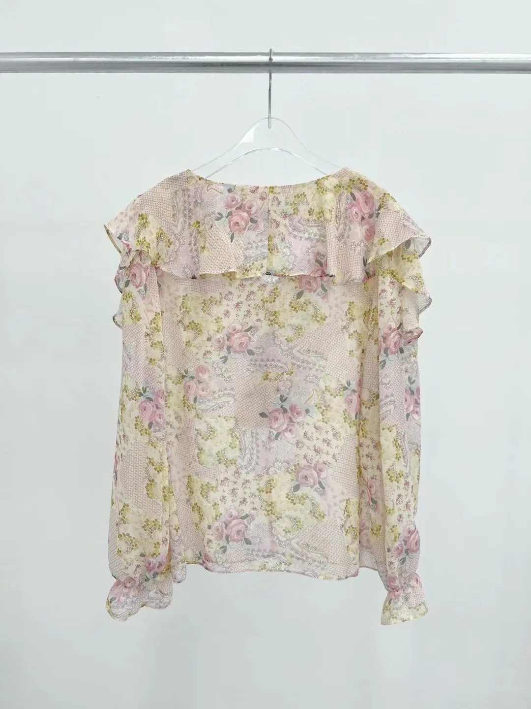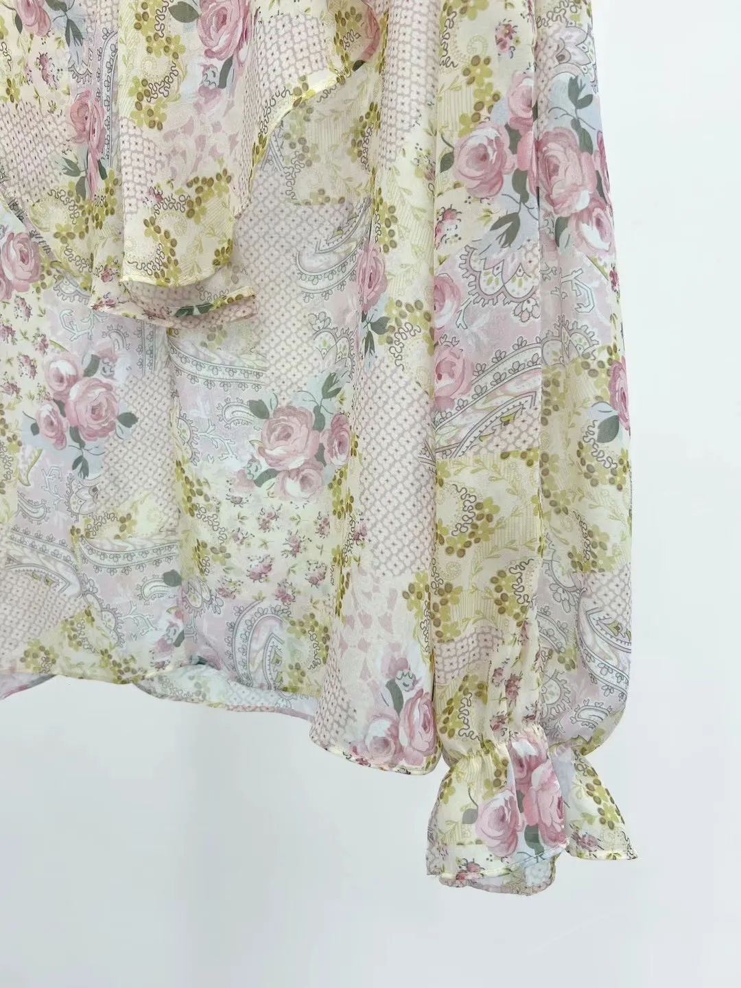 雪紡 絲巾花色 袖口彈性 飄逸荷葉領 輕盈透光 夏天合適