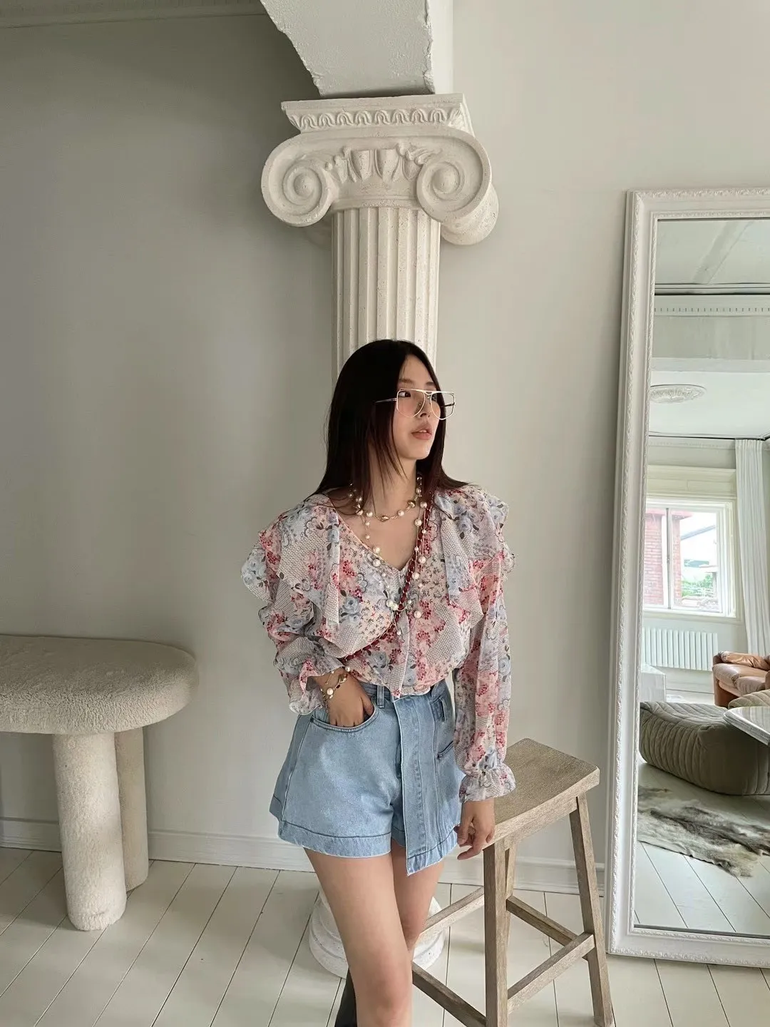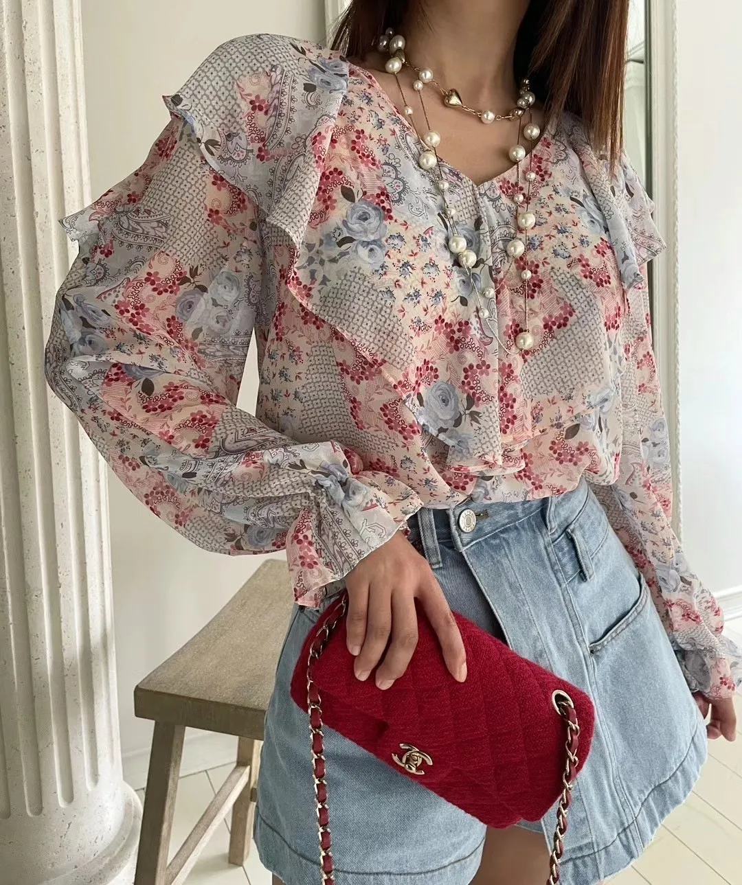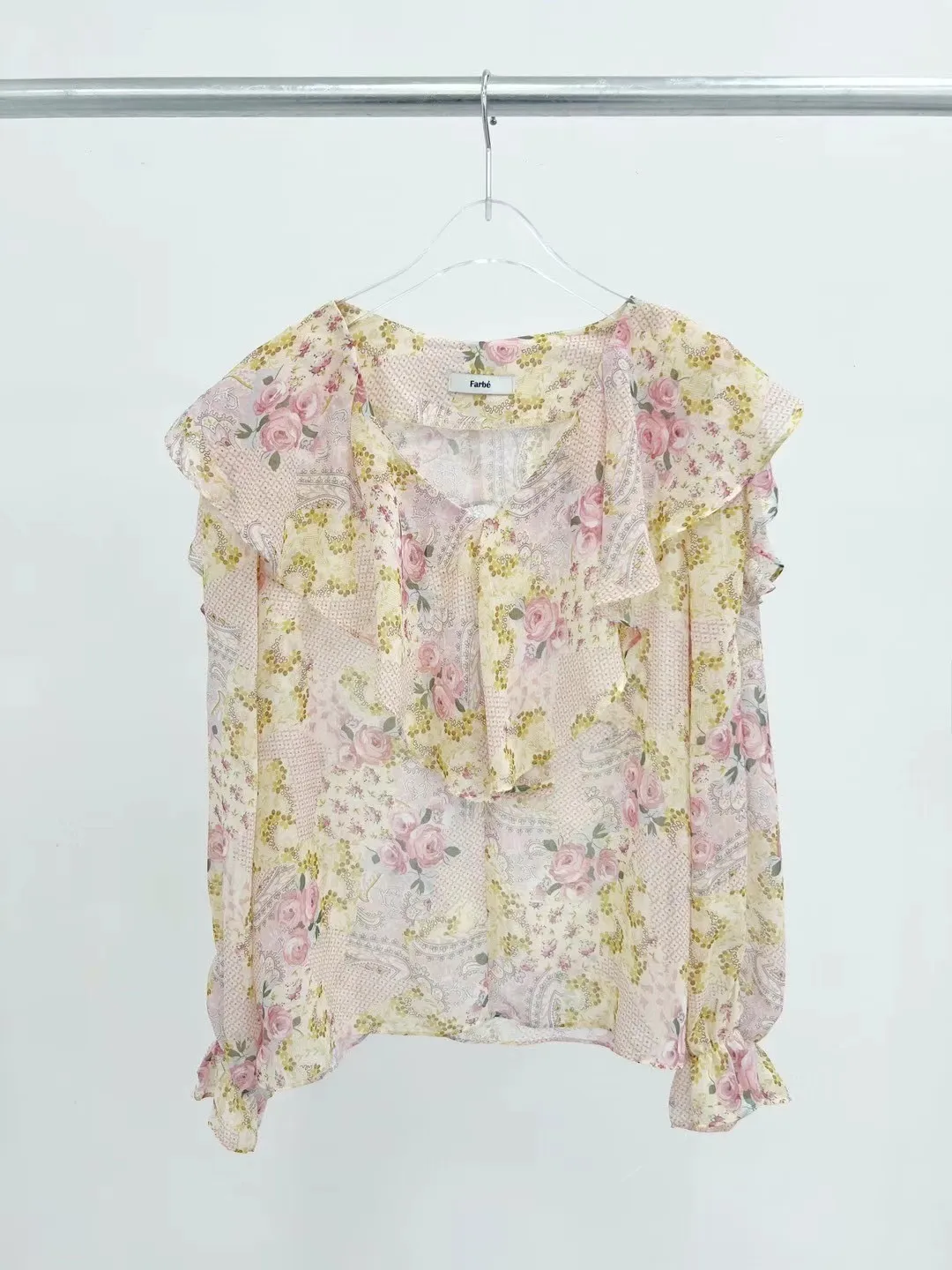 雪紡 絲巾花色 袖口彈性 飄逸荷葉領 輕盈透光 夏天合適