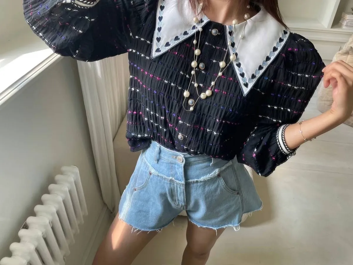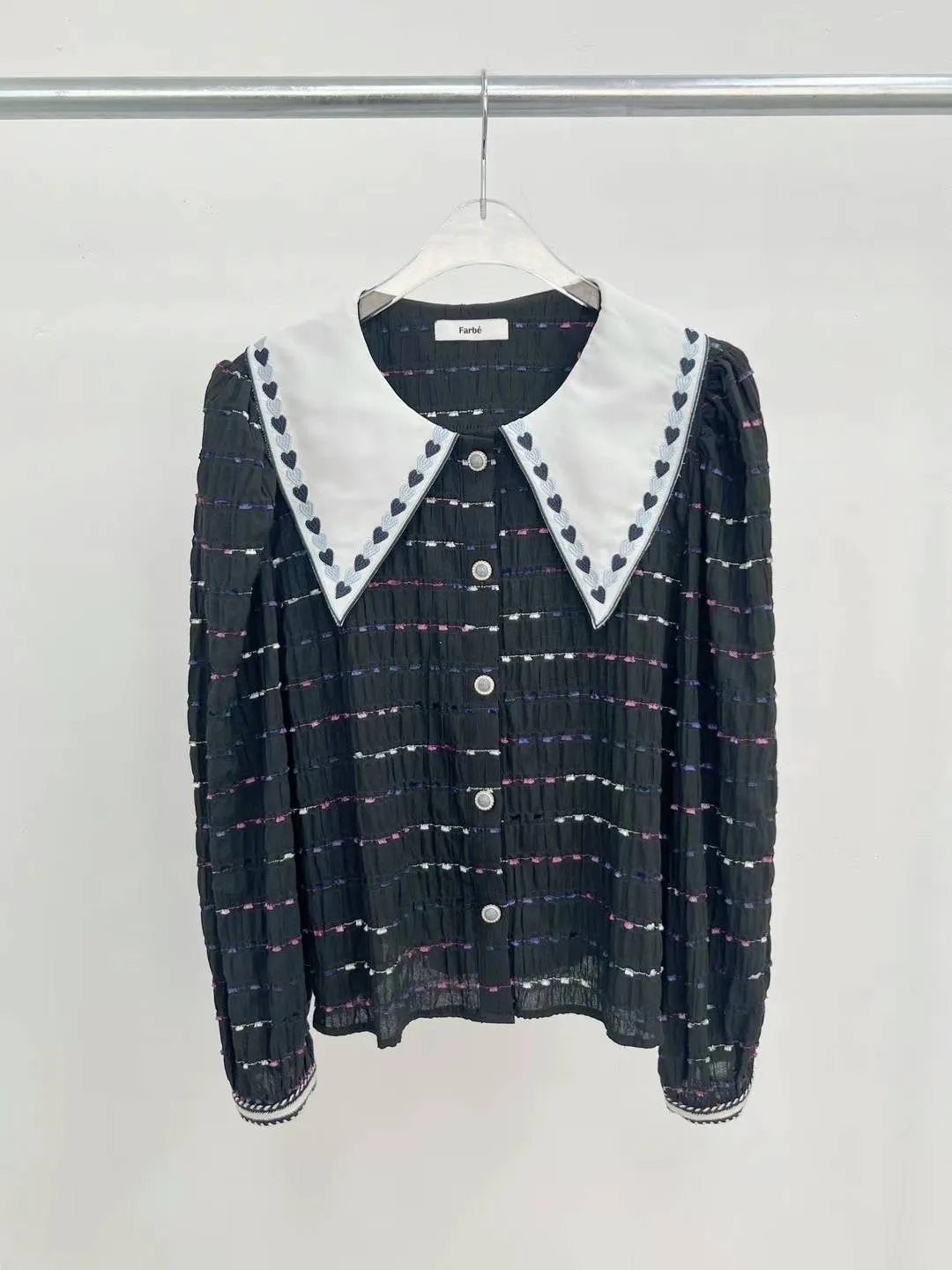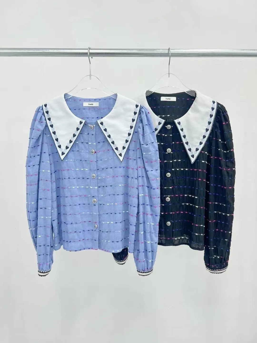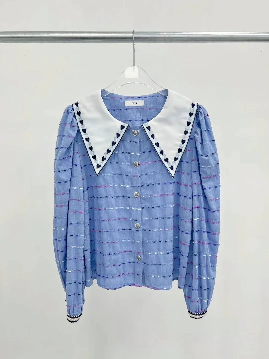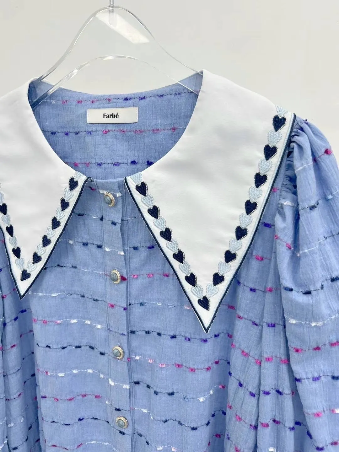 棉 刺繡銀邊愛心翻領 跳色立體車線 寶石金邊釦