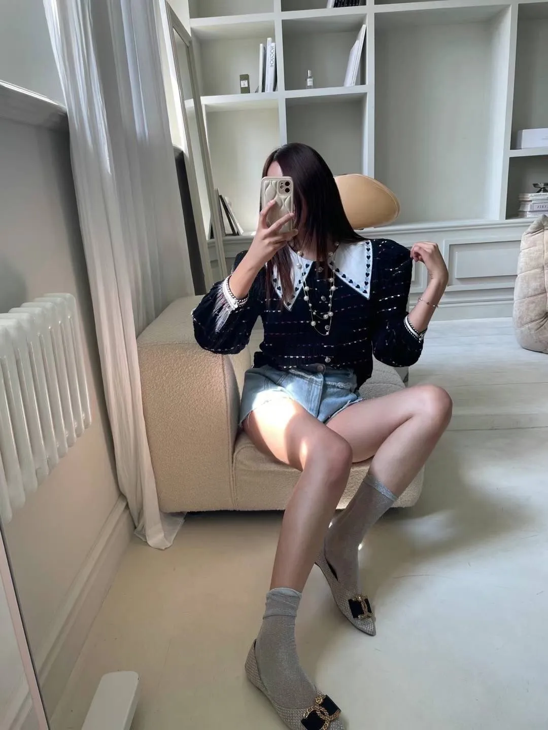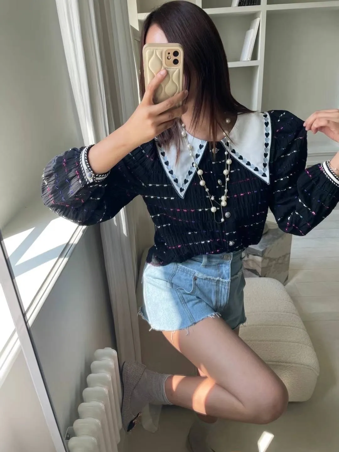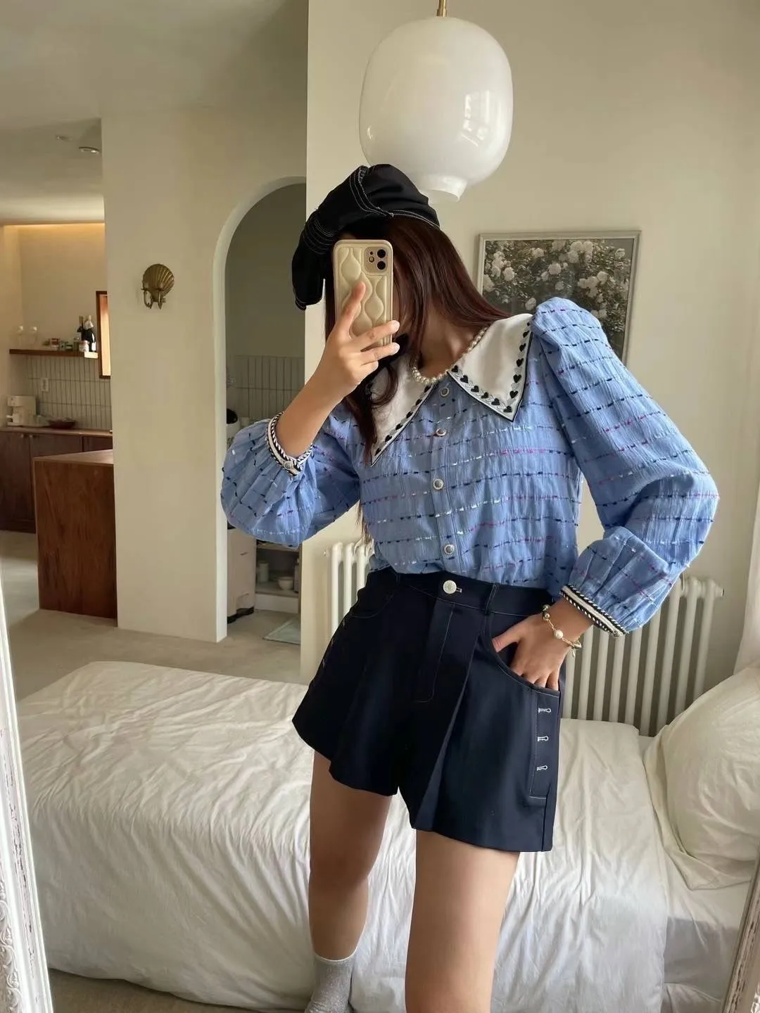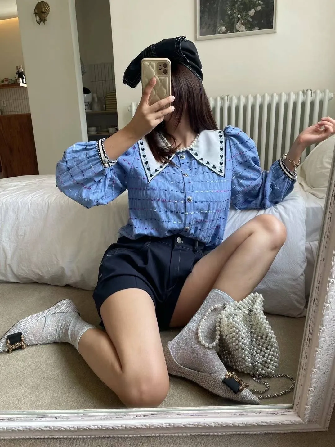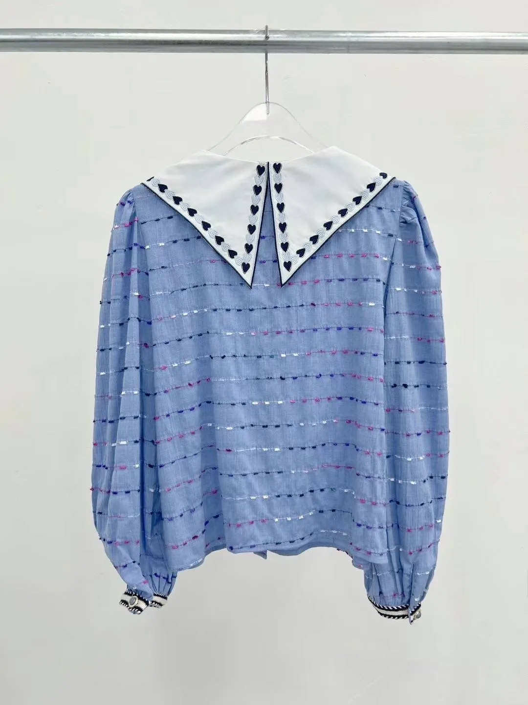 棉 刺繡銀邊愛心翻領 跳色立體車線 寶石金邊釦