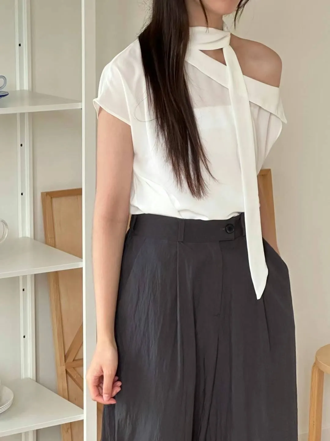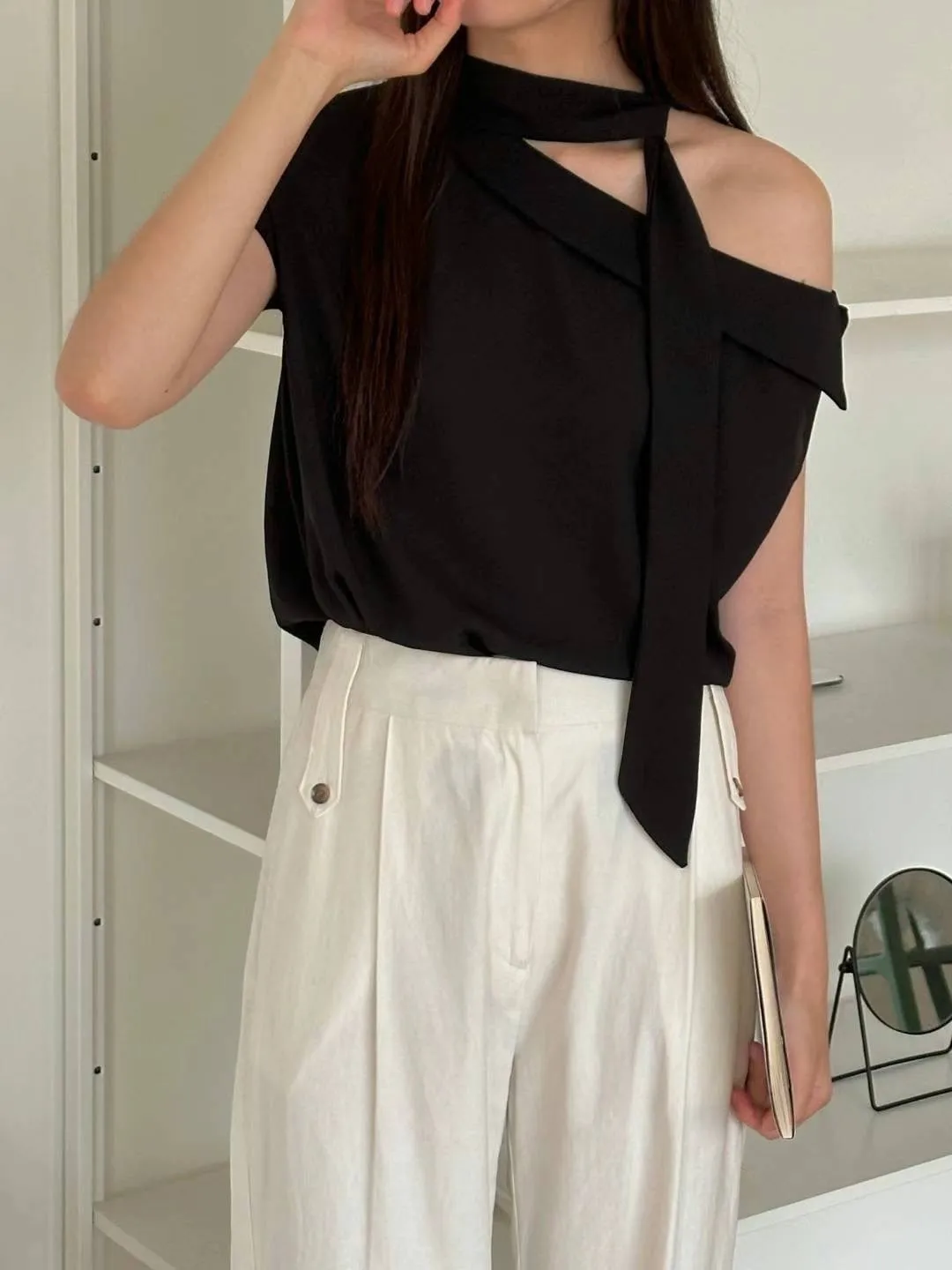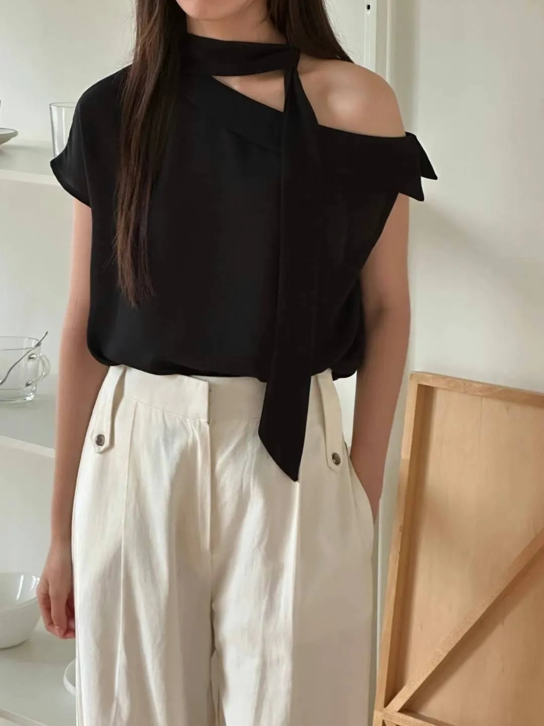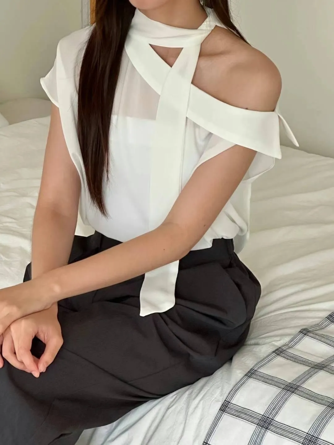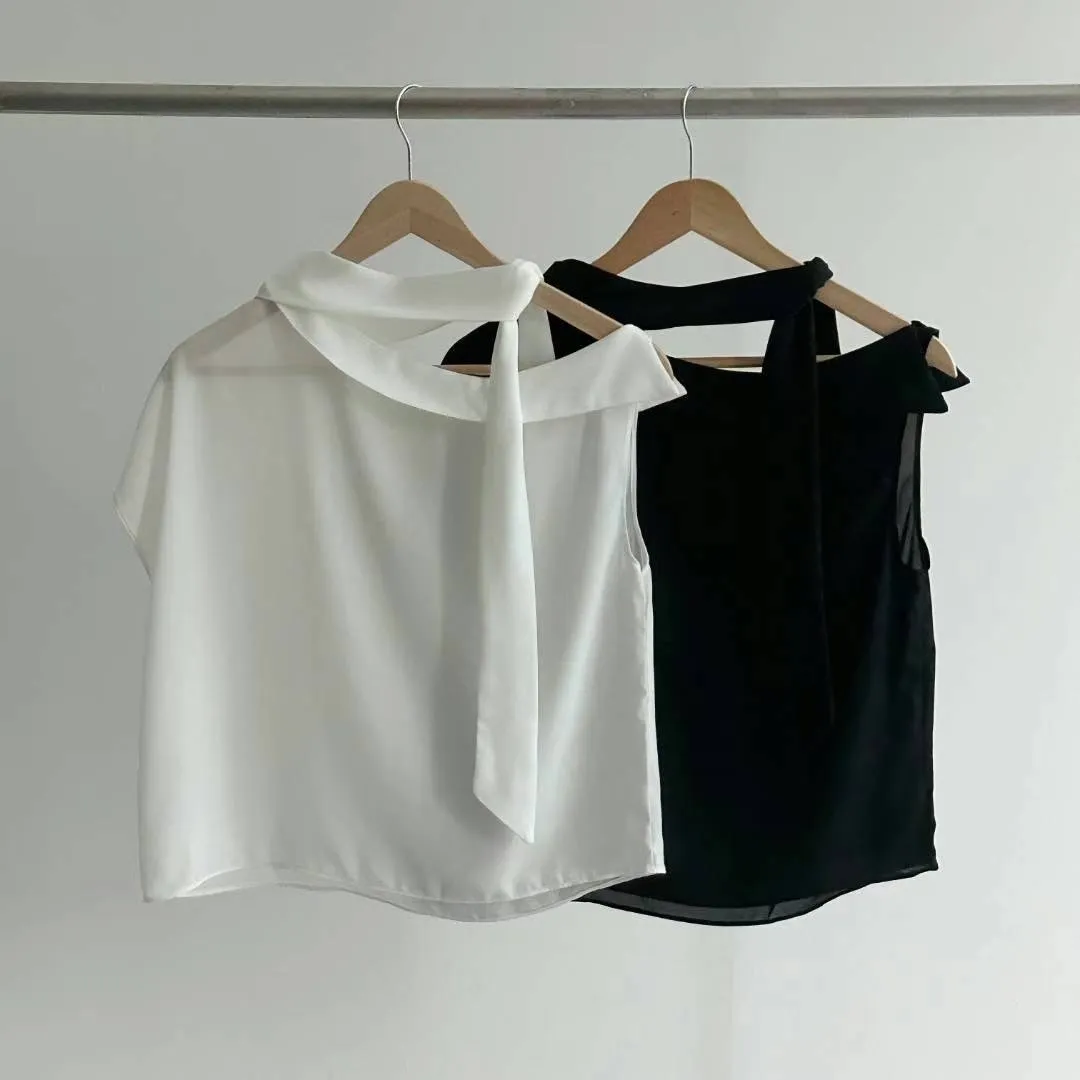 雪紡 薄款輕盈 設計造型綁帶 船型寬領