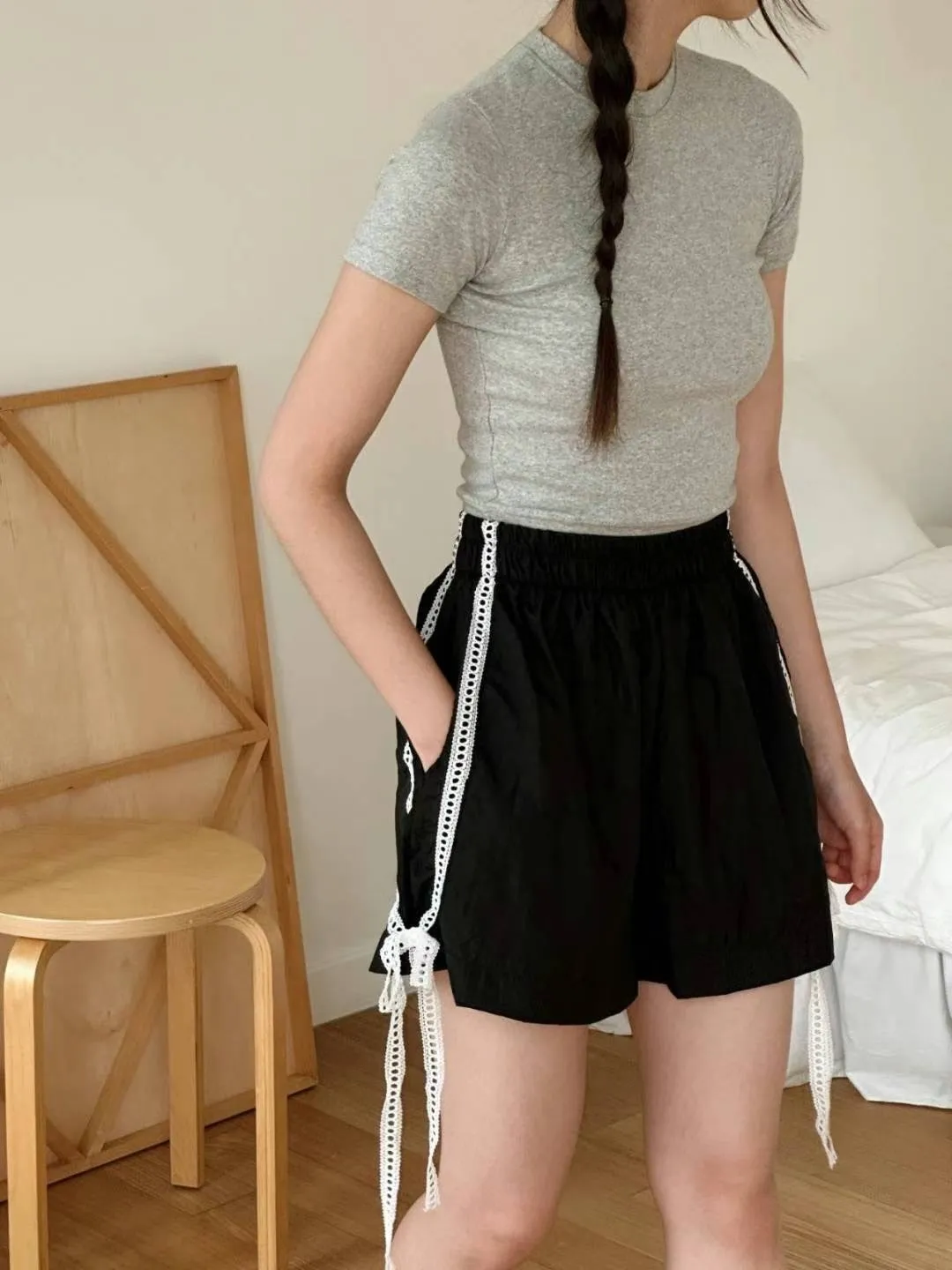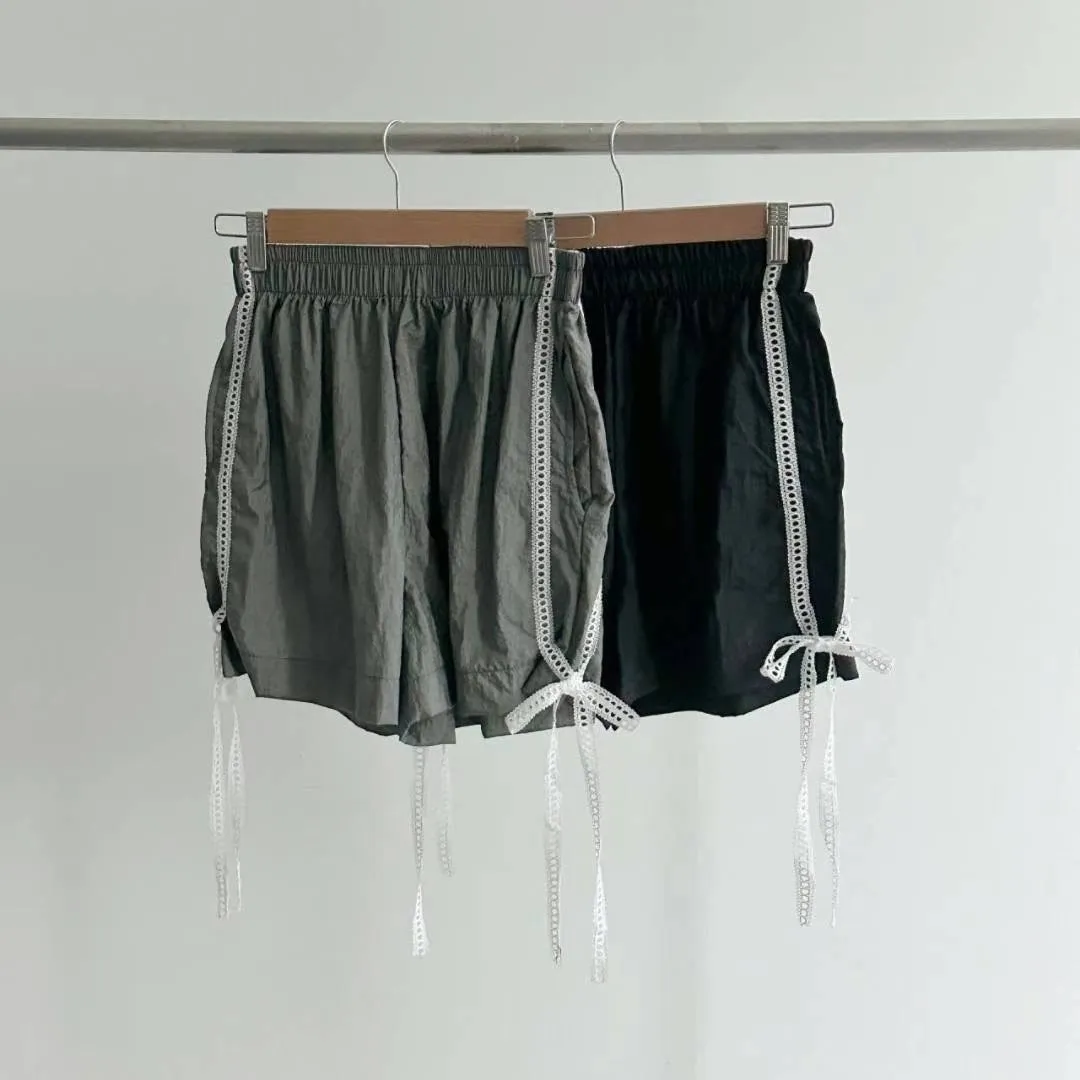 尼龍+蕾絲 薄款輕盈 微光澤 全腰鬆緊 側蕾絲綁帶 有口袋