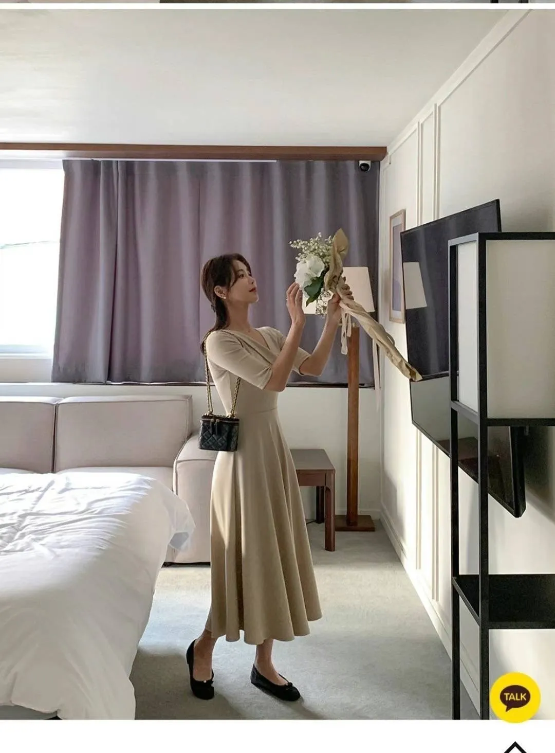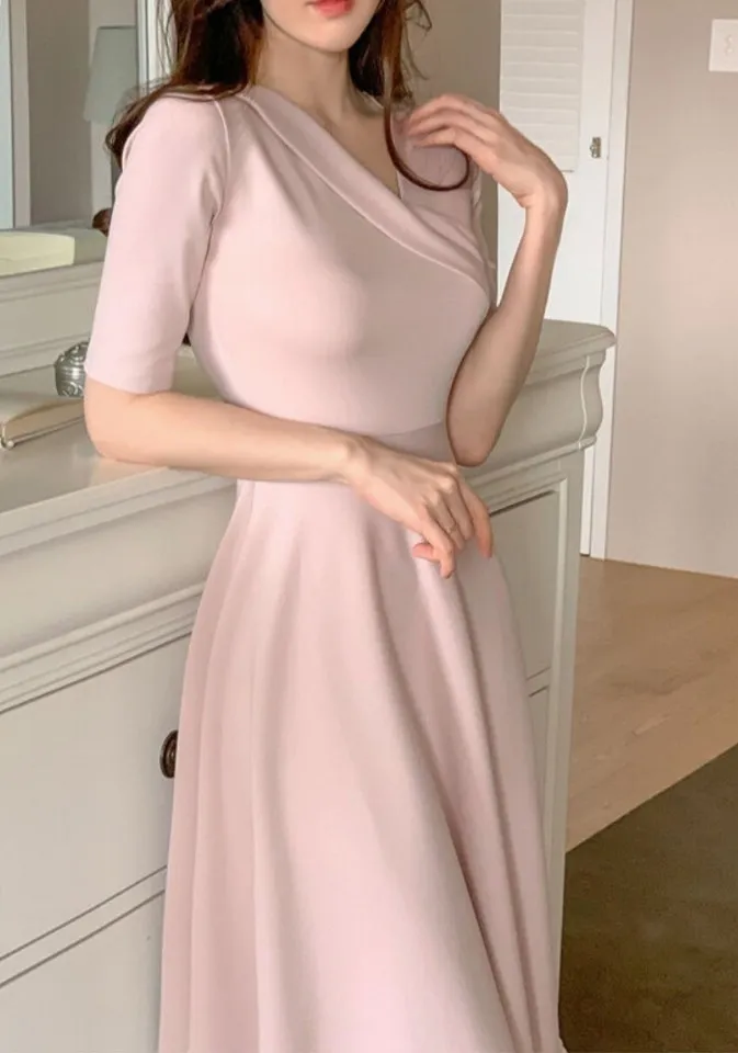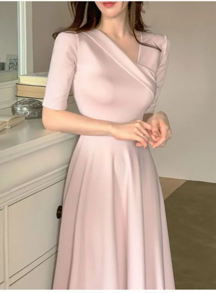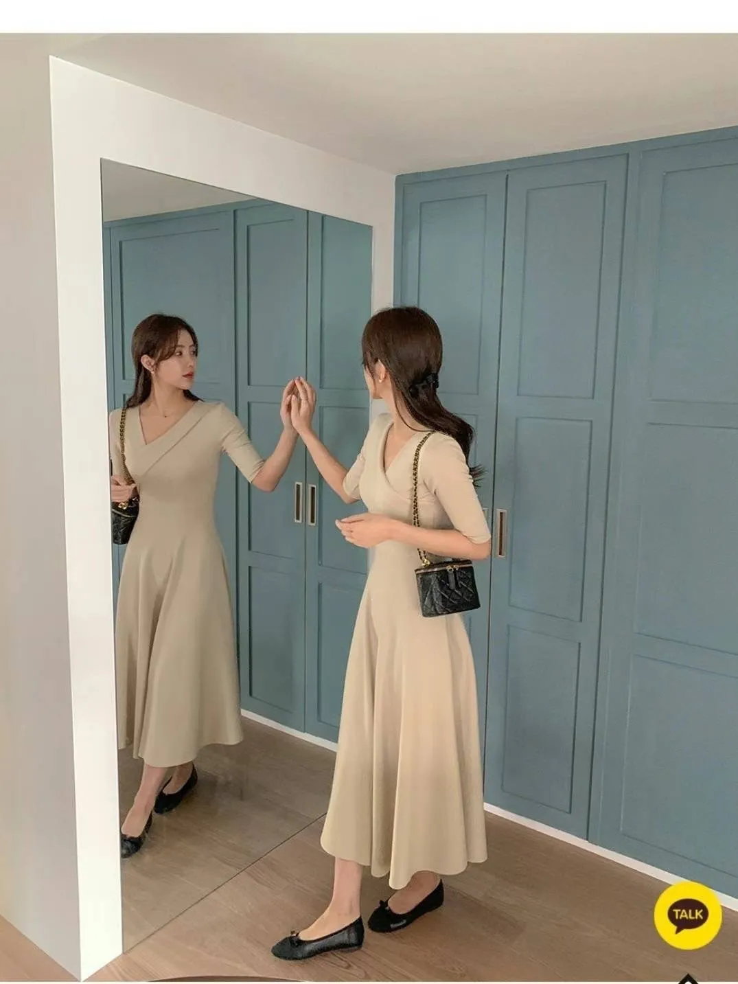 棉+彈力 體感舒適有彈性 不對稱側V領 傘擺美裙