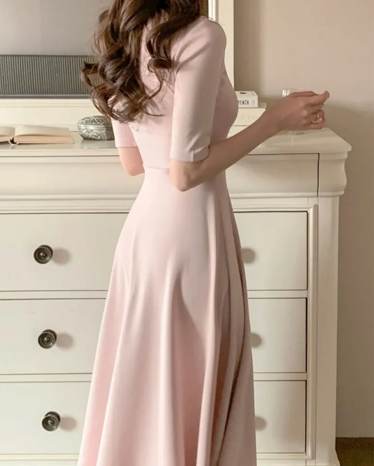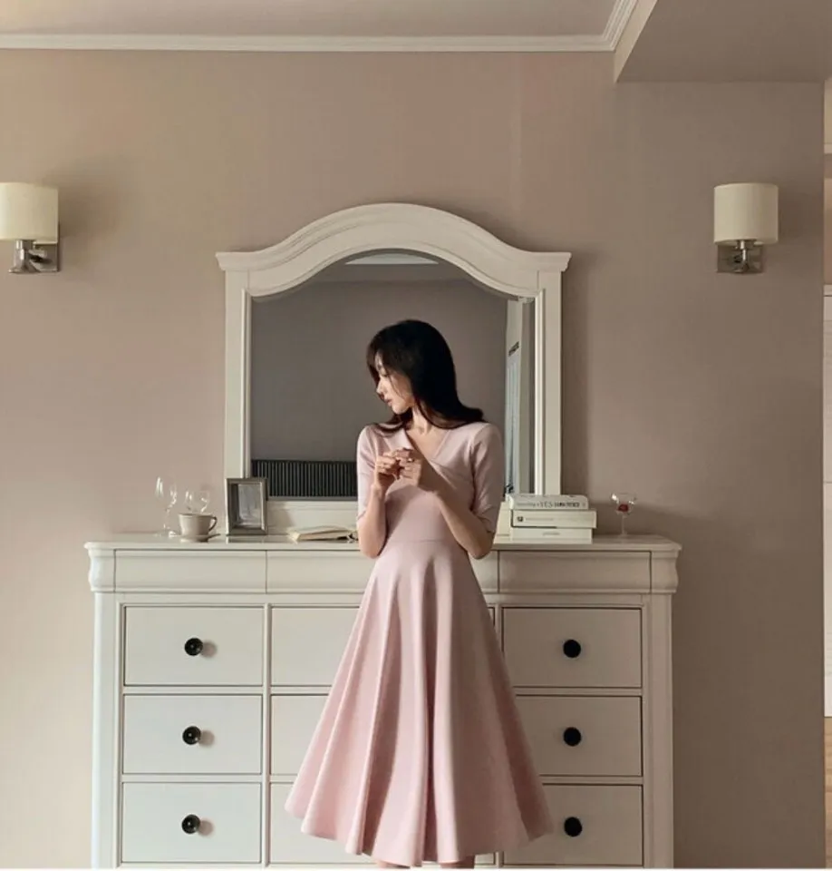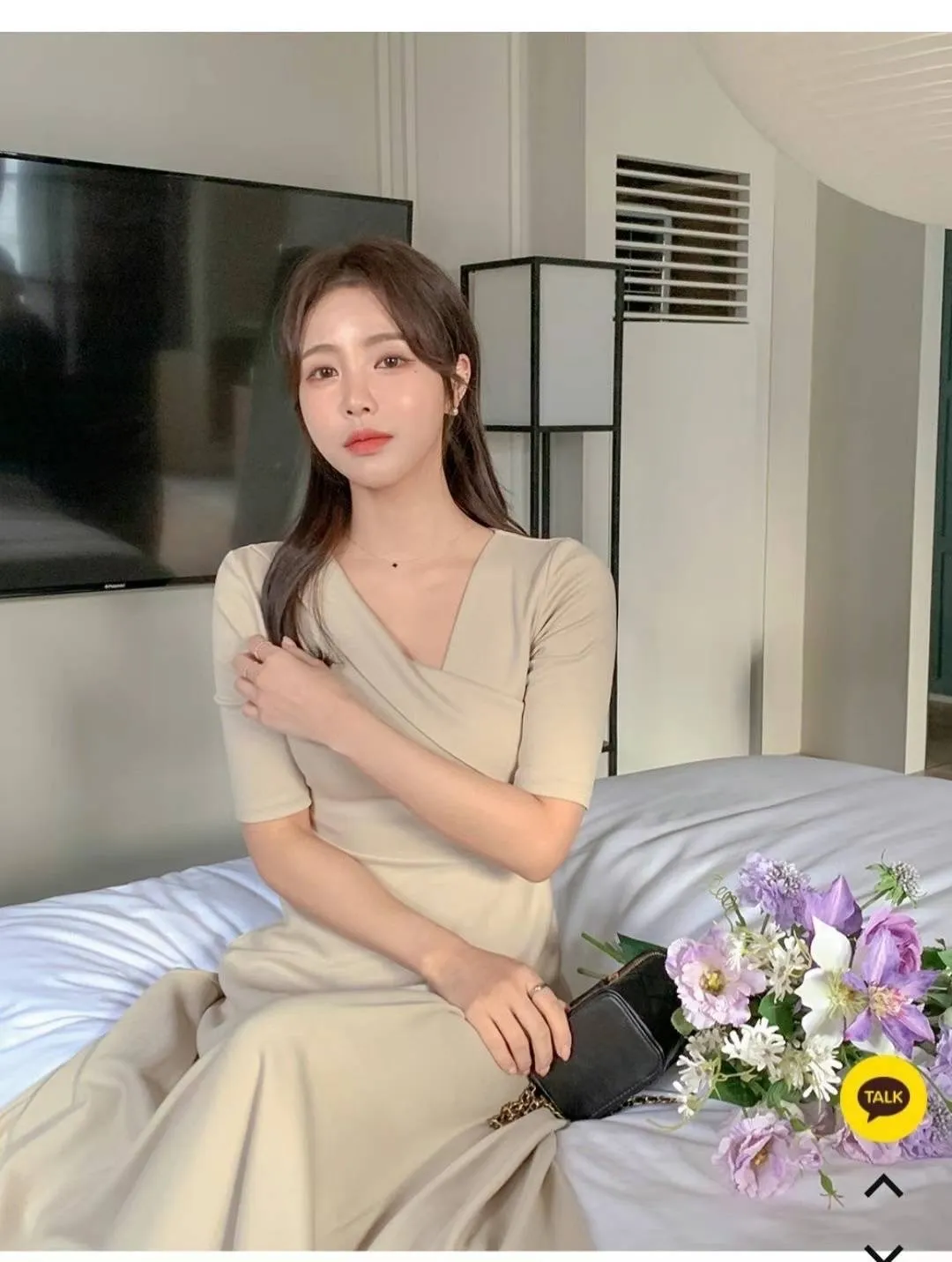棉+彈力 體感舒適有彈性 不對稱側V領 傘擺美裙