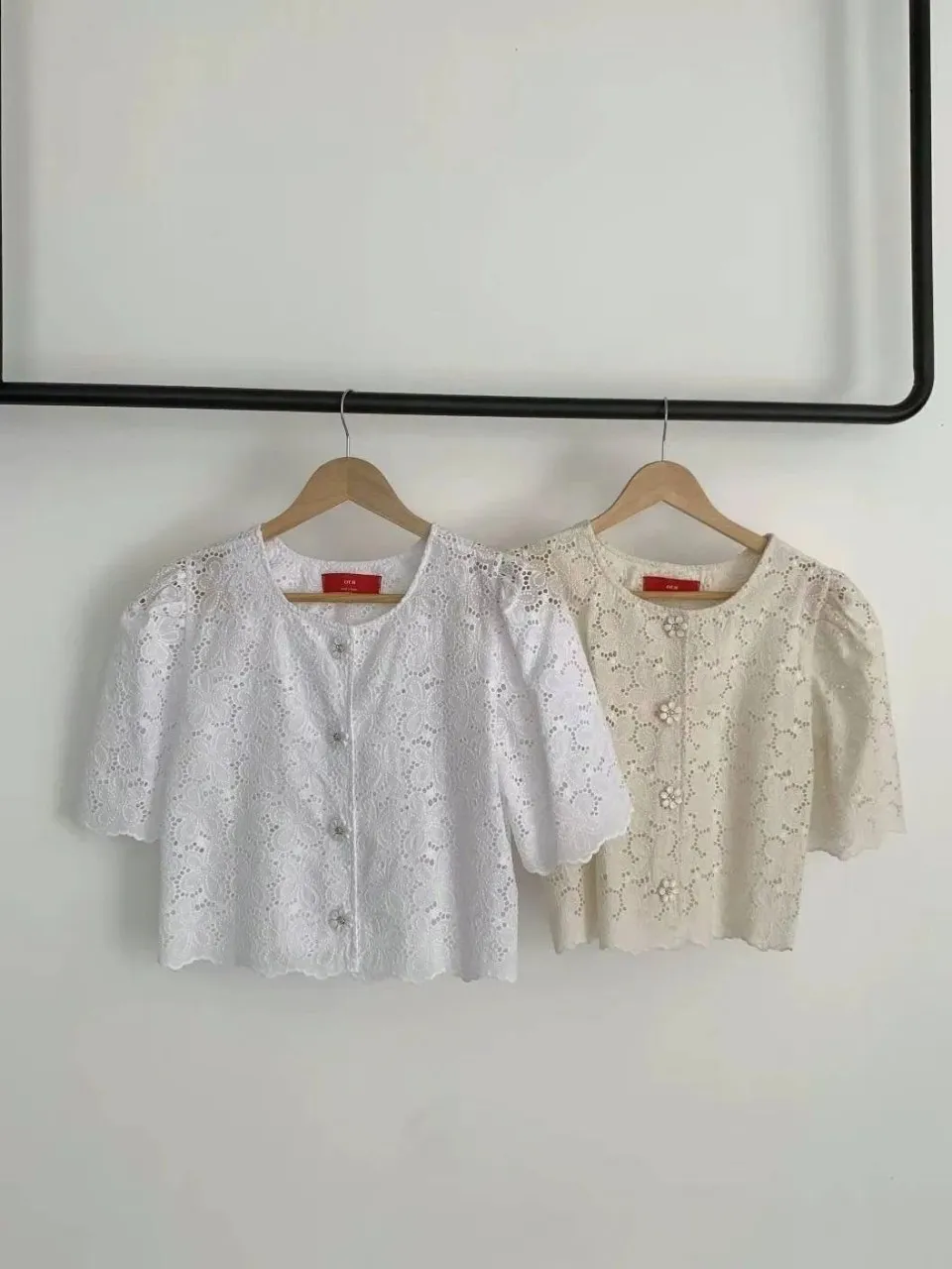 FA383棉蕾絲小雛菊釦短版上衣 白 米 官網價$1050 線上價$1020