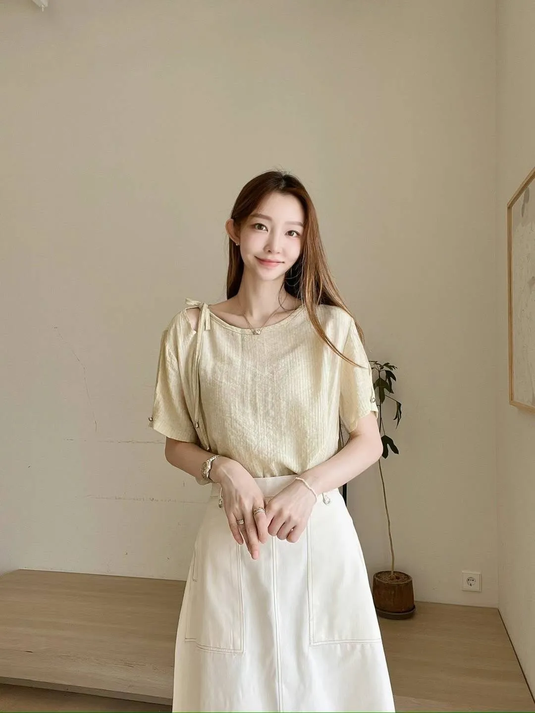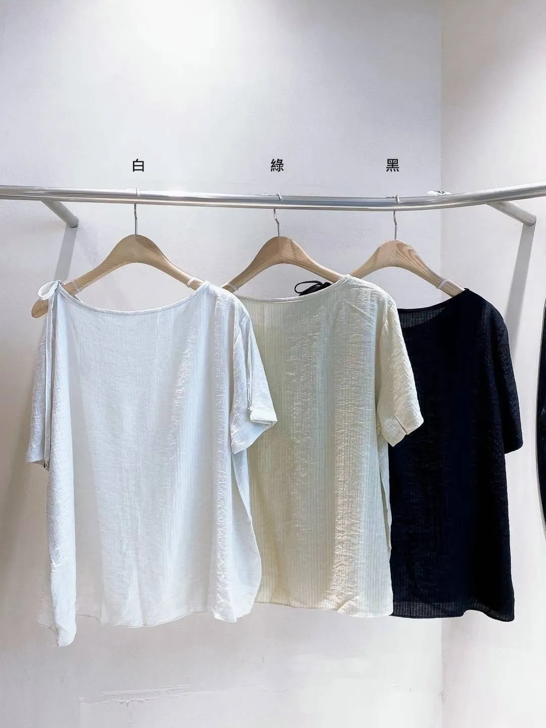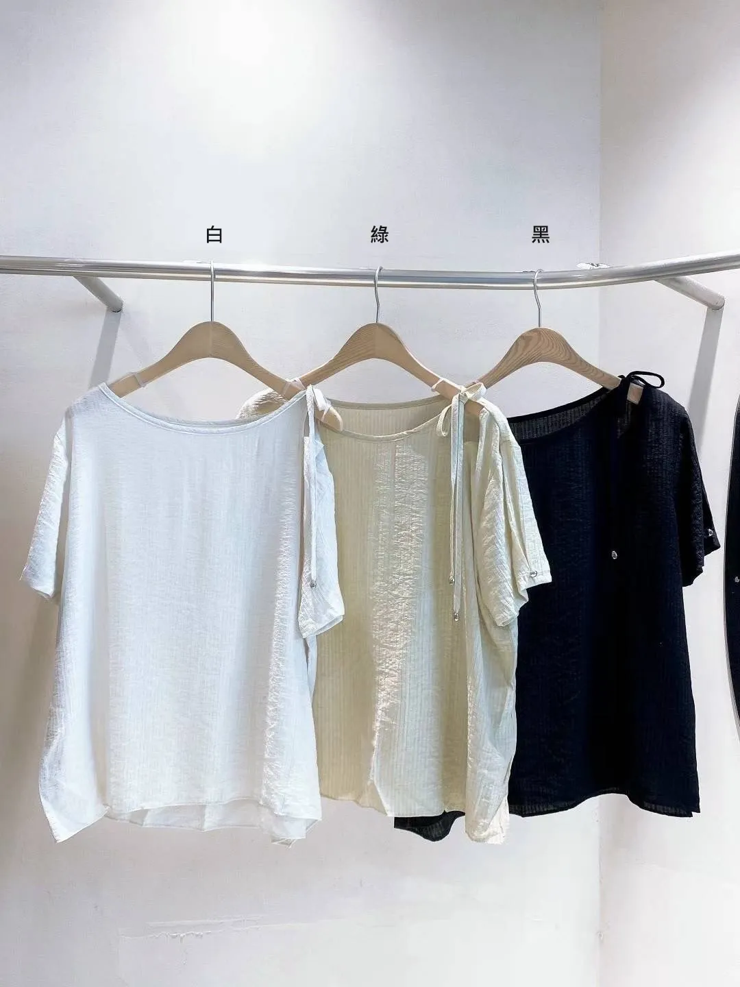 人造絲+尼龍 涼感舒適 寬U領顯瘦 單肩綁帶小簍空 L號友善