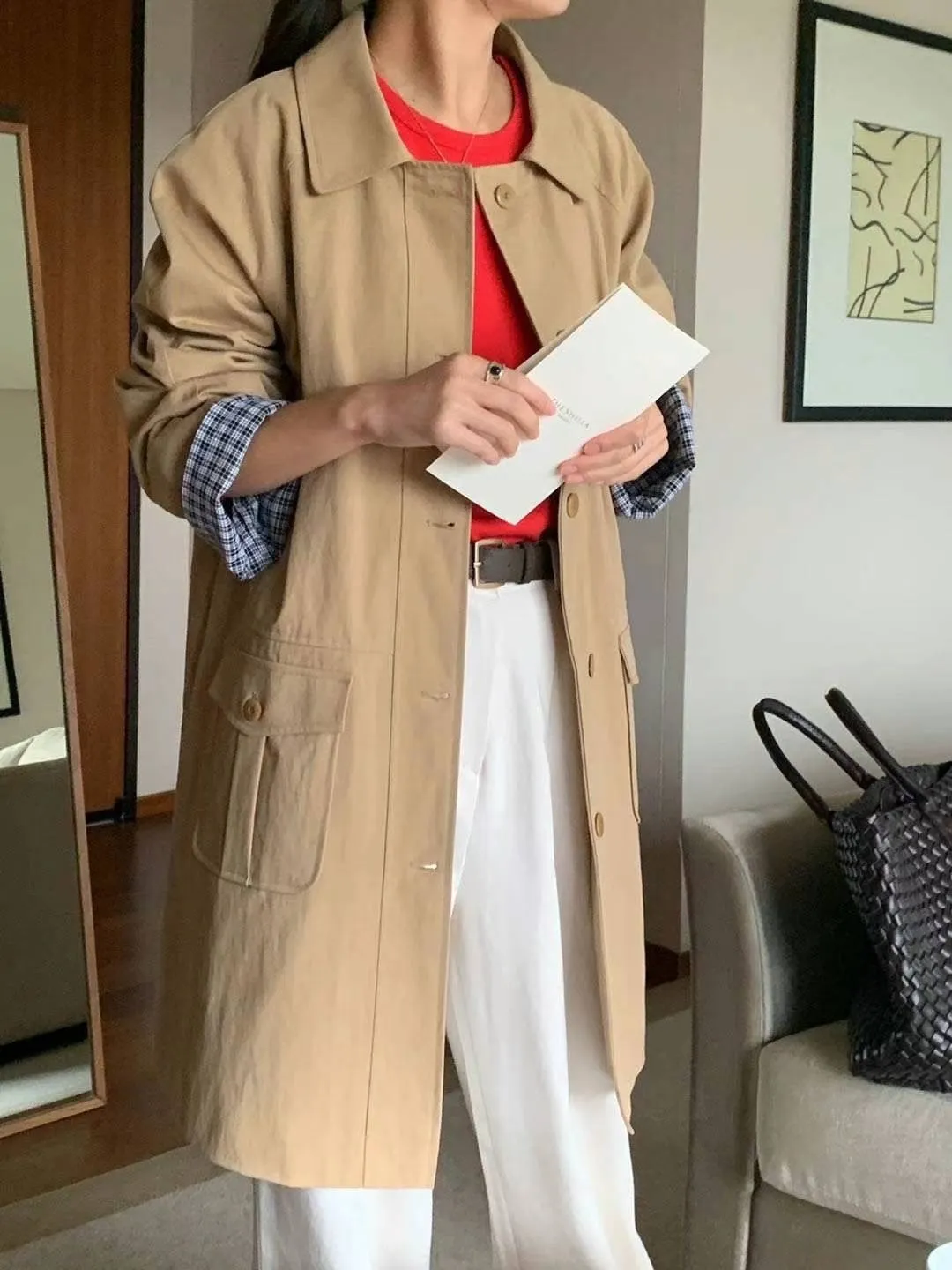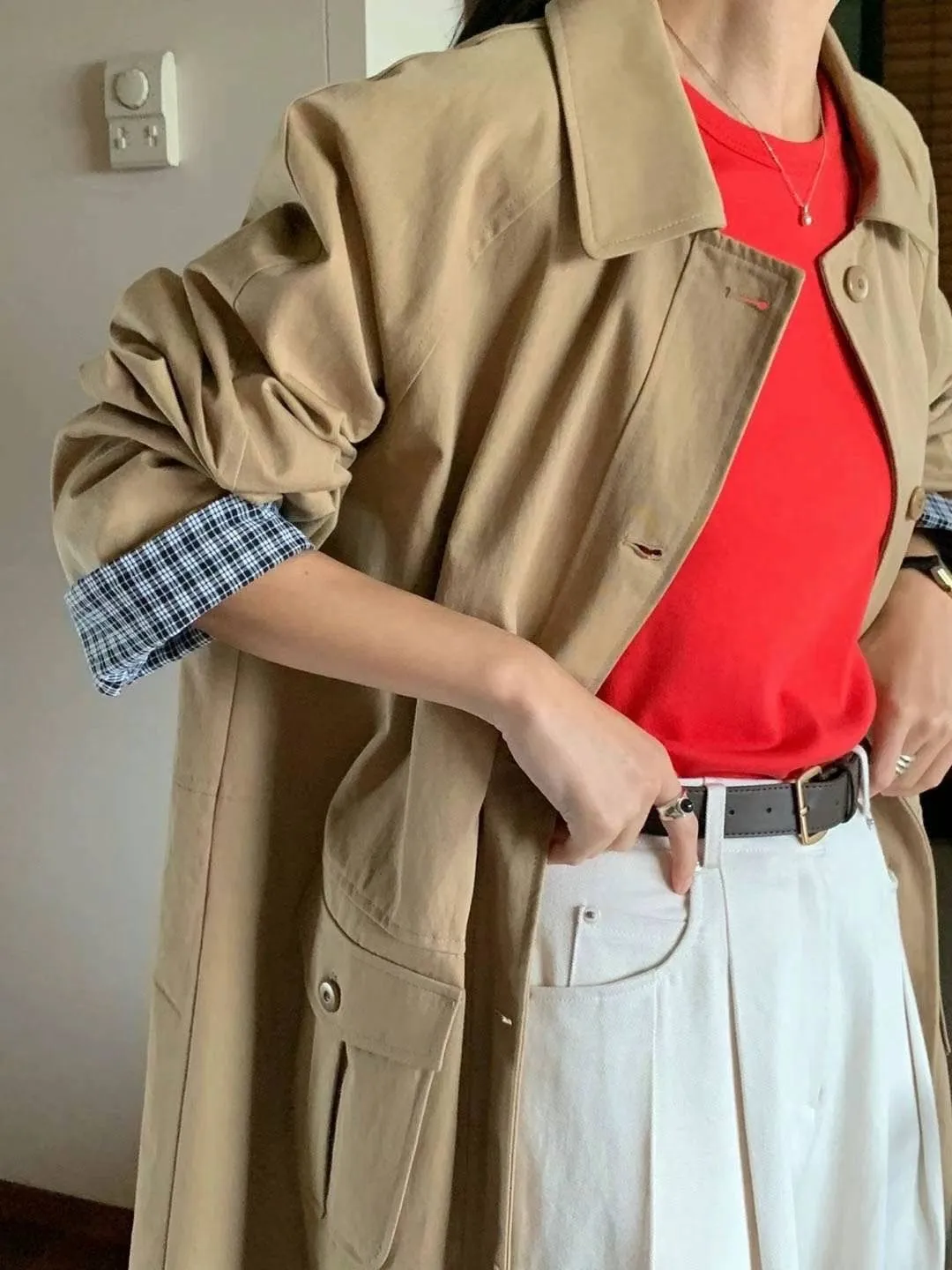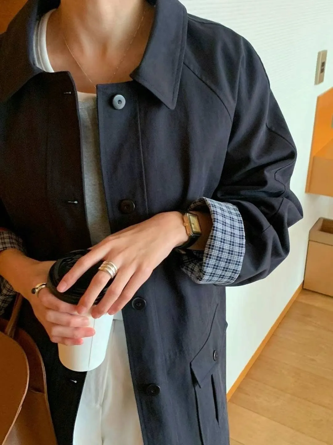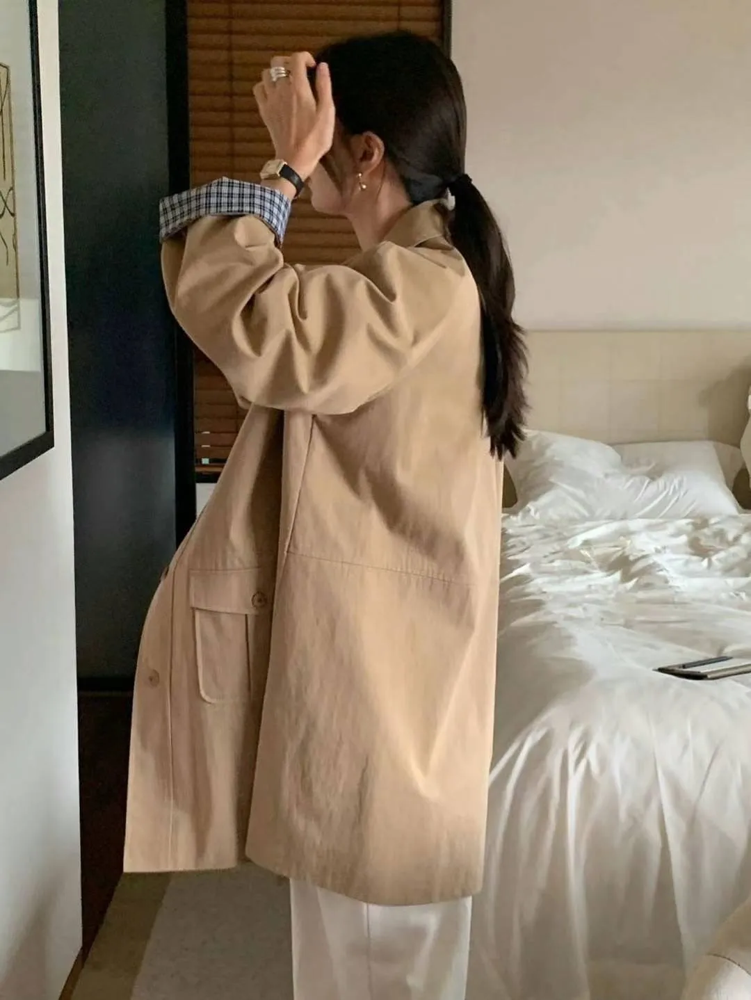 棉 格紋內裡 手袖可外翻設計 有口袋 輕盈不厚重 秋天款