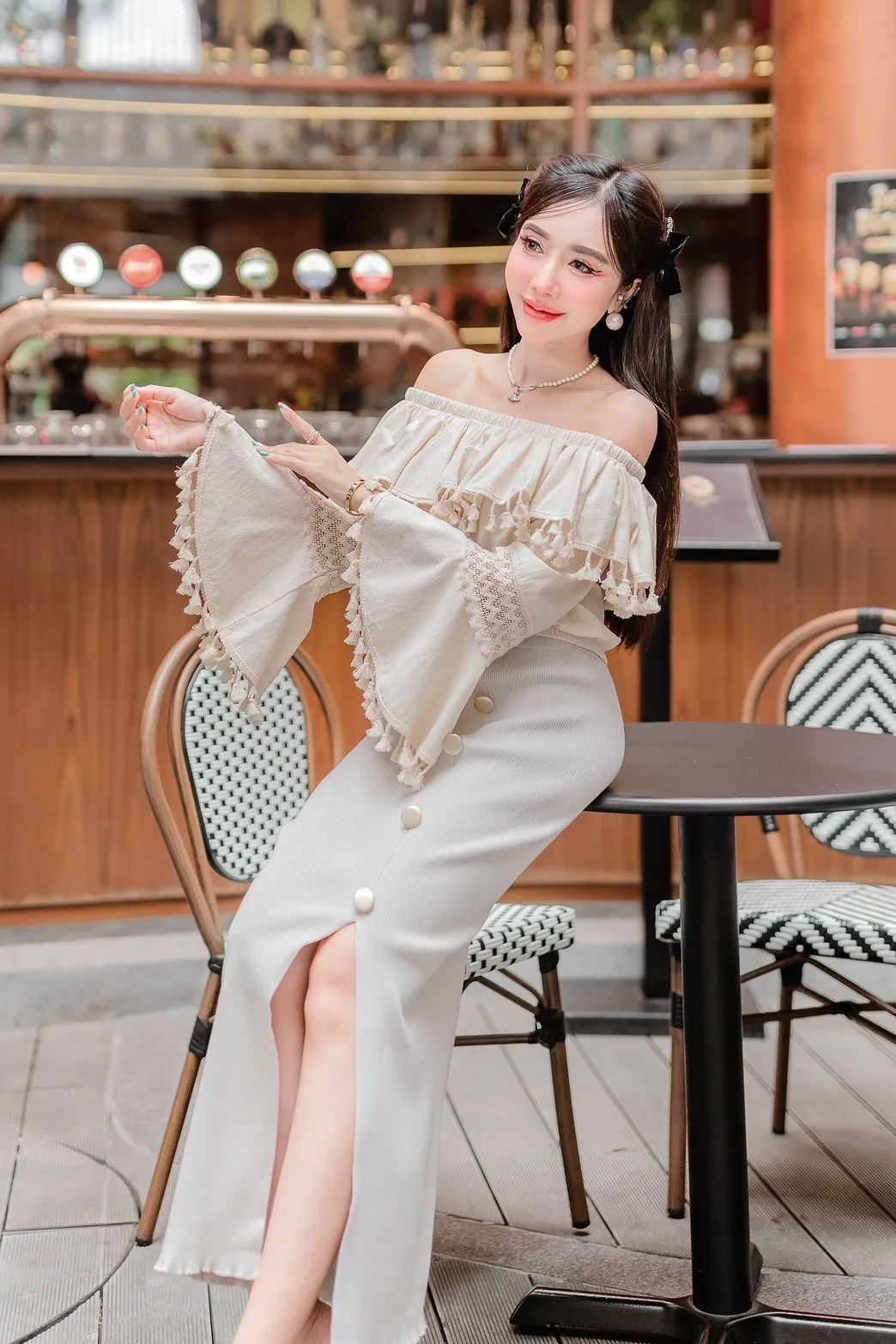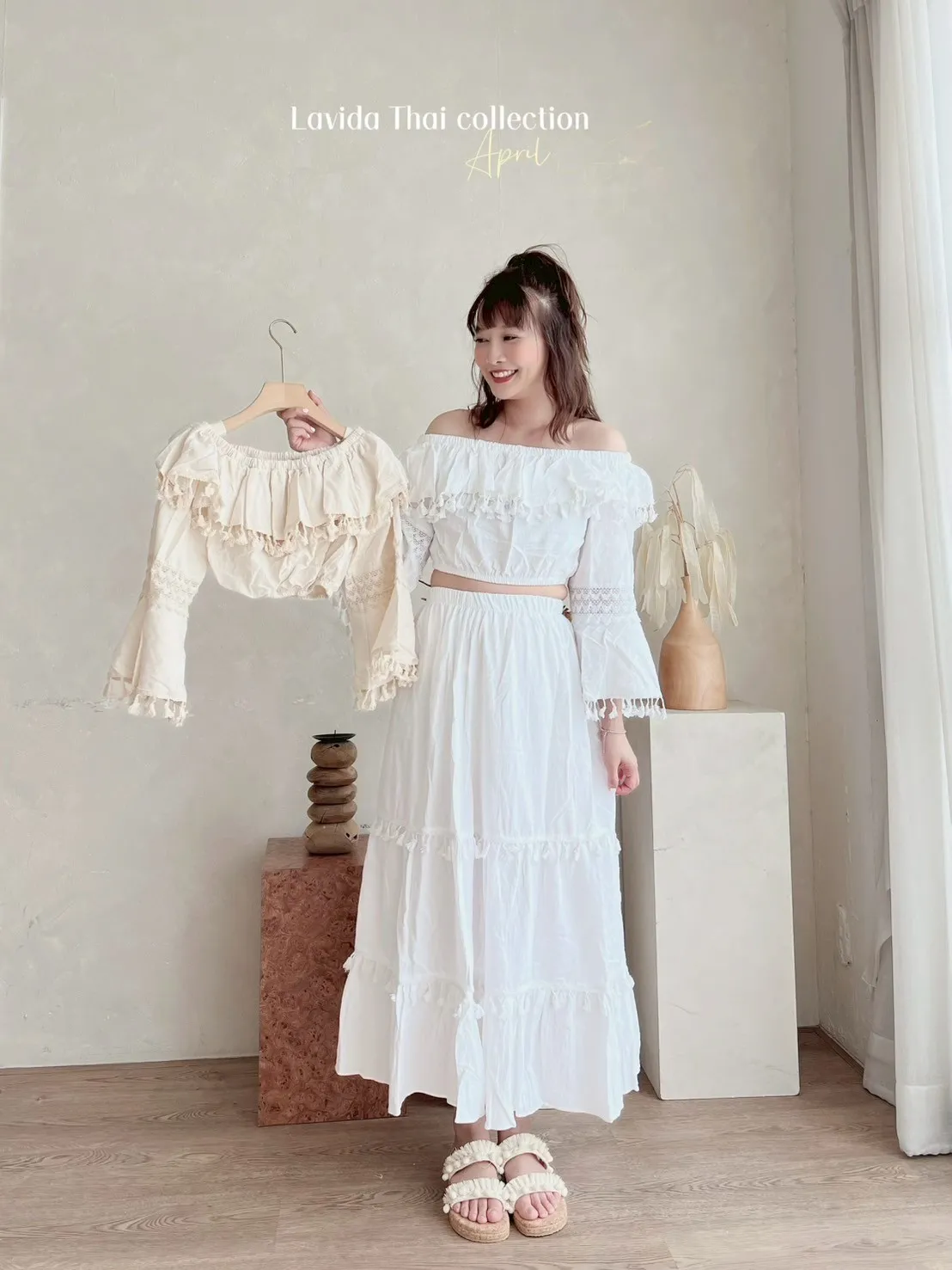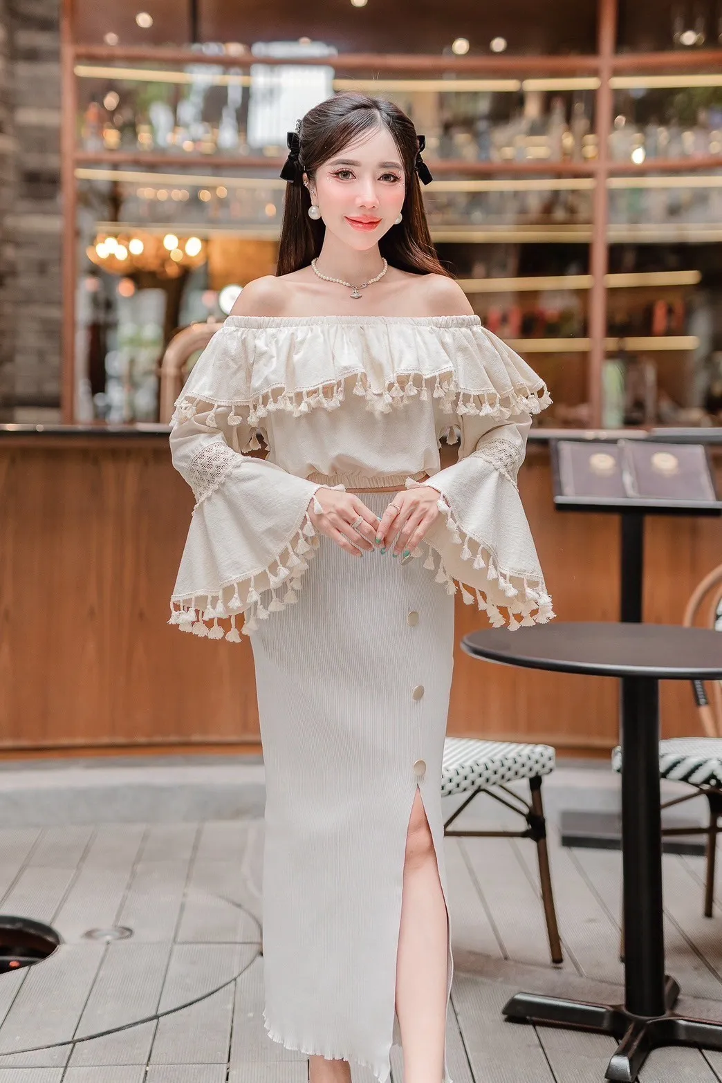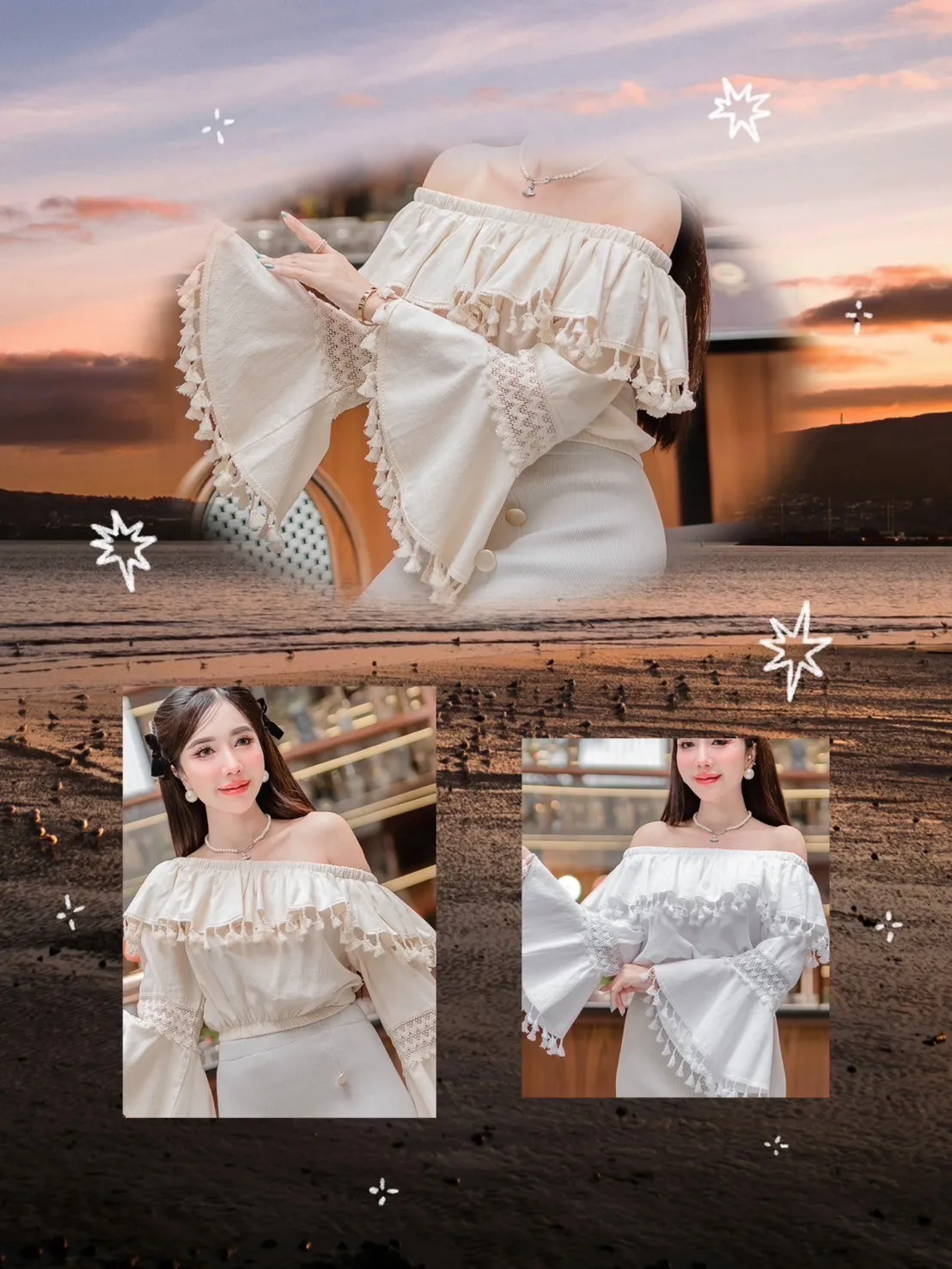 FC247小流蘇蕾絲寬長袖上衣 白 米 官網價$450 線上價$420 棉+亞麻 透氣舒適 寬袖藏肉 領口腰間有鬆緊 肩寬32-55胸寬52臂寬21袖長44袖口33全長33以下為米色穿搭 以下顏色,米>白