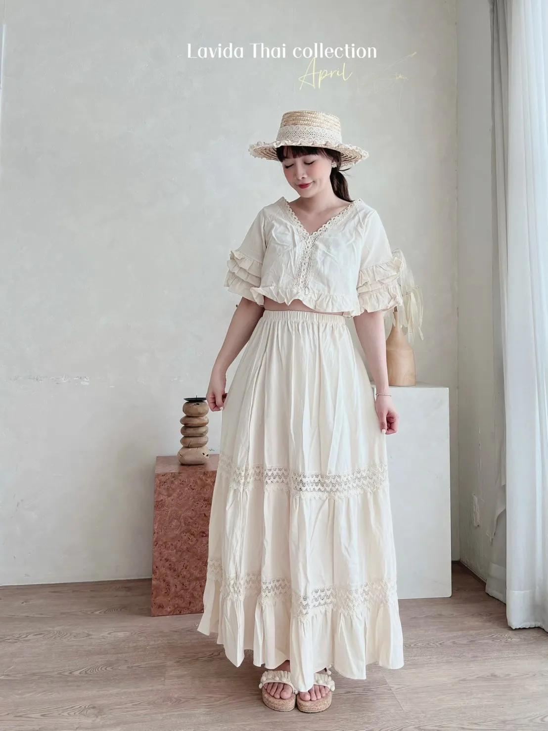 FC252蕾絲V領荷葉短袖上衣 白 米 官網價$420 線上價$390