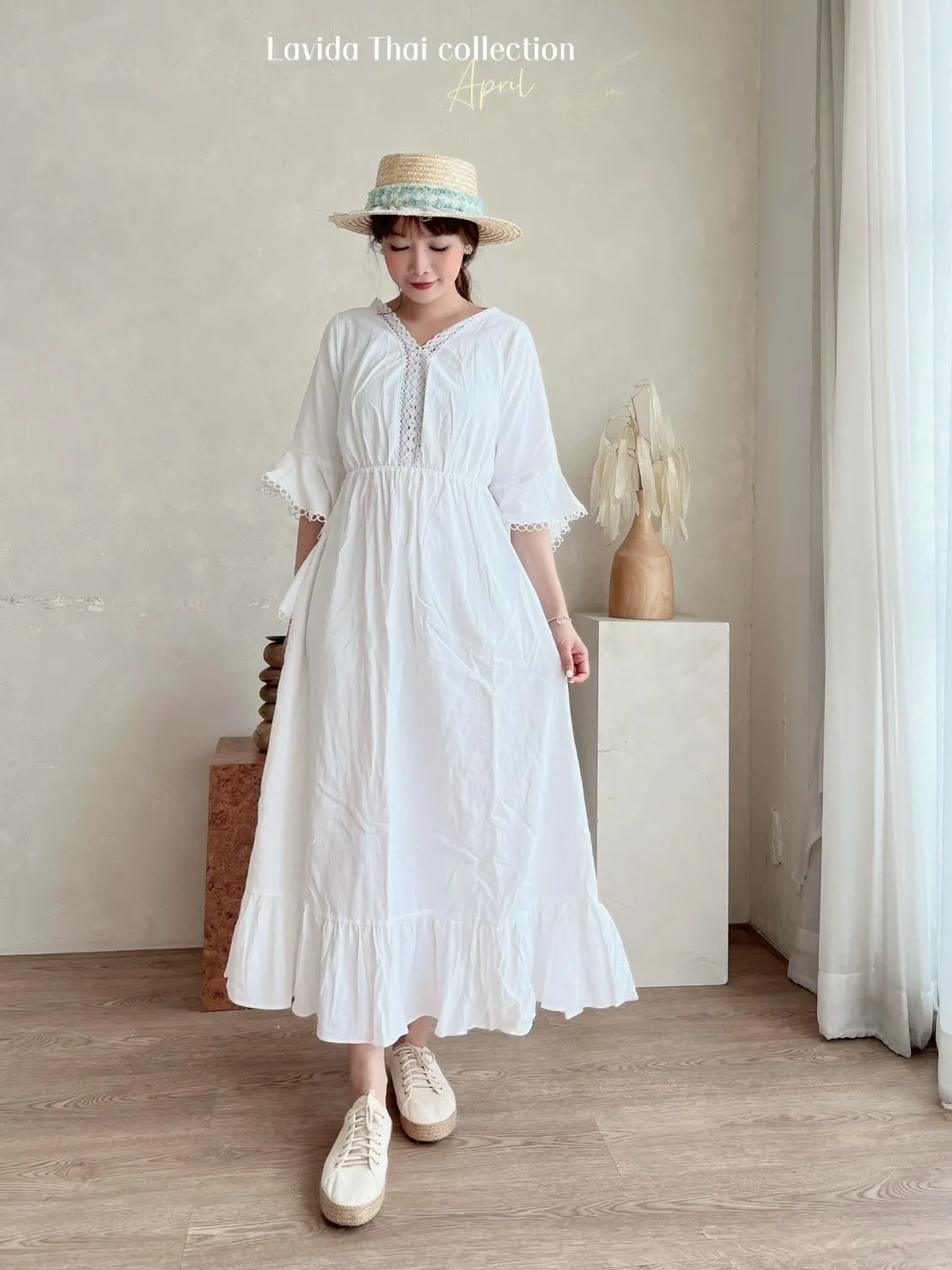 棉+亞麻 透氣舒適 飄逸圈圈蕾絲手袖 下擺拼接