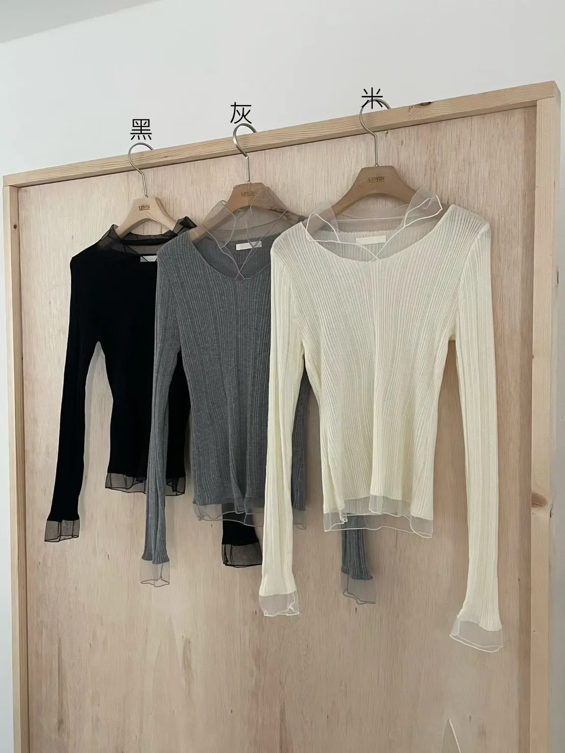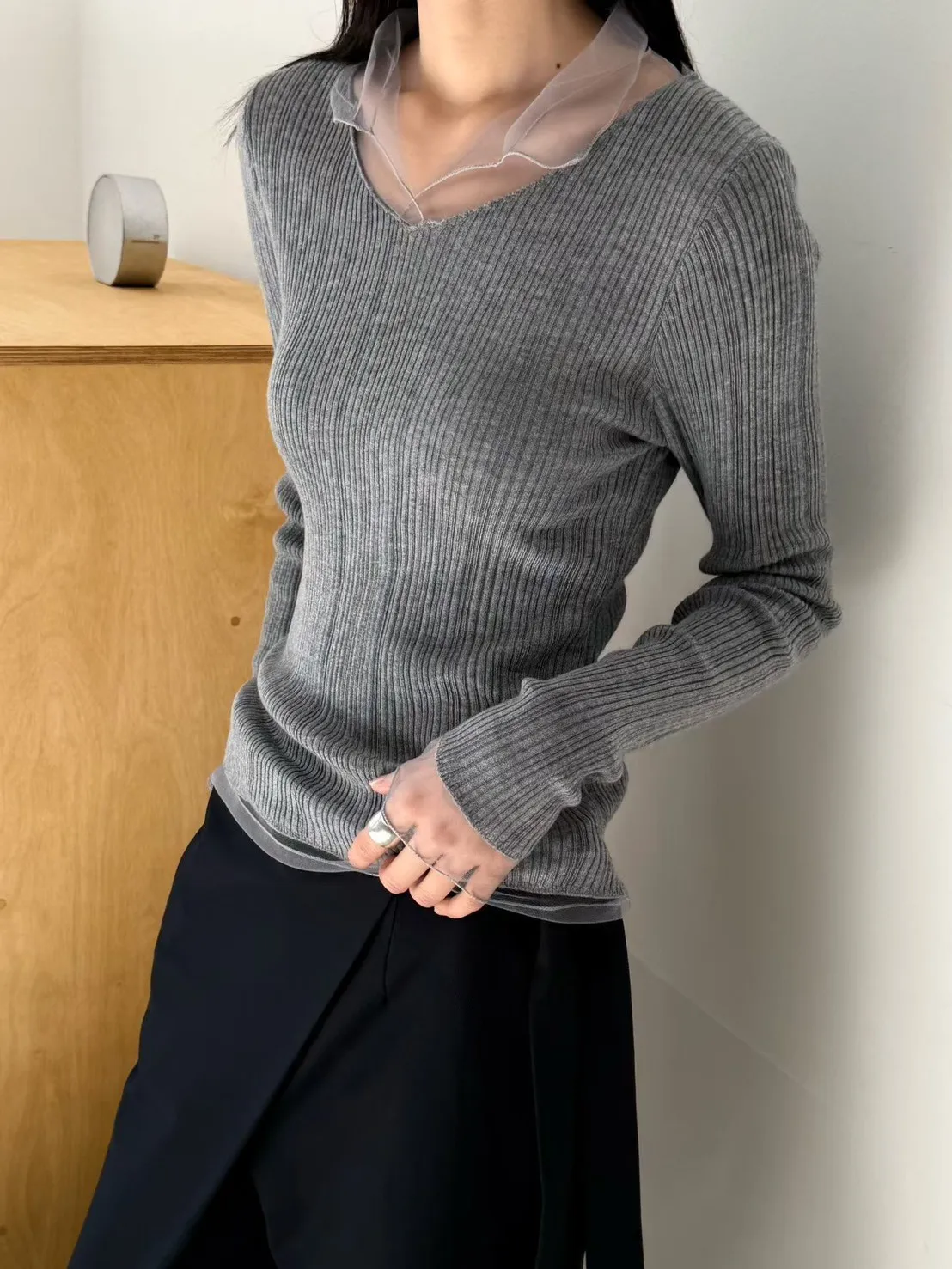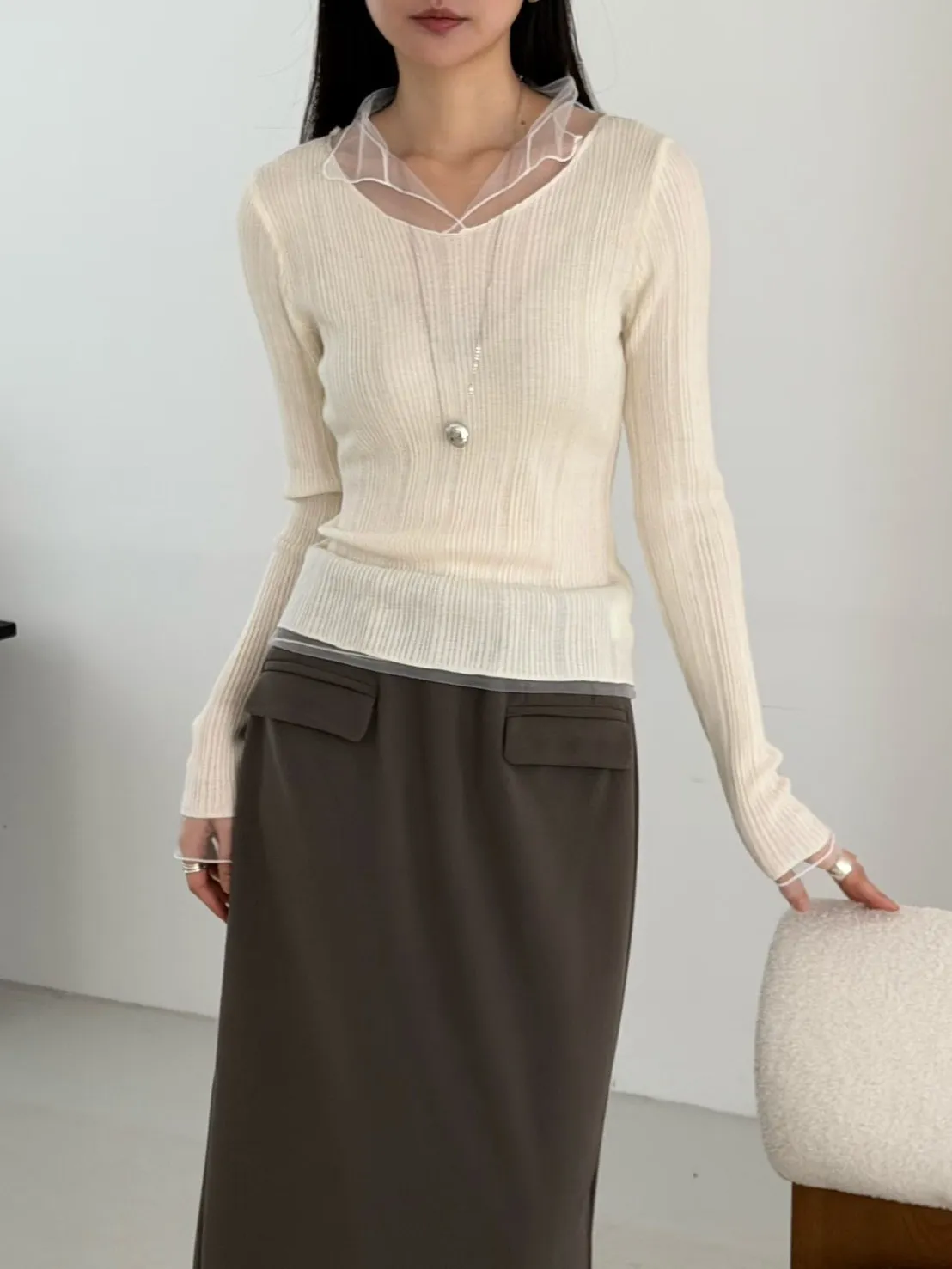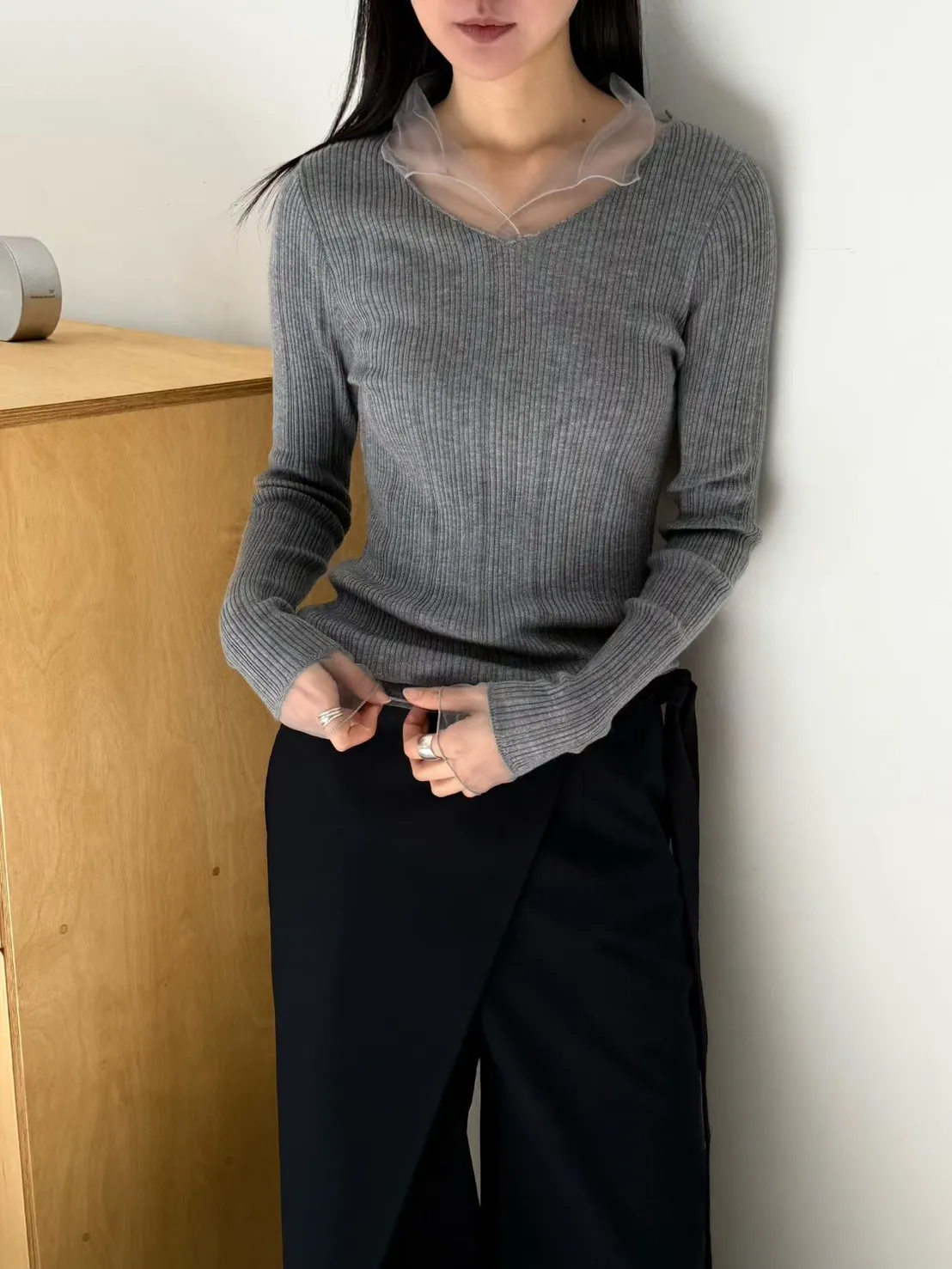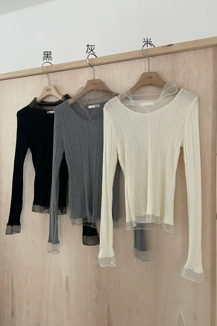 羊毛20%+網紗 領口袖口下擺透光網紗 高級透膚