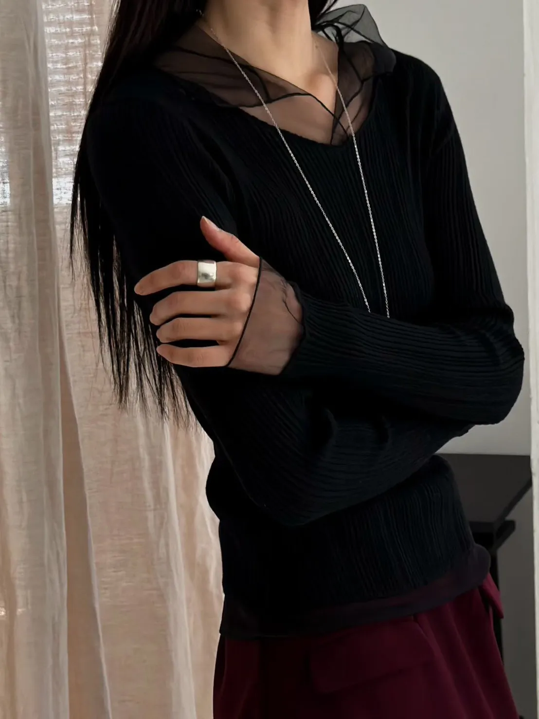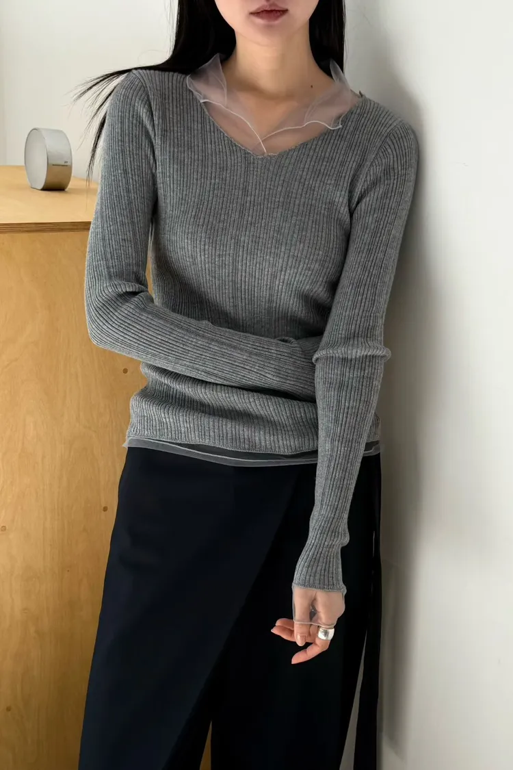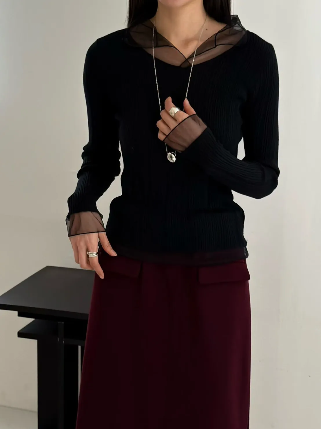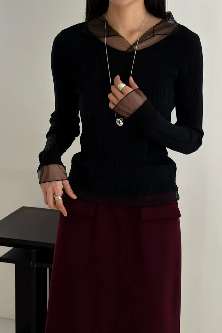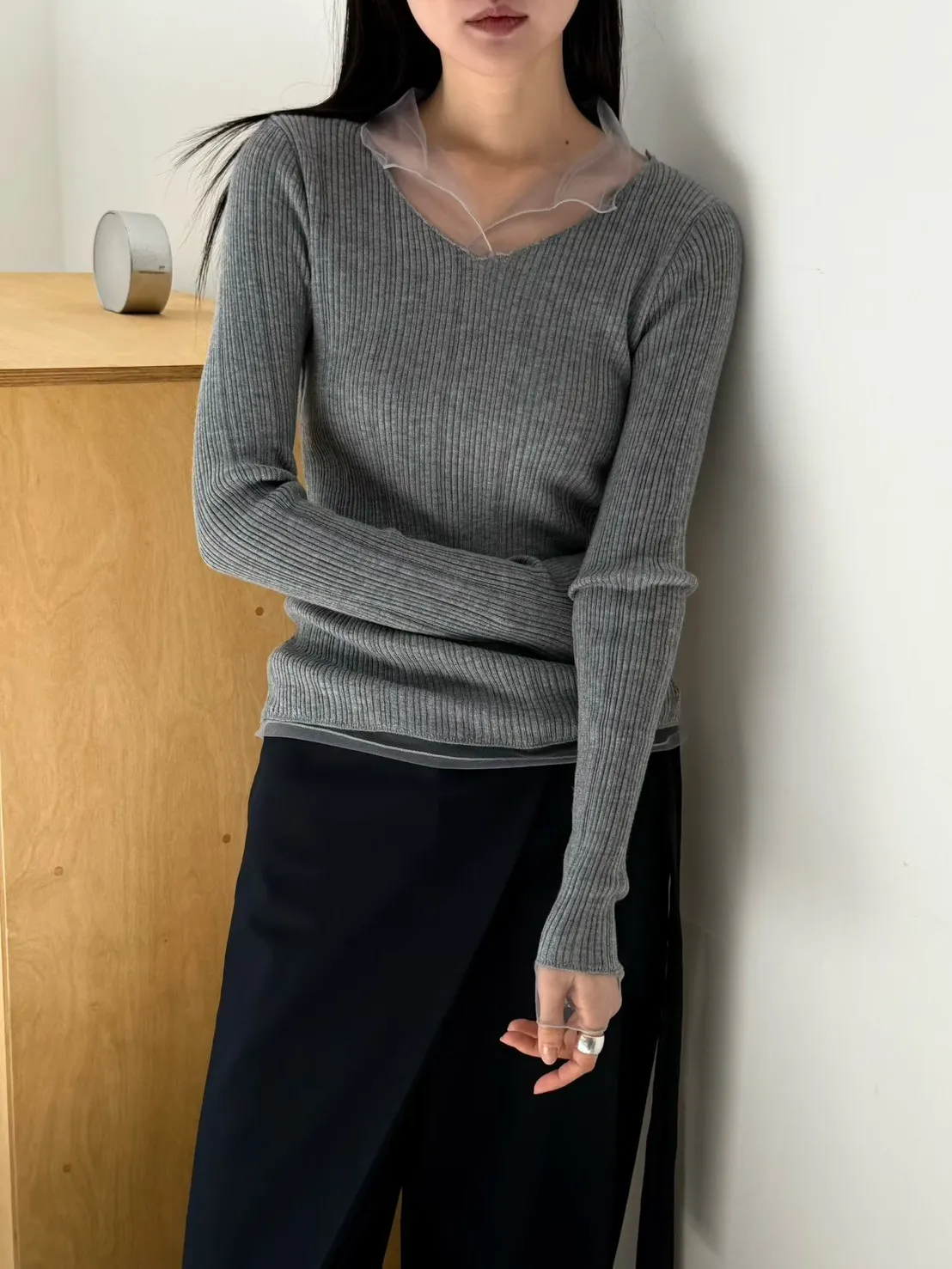 羊毛20%+網紗 領口袖口下擺透光網紗 高級透膚