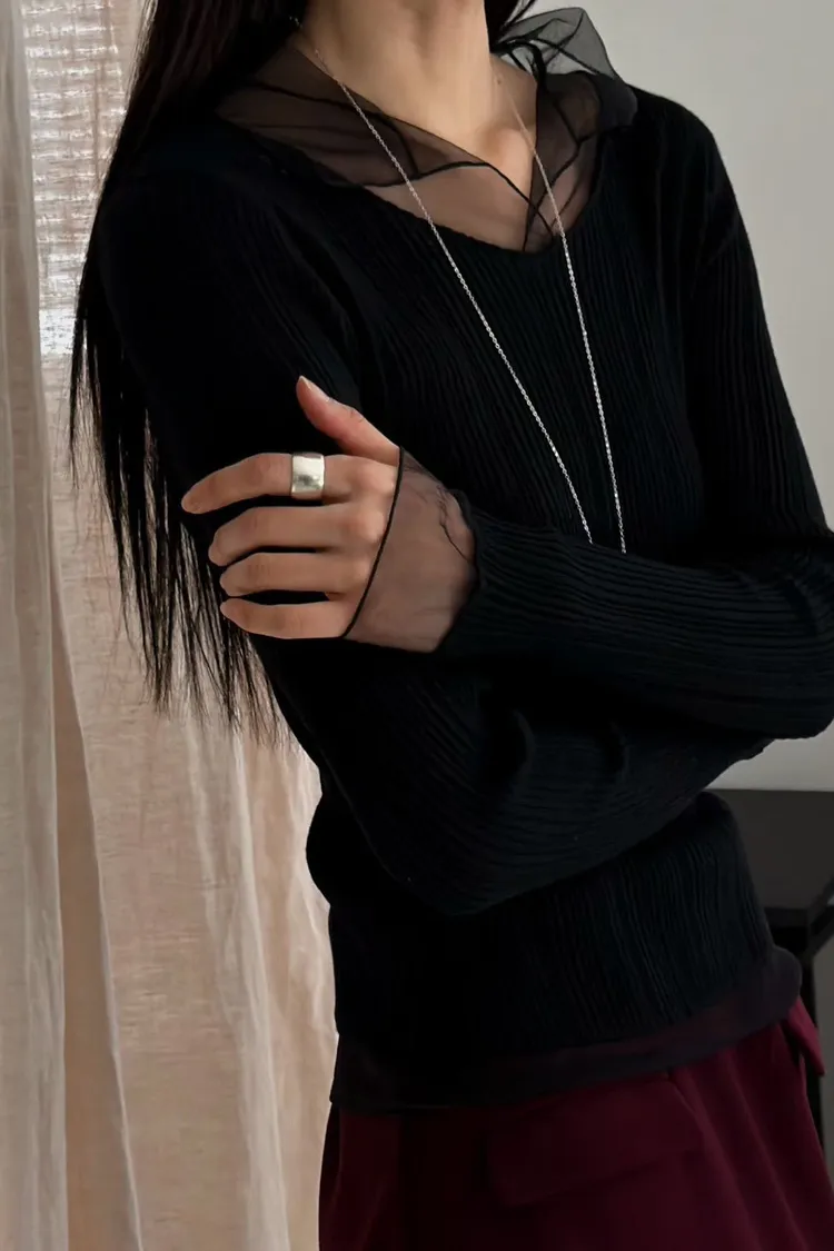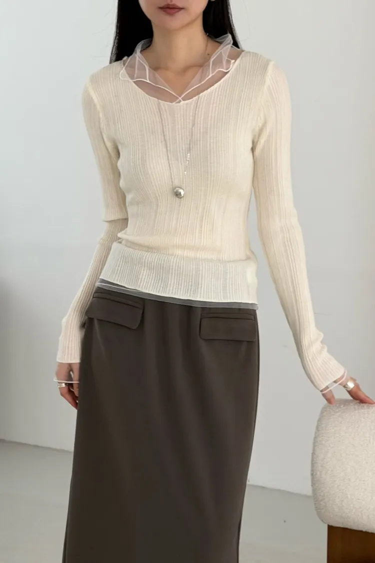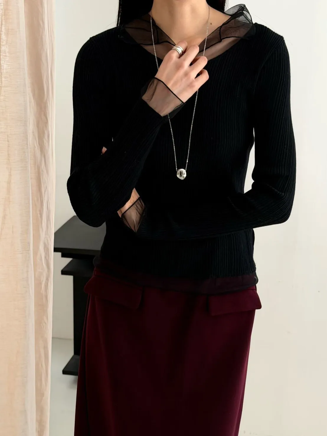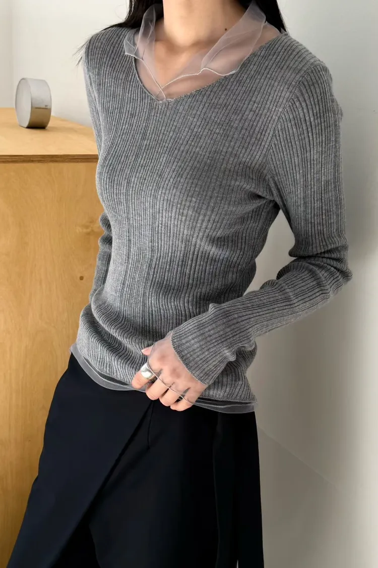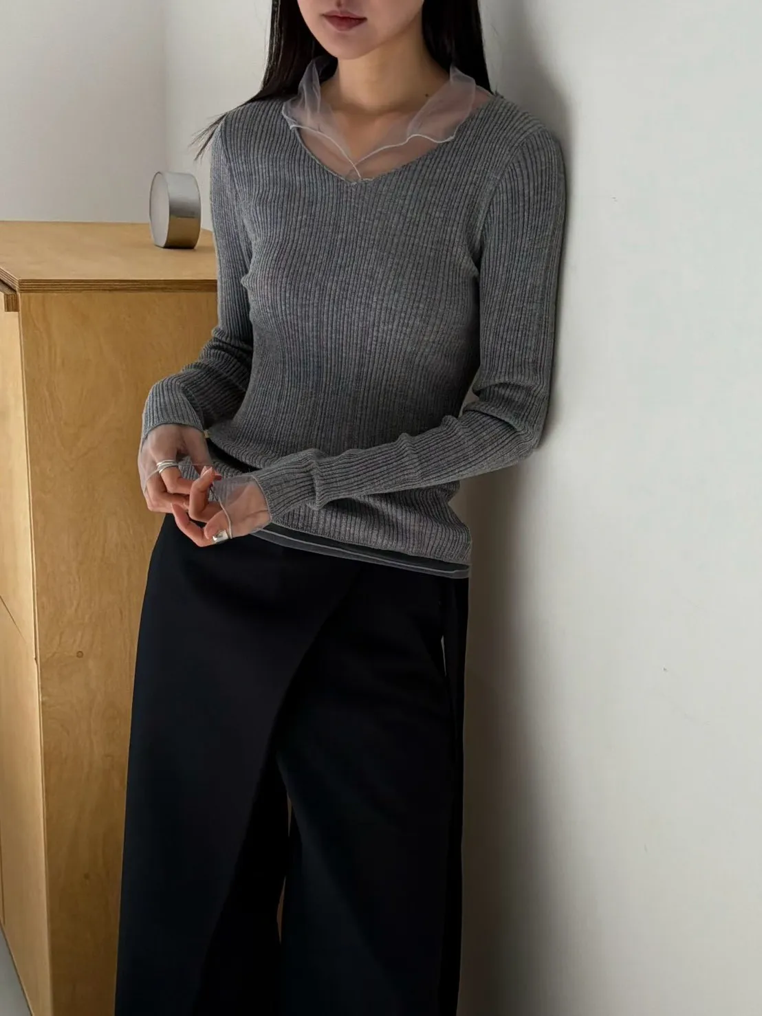 羊毛20%+網紗 領口袖口下擺透光網紗 高級透膚
