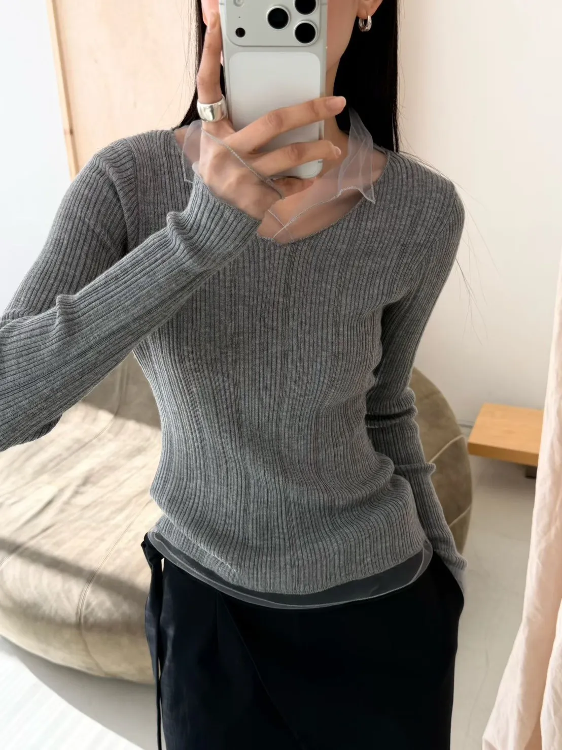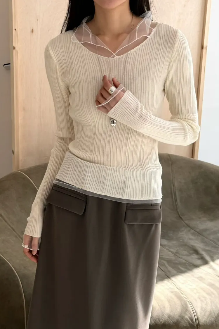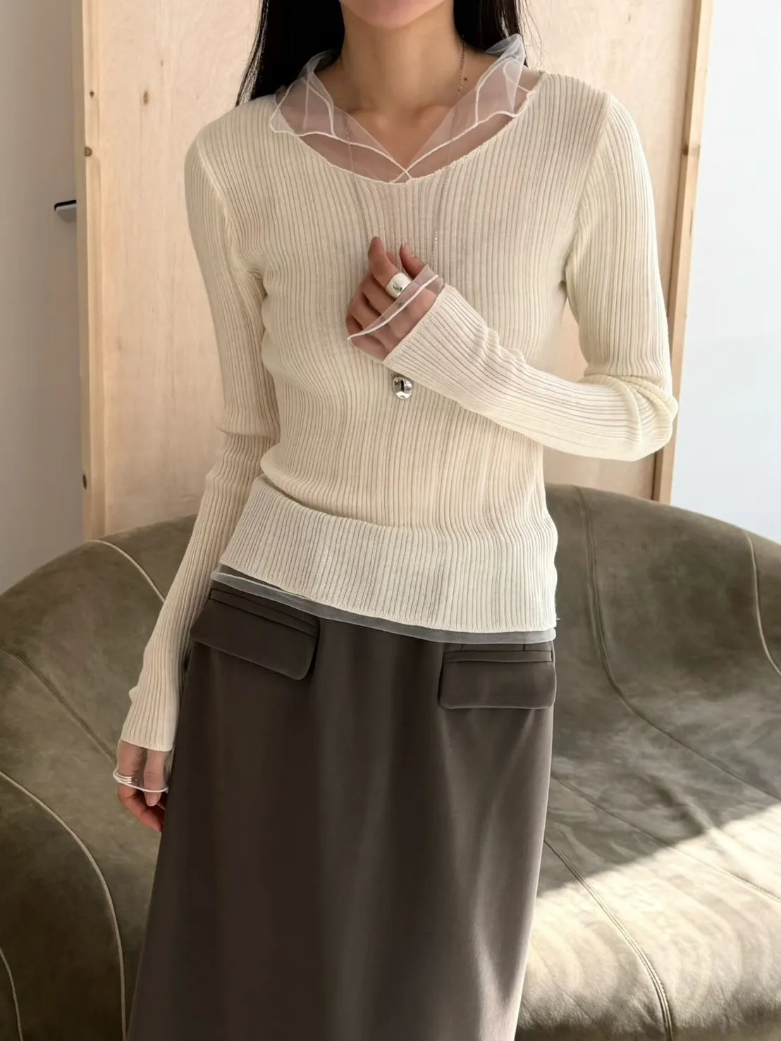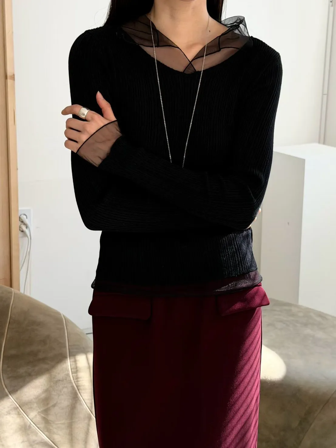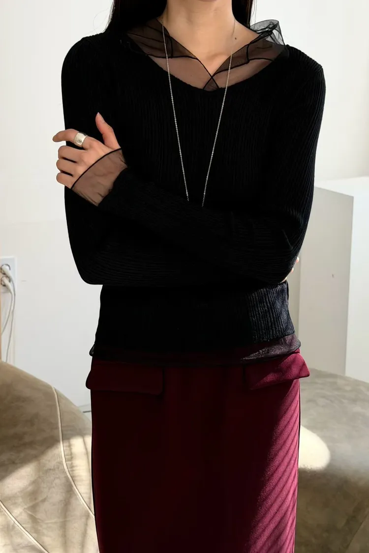 羊毛20%+網紗 領口袖口下擺透光網紗 高級透膚