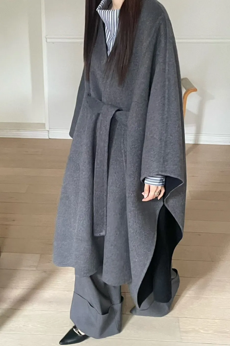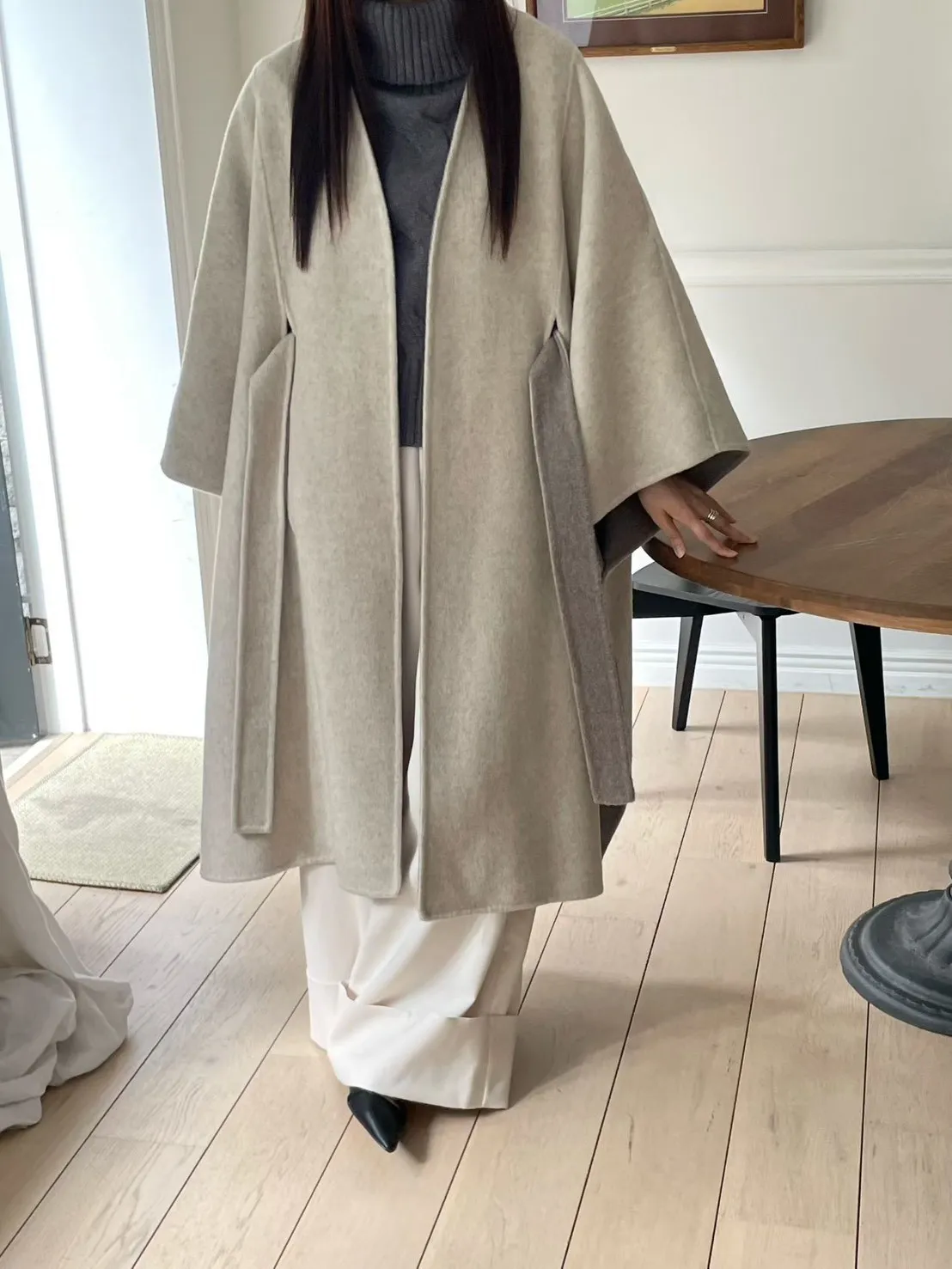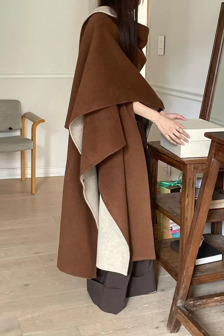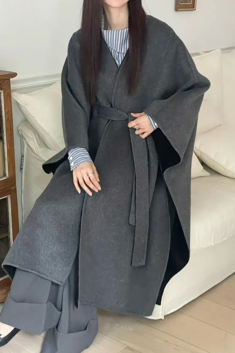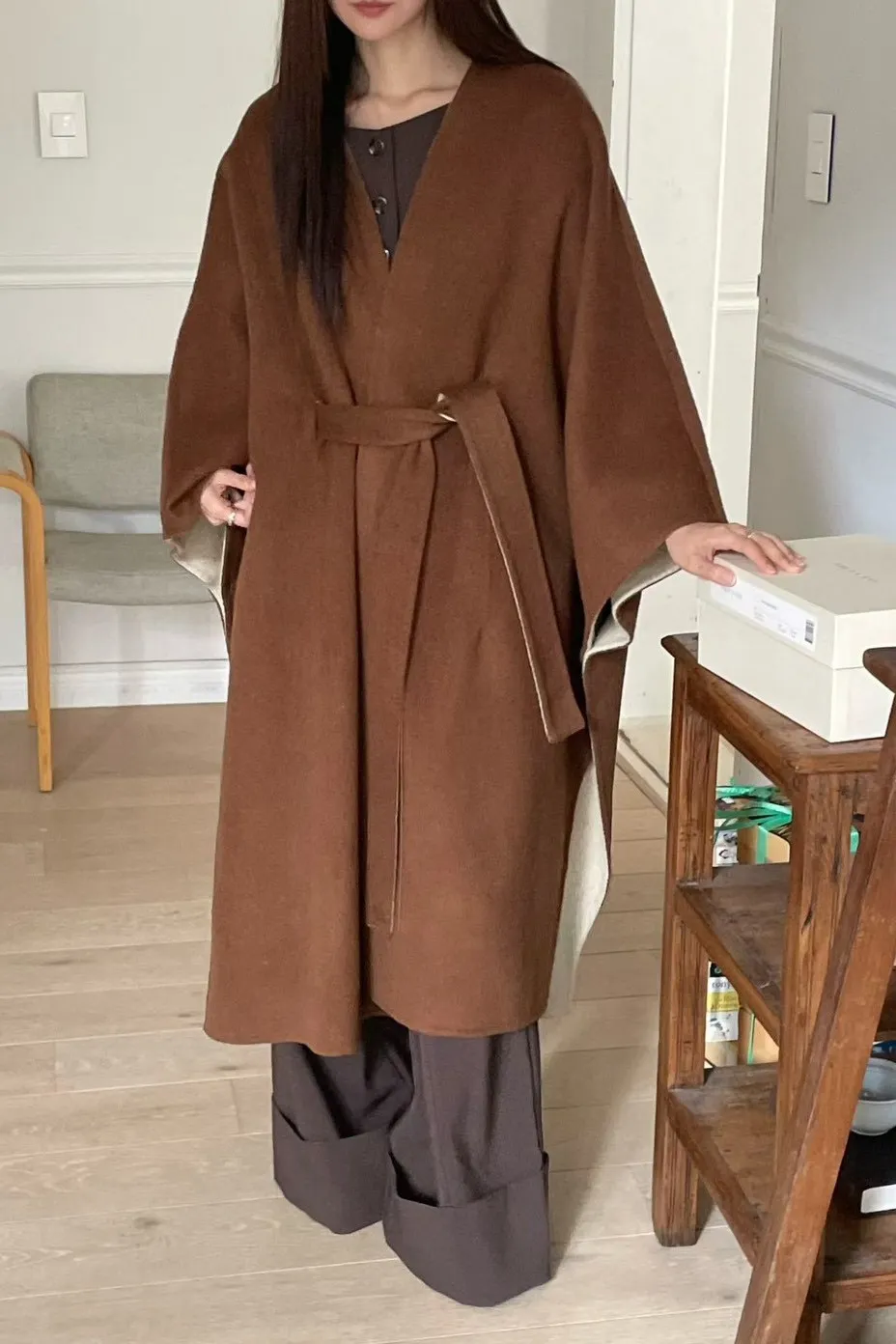 羊毛90% 高級訂製版 雙面視覺拚色 附腰帶 多層次穿搭