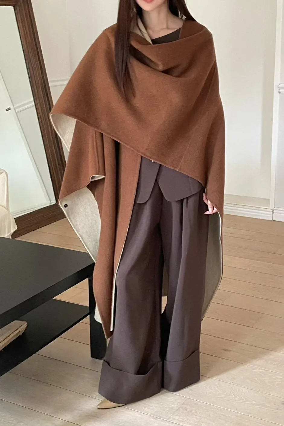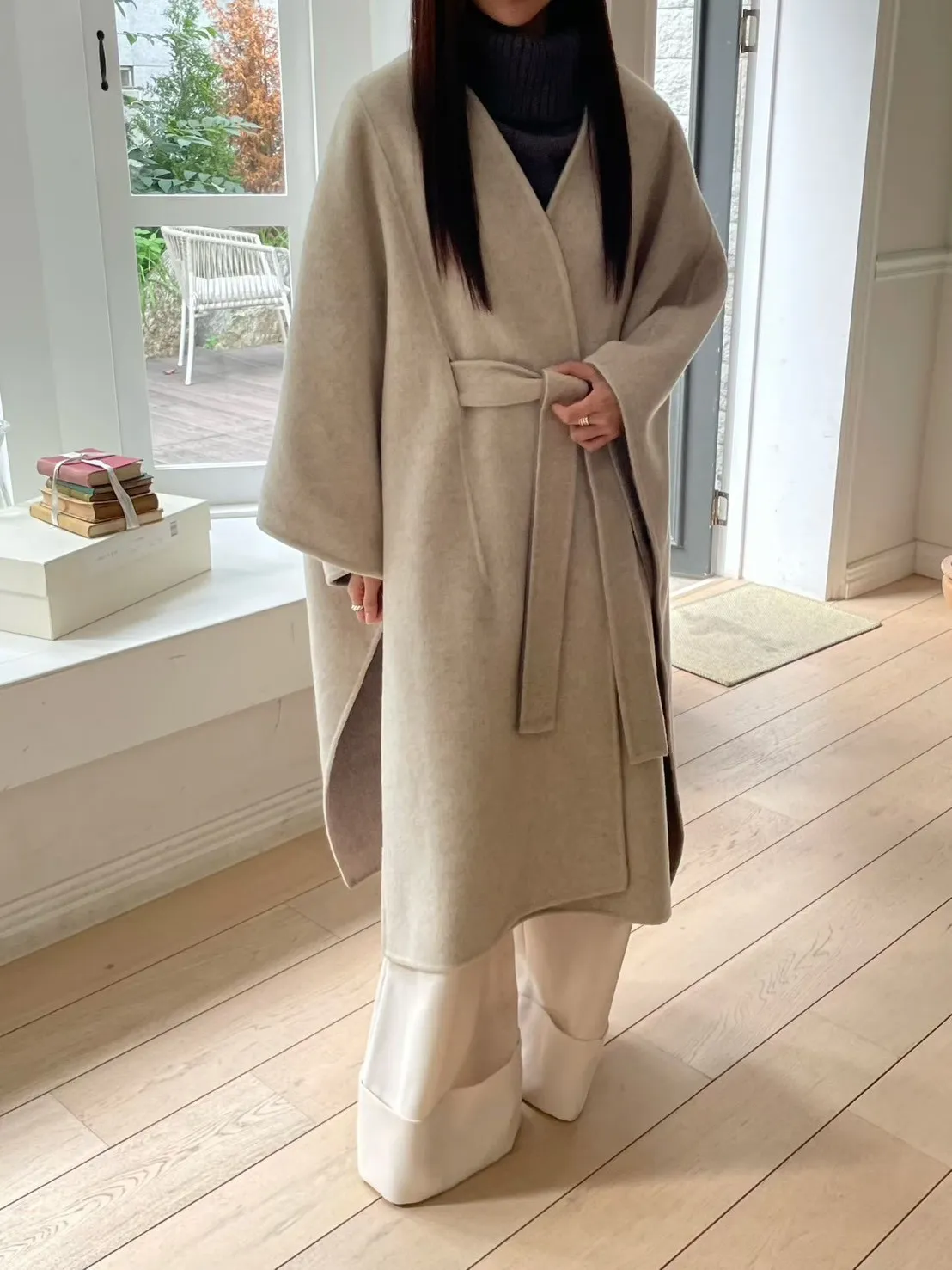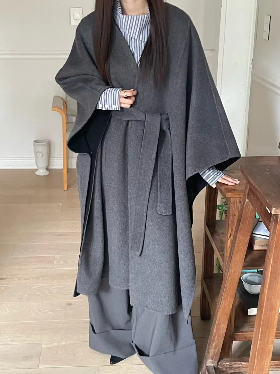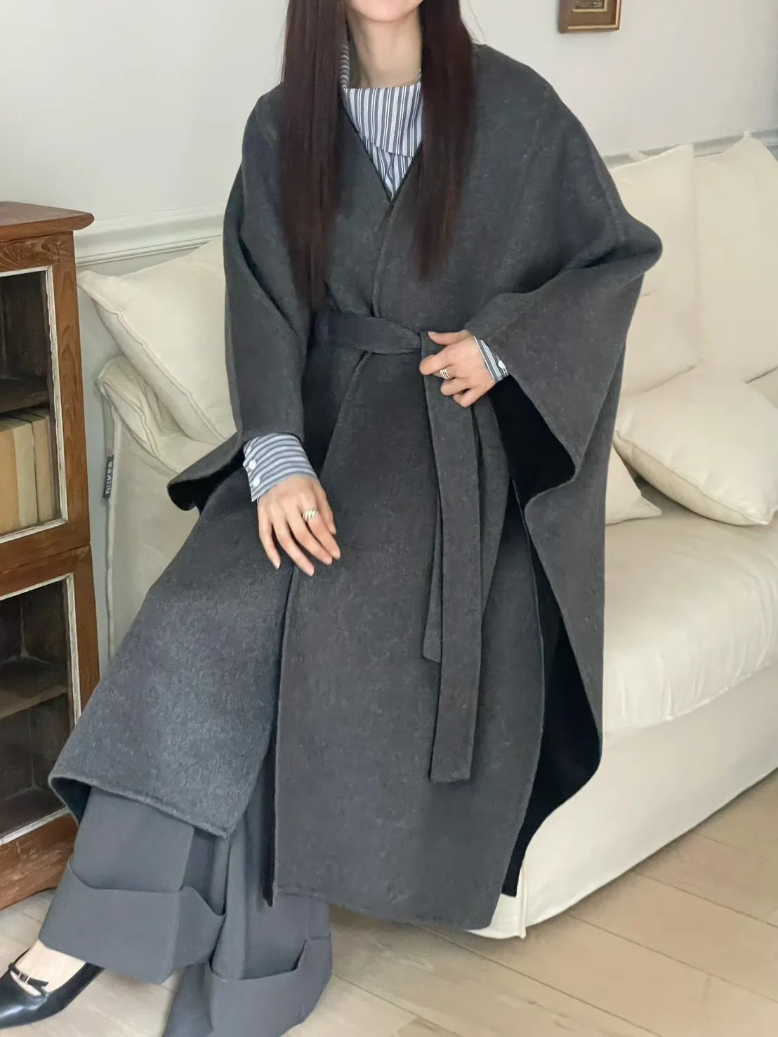 羊毛90% 高級訂製版 雙面視覺拚色 附腰帶 多層次穿搭