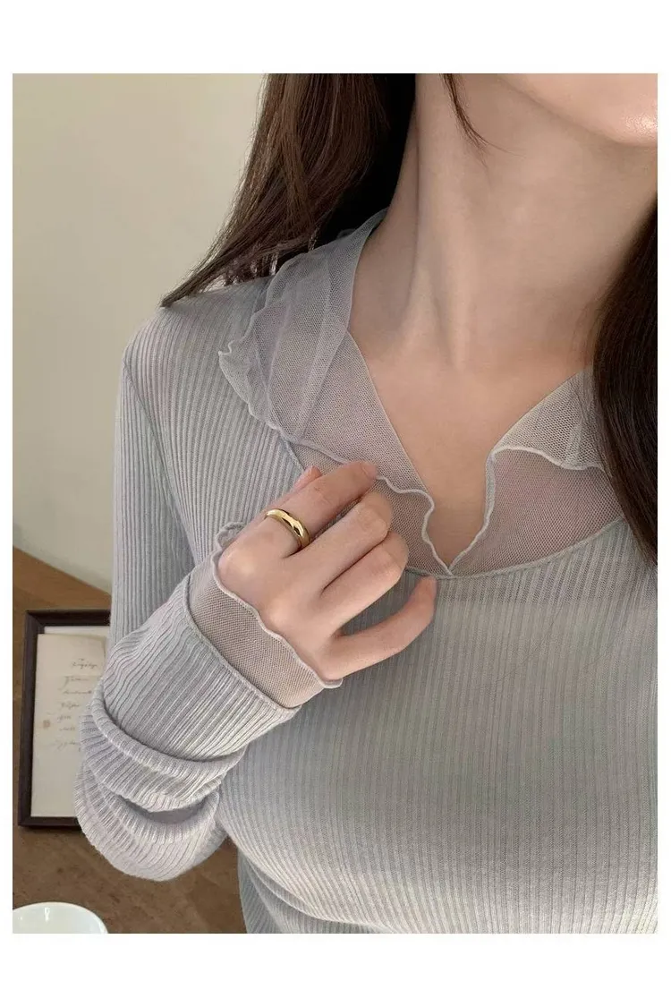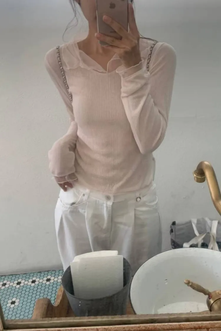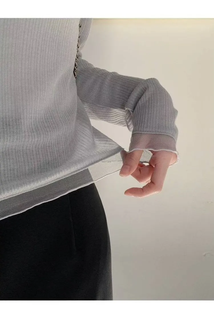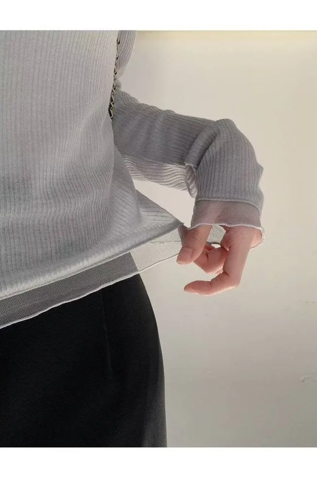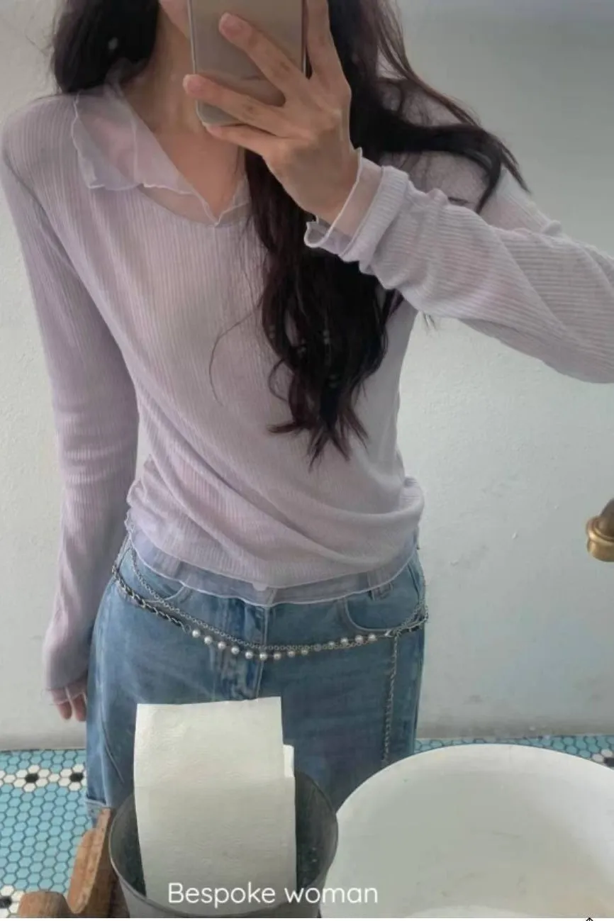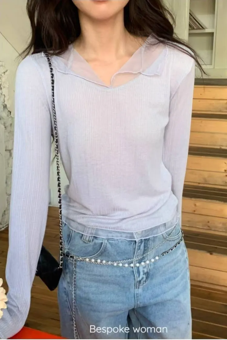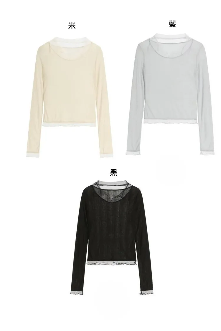 聚酯 薄款細坑條面料 親膚透光 柔軟網紗 領口下擺袖口蕾絲 適合台灣四季