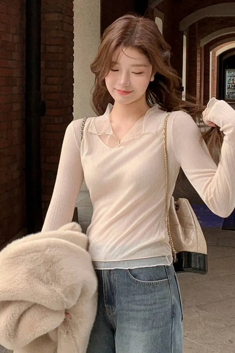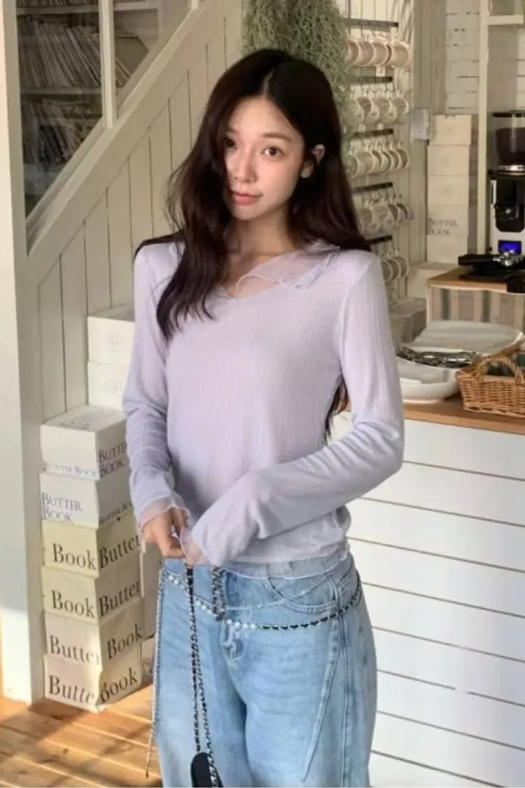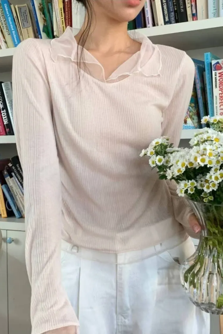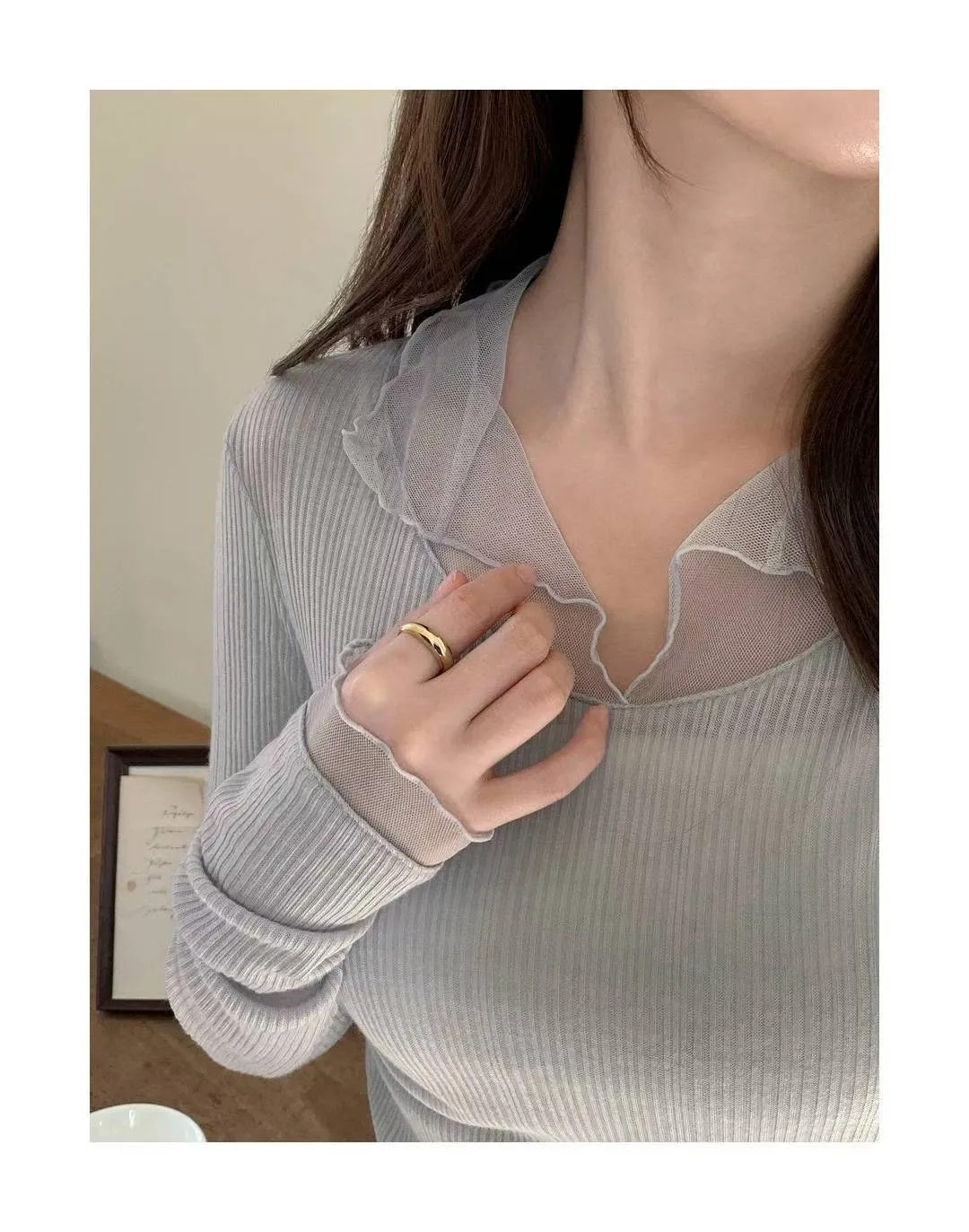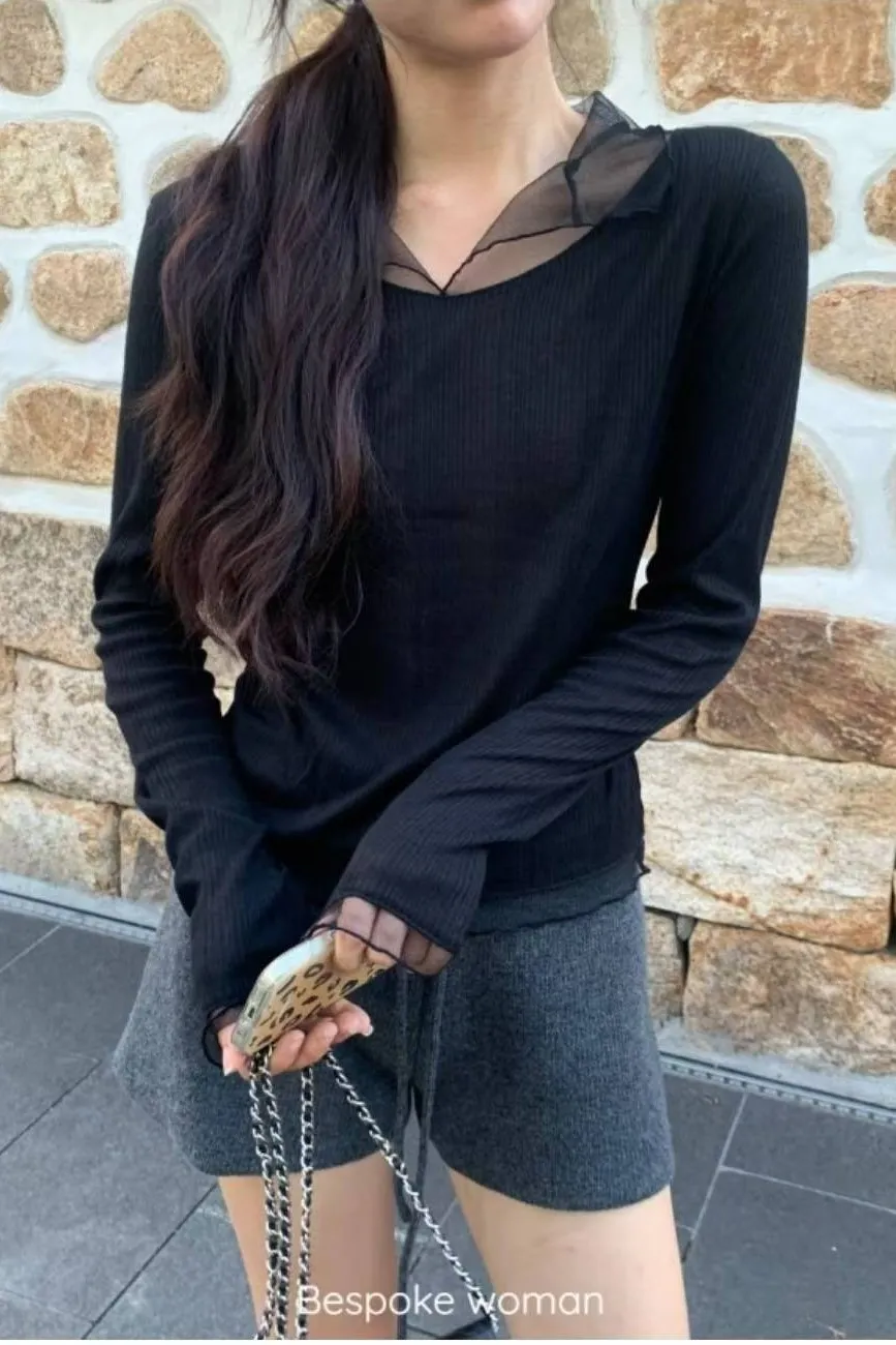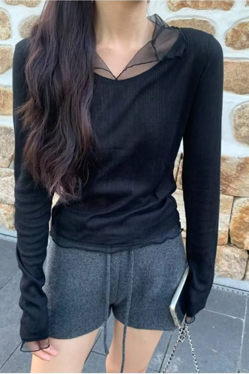 聚酯 薄款細坑條面料 親膚透光 柔軟網紗 領口下擺袖口蕾絲 適合台灣四季