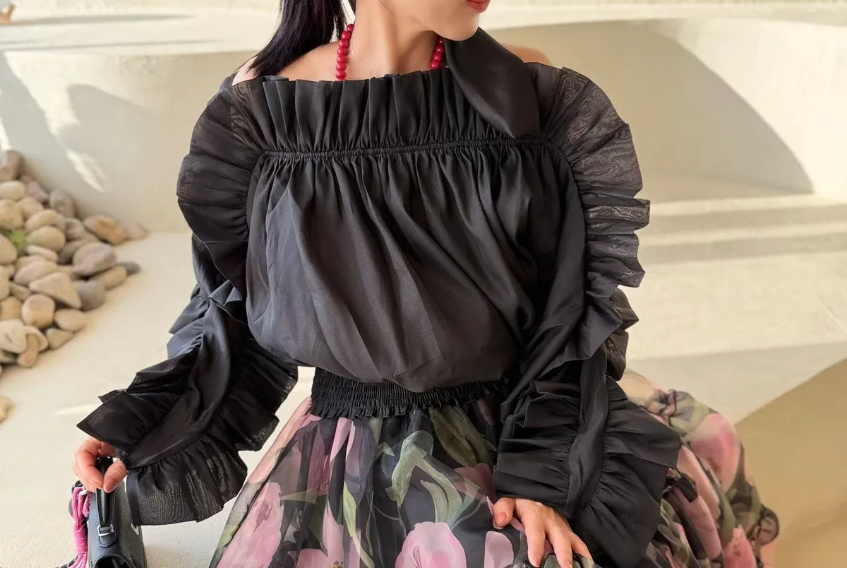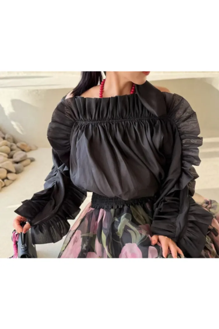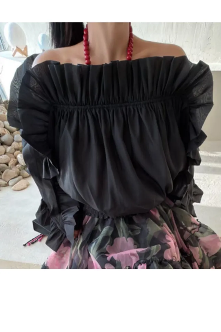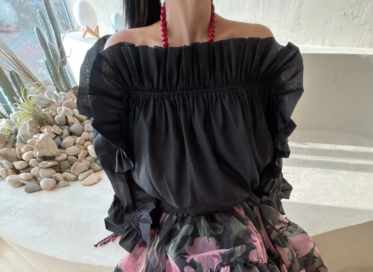 雪紡+聚酯 視覺華麗 露肩設計 飄逸荷葉 L號友善