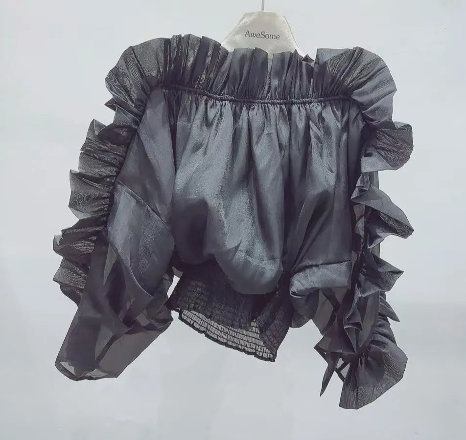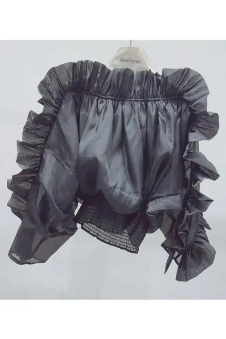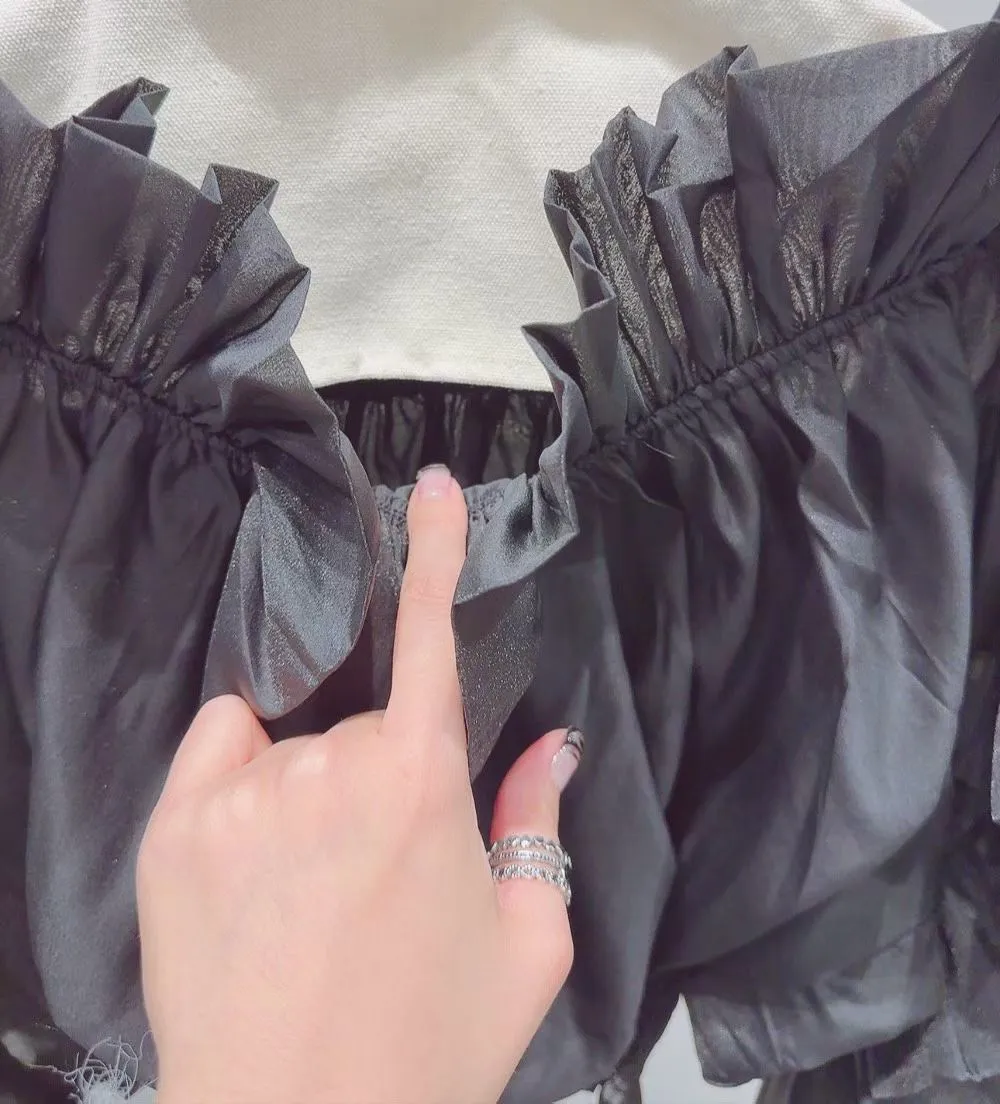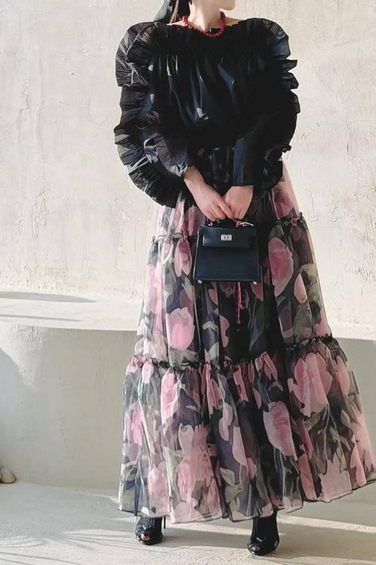 雪紡+聚酯 視覺華麗 露肩設計 飄逸荷葉 L號友善