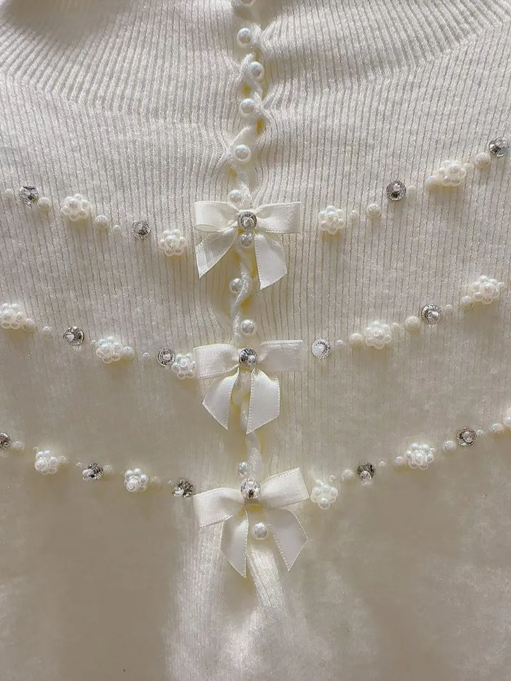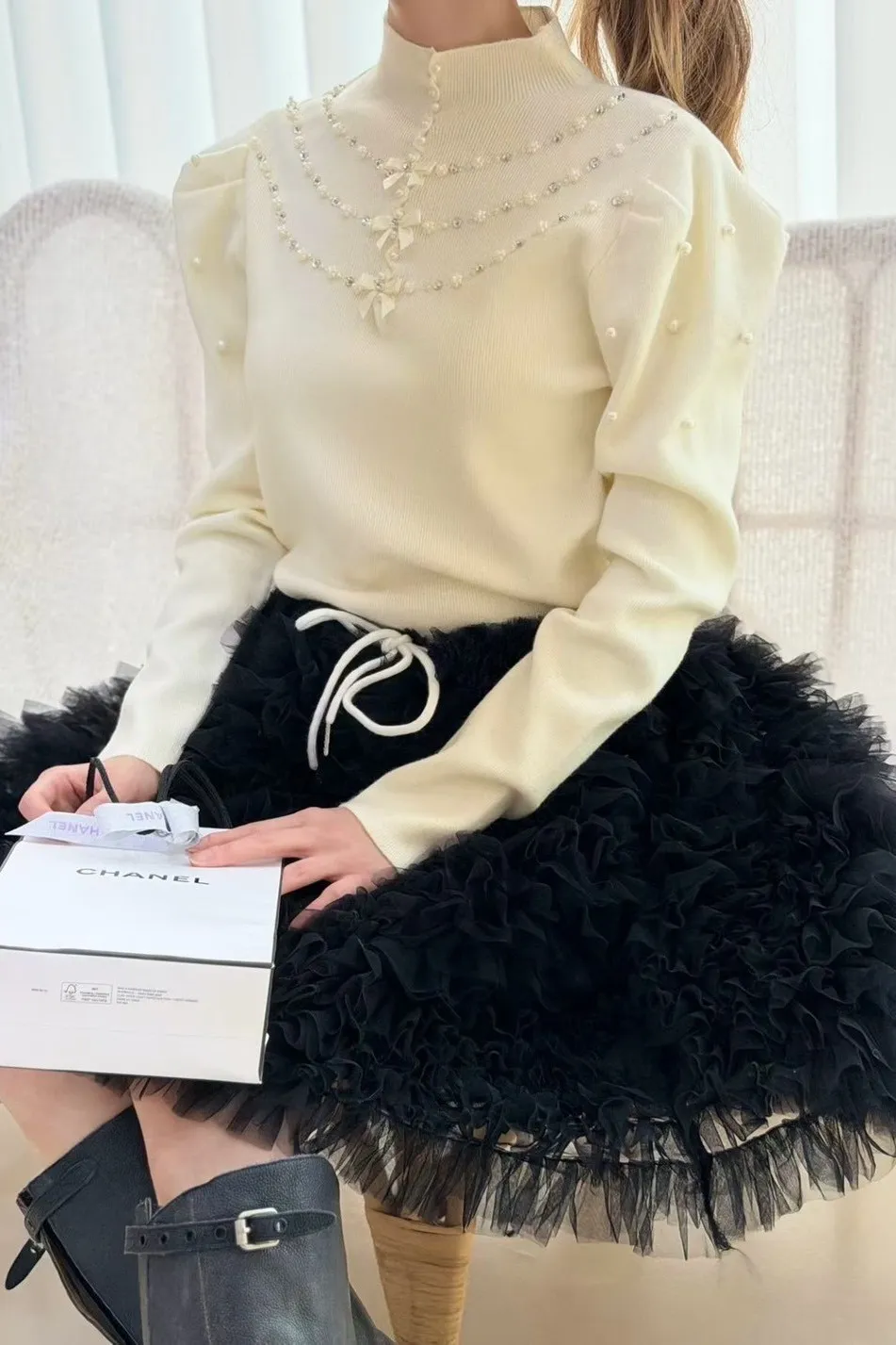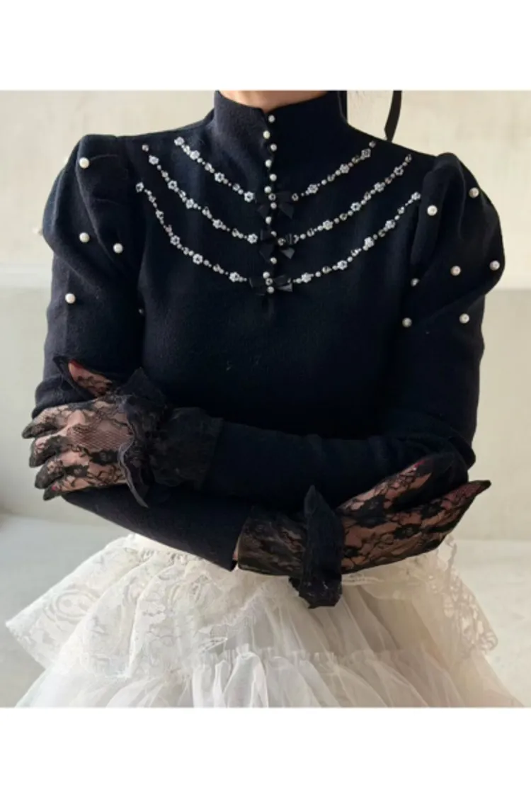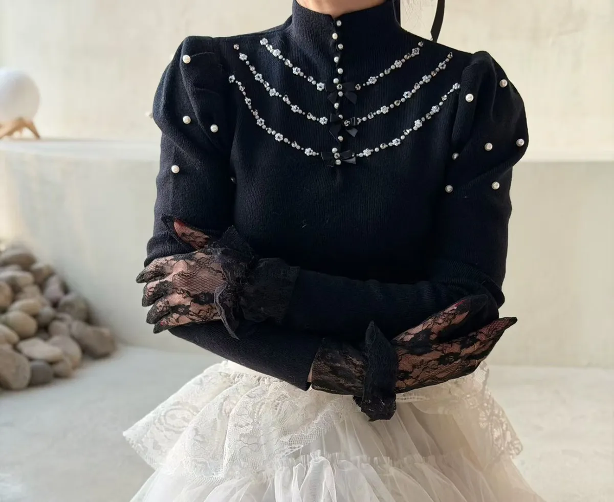 羊毛10% 鑲嵌珍珠細鑽 針織面料 公主蓬袖 氣質典雅