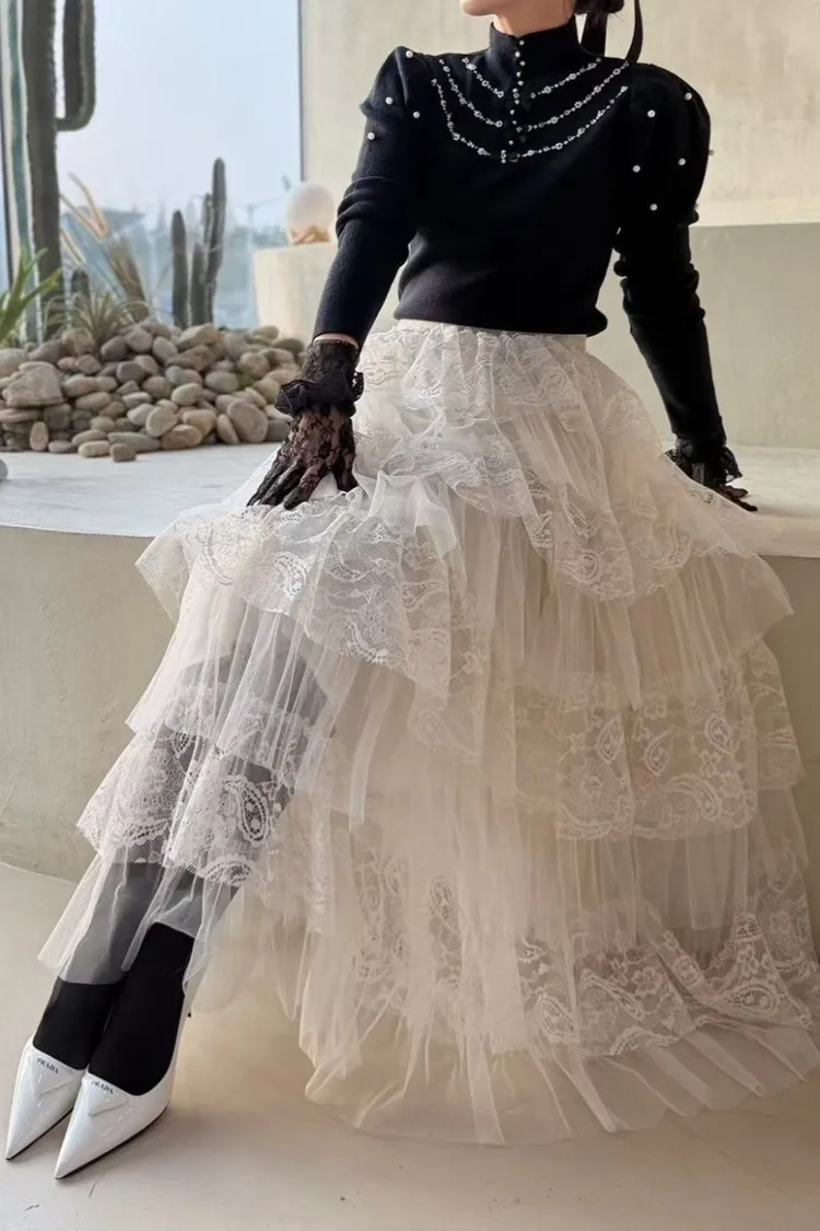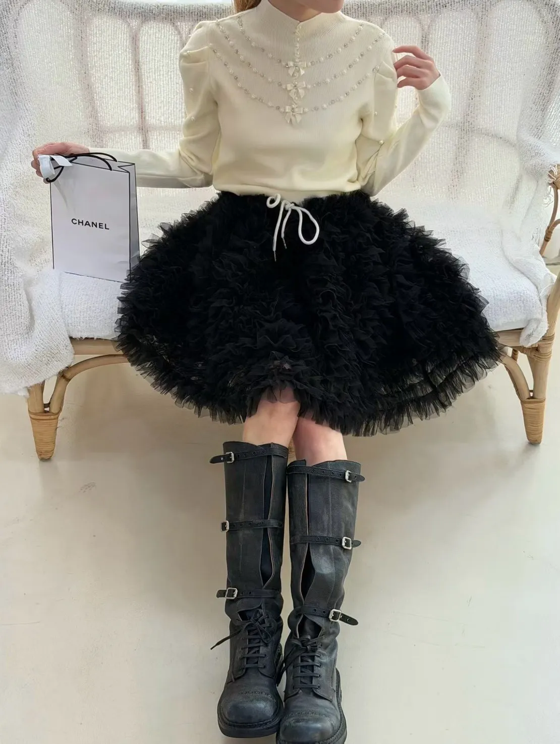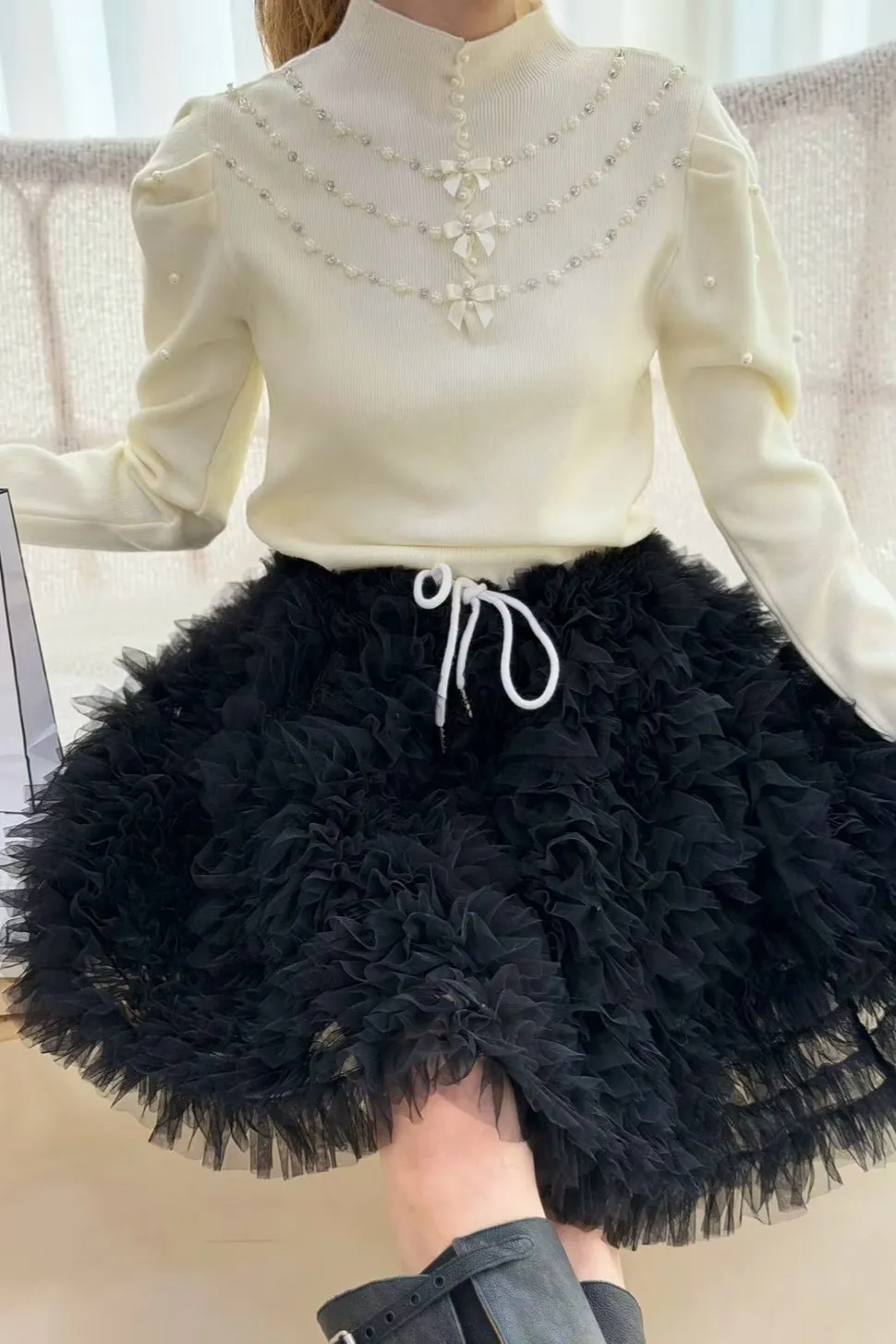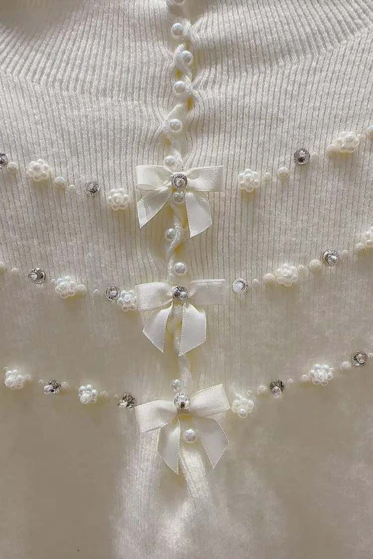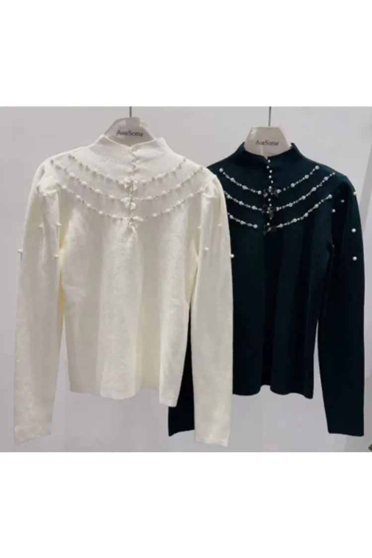 羊毛10% 鑲嵌珍珠細鑽 針織面料 公主蓬袖 氣質典雅