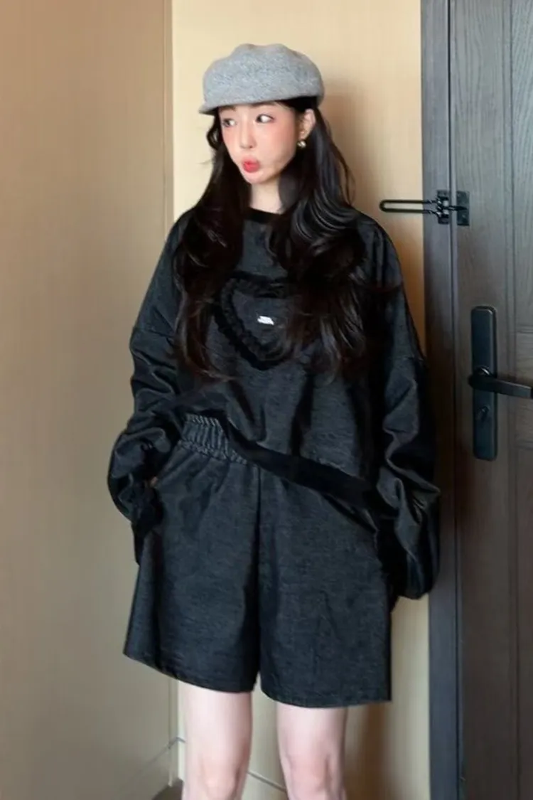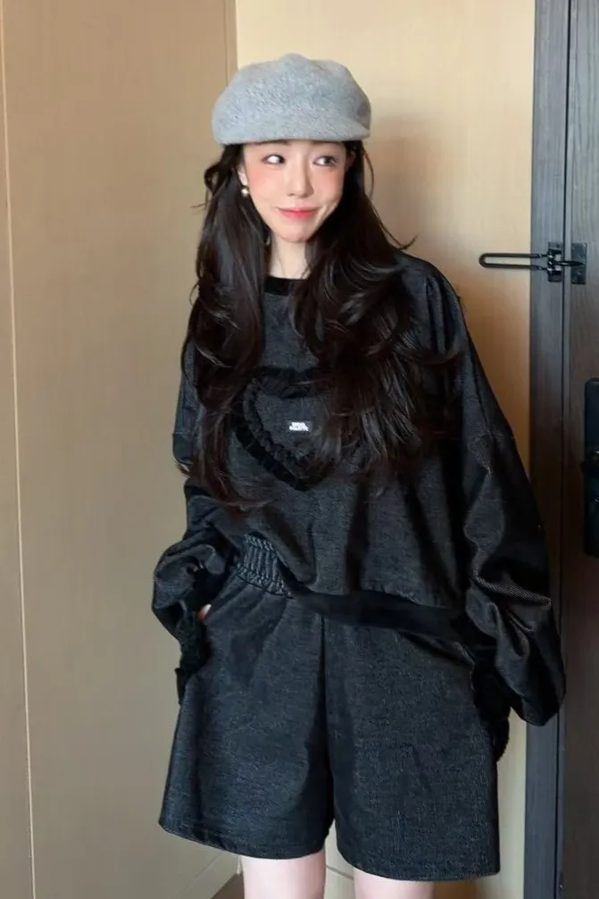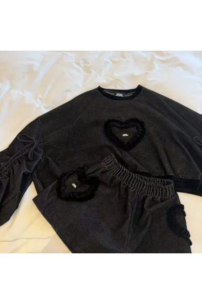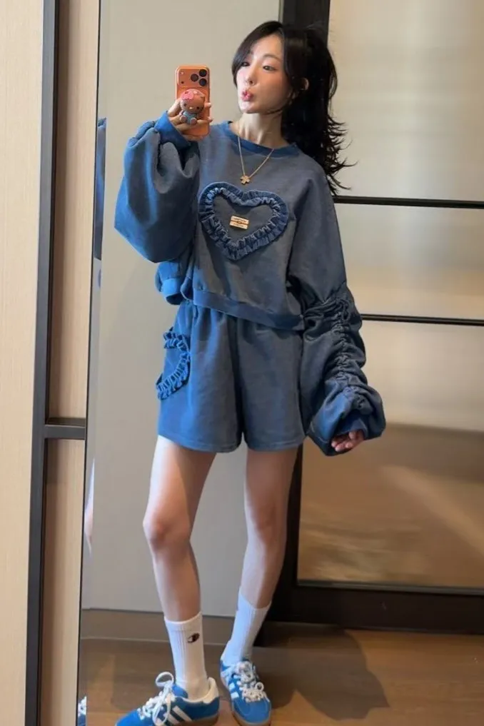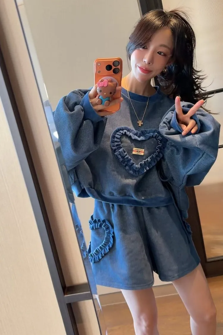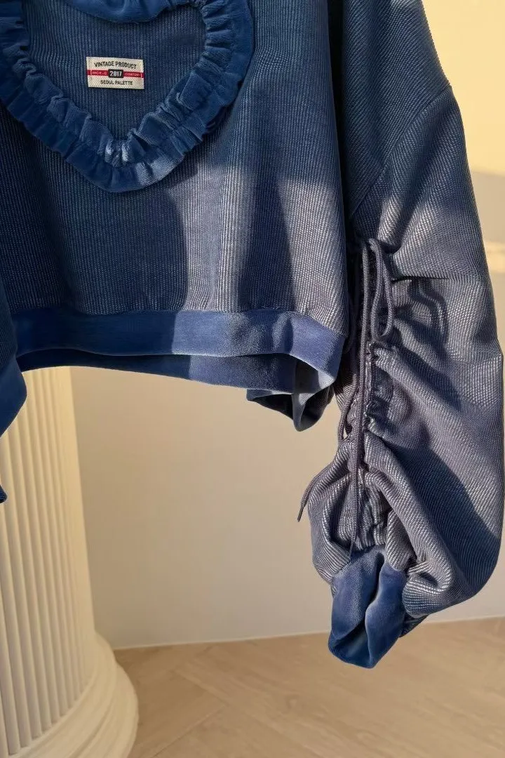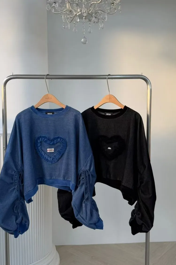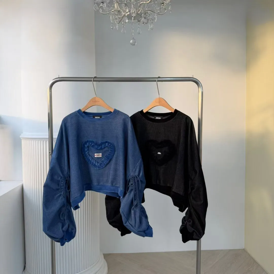 聚酯 燈心絨 長袖抽繩設計 荷葉立體愛心 短版好比例