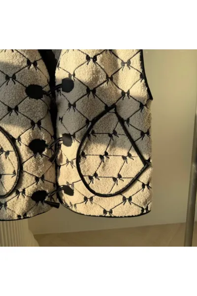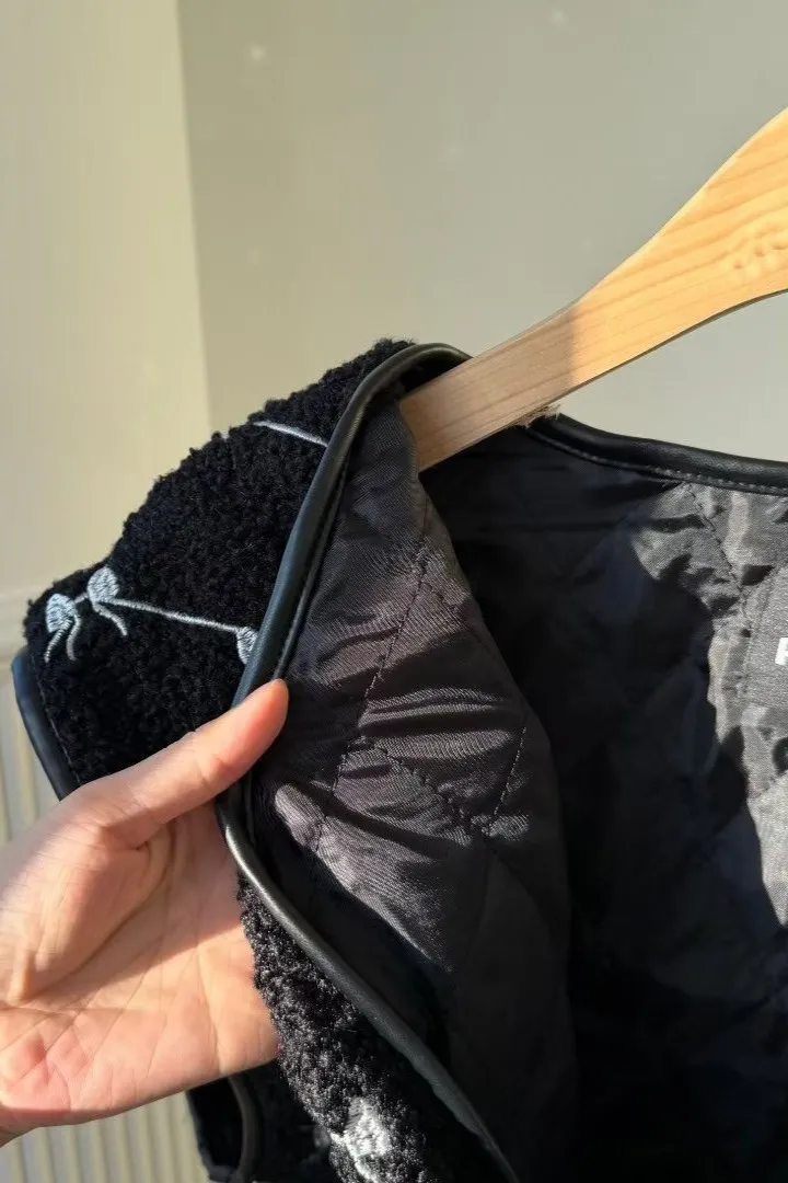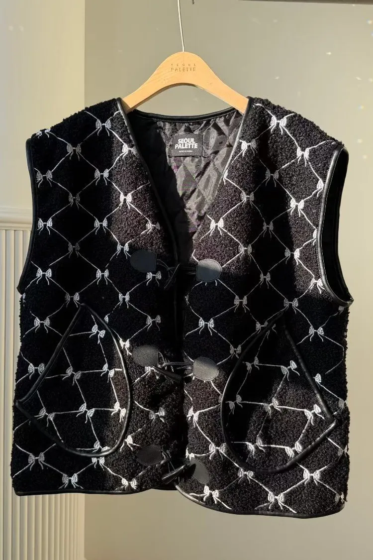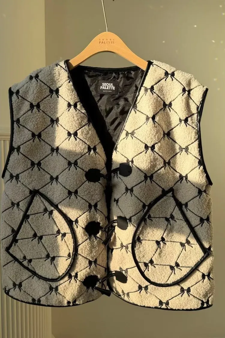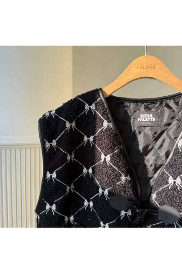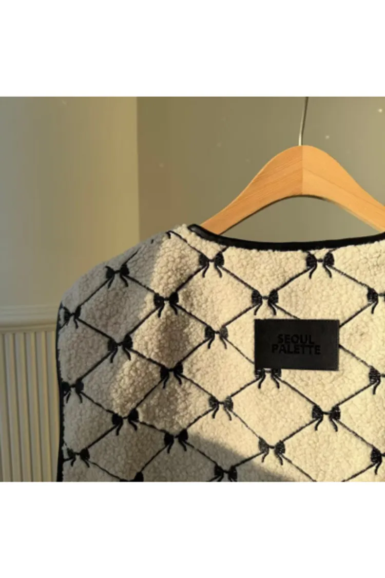 聚酯 刺繡蝴蝶結 有口袋 紋理牛角釦 有內裡 皮革包邊