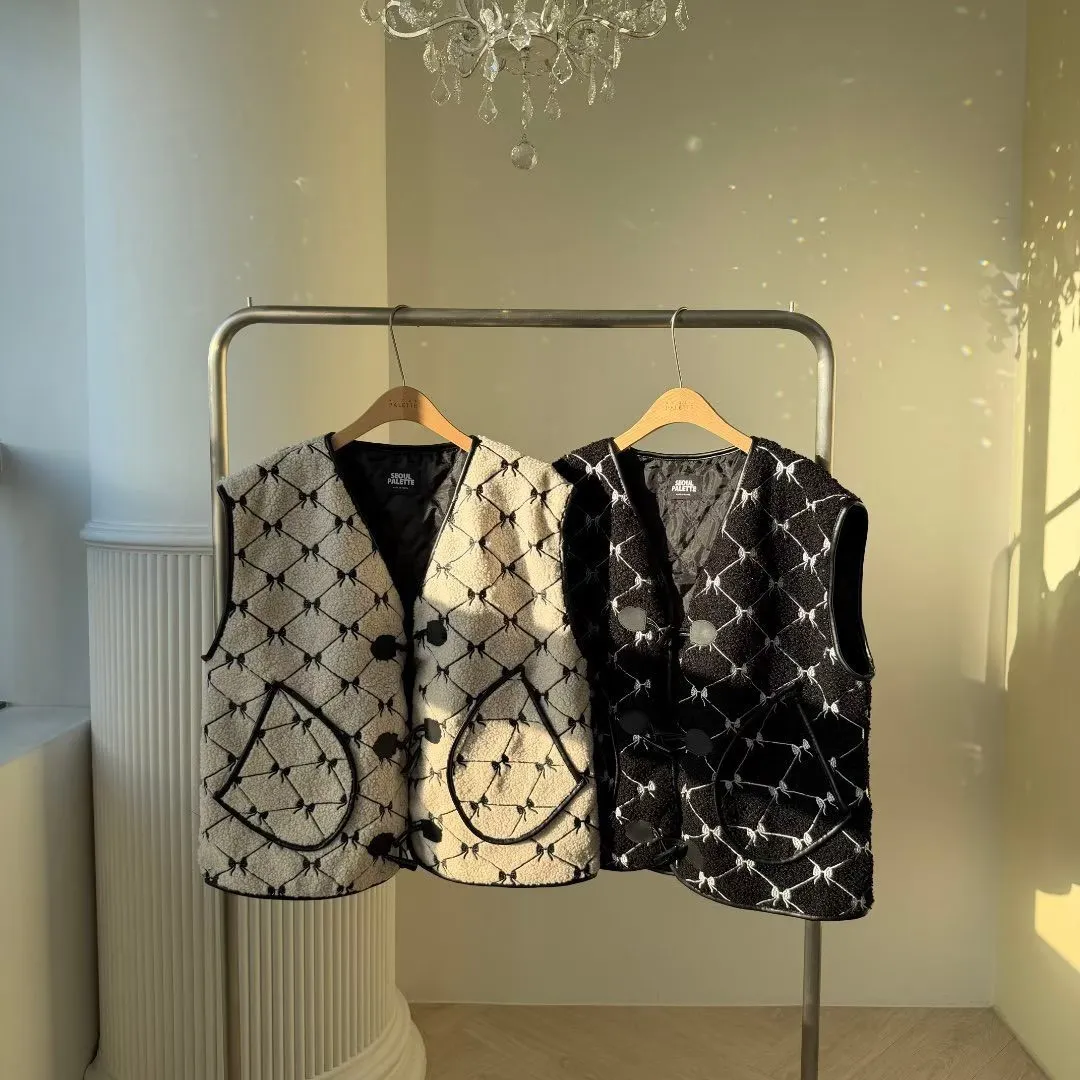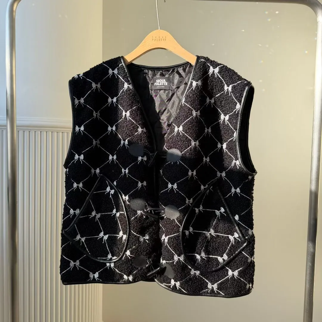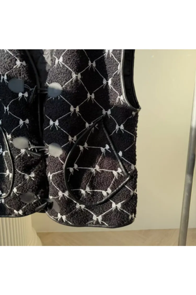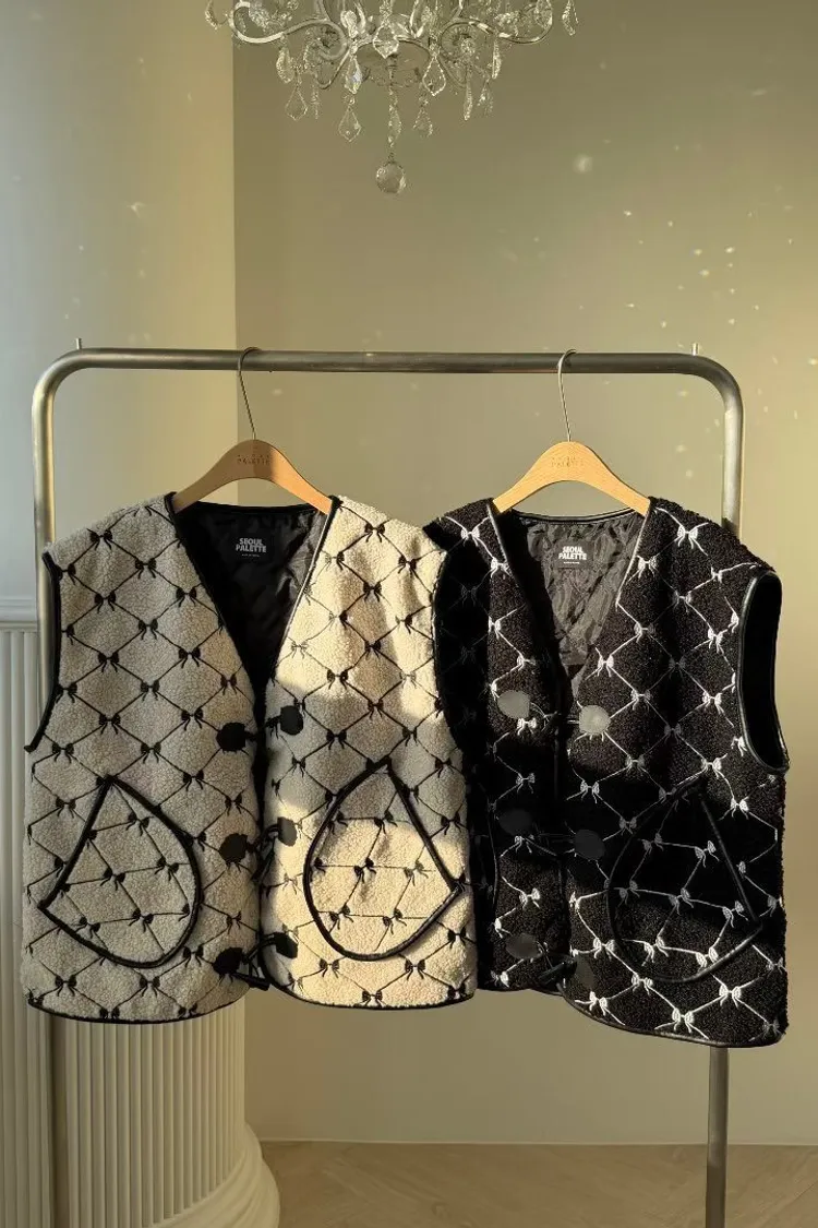 聚酯 刺繡蝴蝶結 有口袋 紋理牛角釦 有內裡 皮革包邊