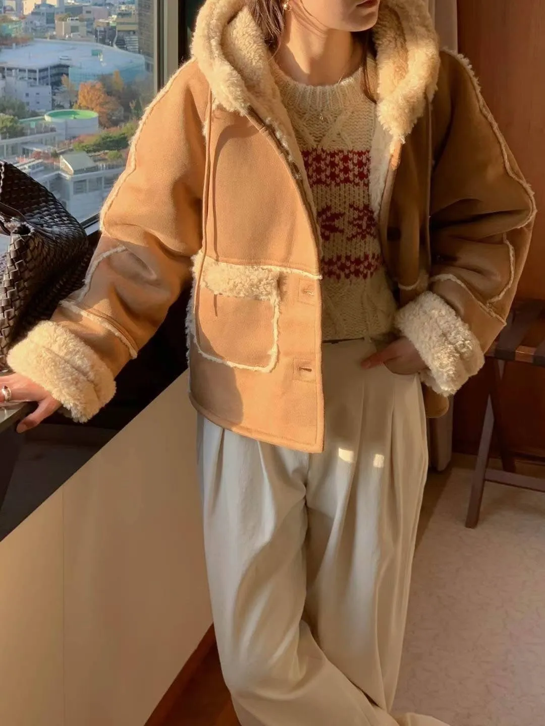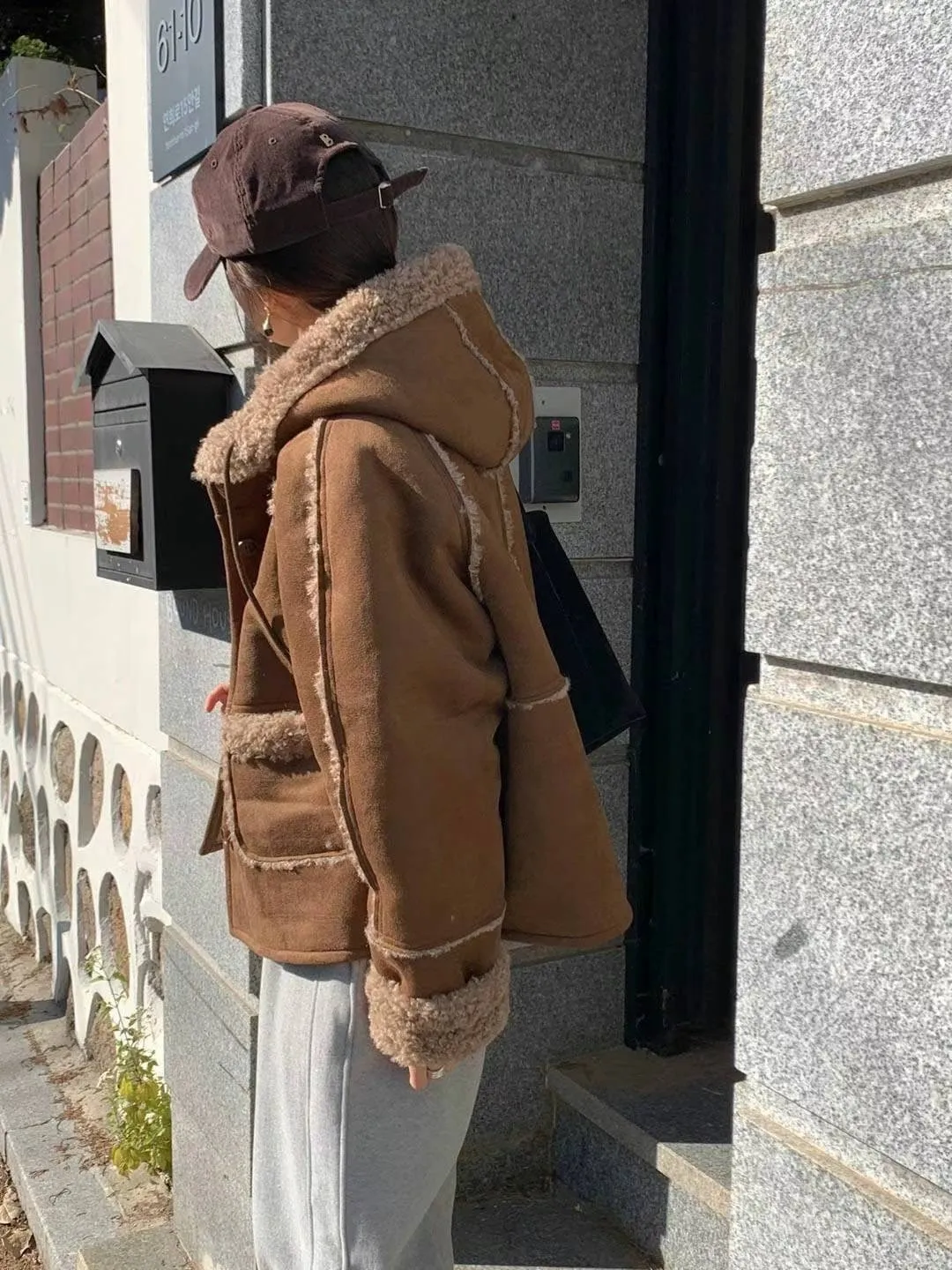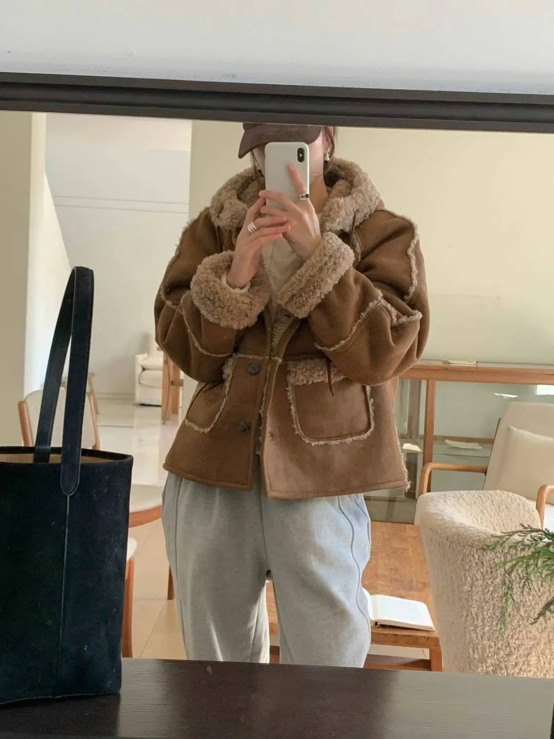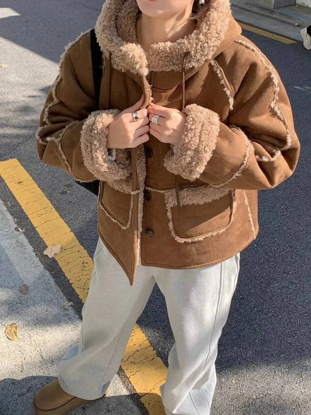 GD013麂皮QQ毛連帽外套 咖 奶茶 官網價$1980 線上價$1950