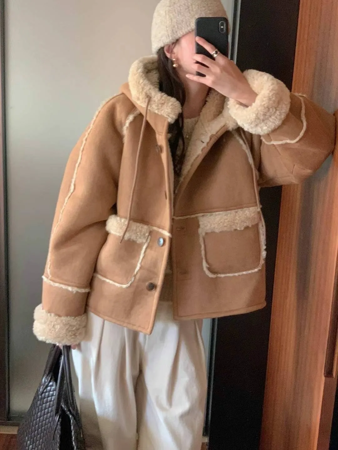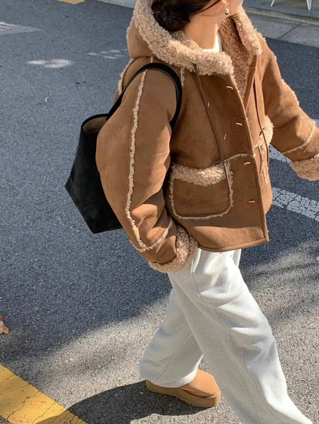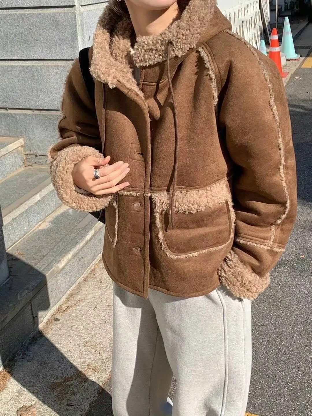 GD013麂皮QQ毛連帽外套 咖 奶茶 官網價$1980 線上價$1950