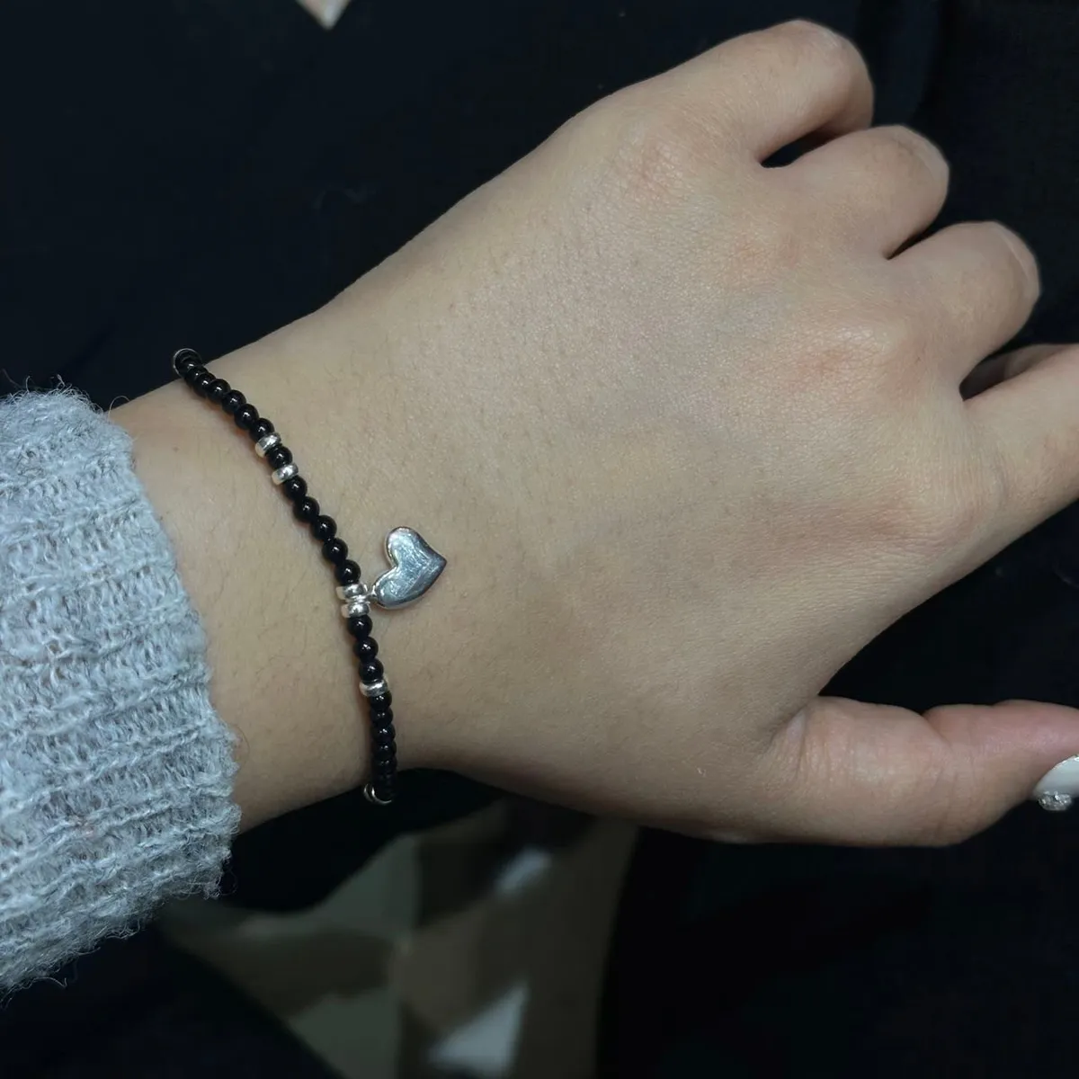 GD104黑瑪瑙珠繩純銀925愛心手鍊