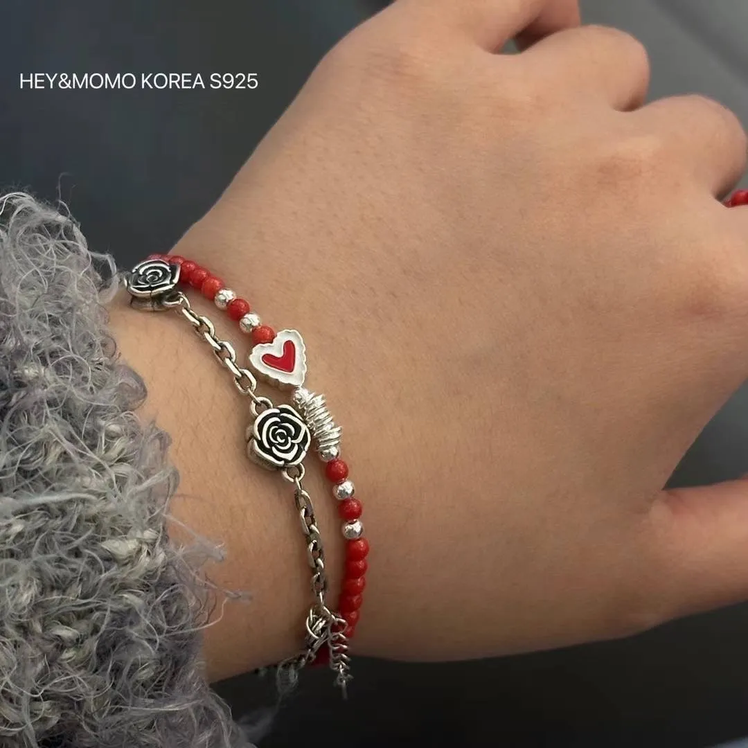 GD107紅瑪瑙珠繩純銀925愛心彈性手鍊