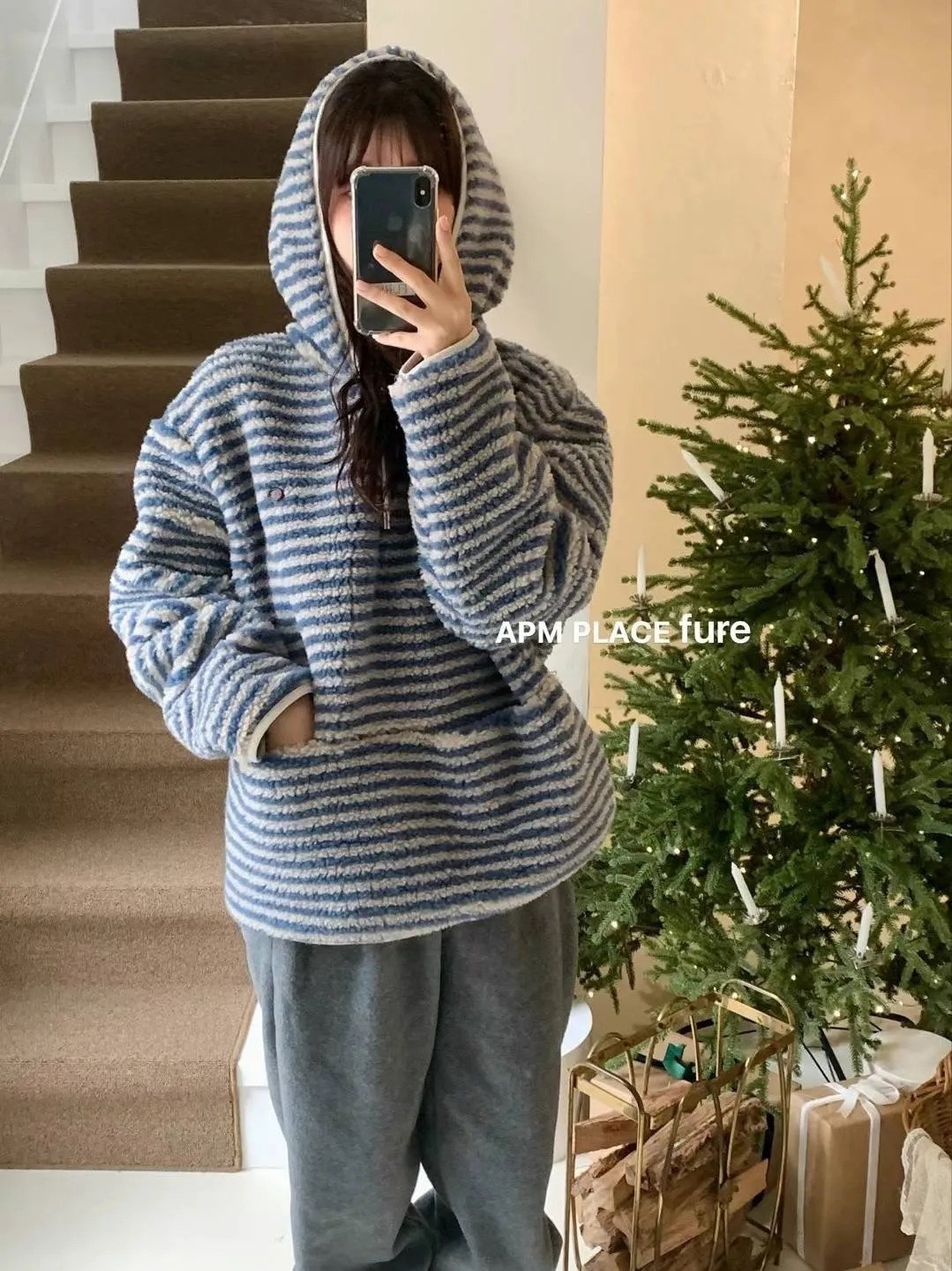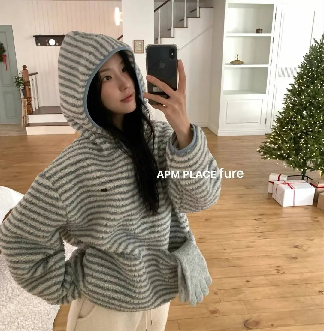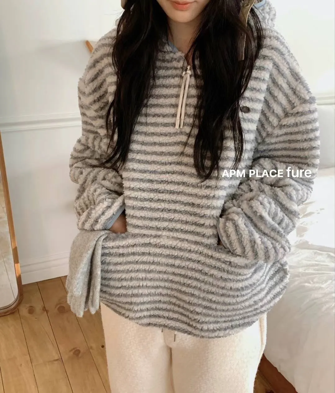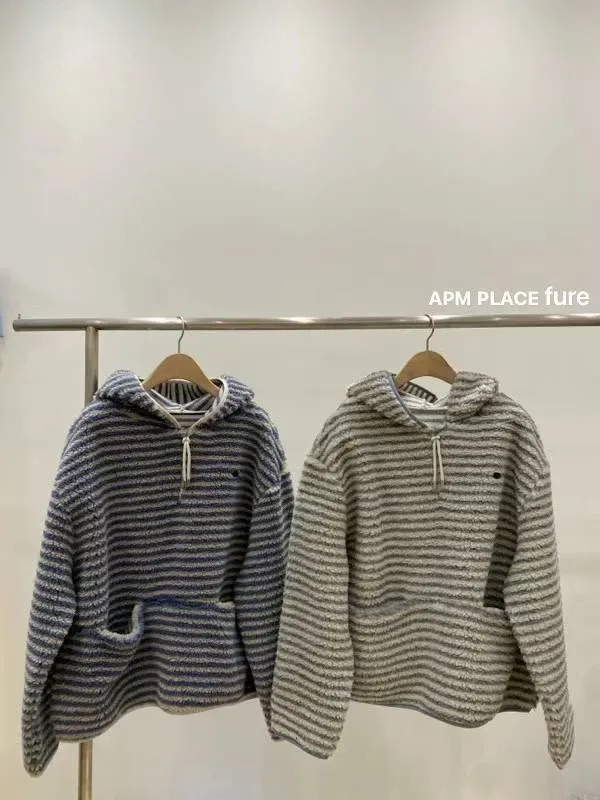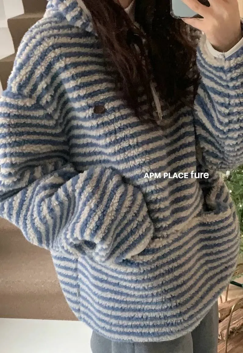 GD250羊羔毛橫條紋帽T 米 藍 官網價$1320 線上價$1290