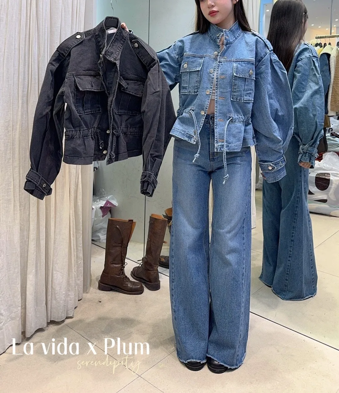 GD309特價腰抽繩雙口袋牛仔外套 藍 黑 特價$890