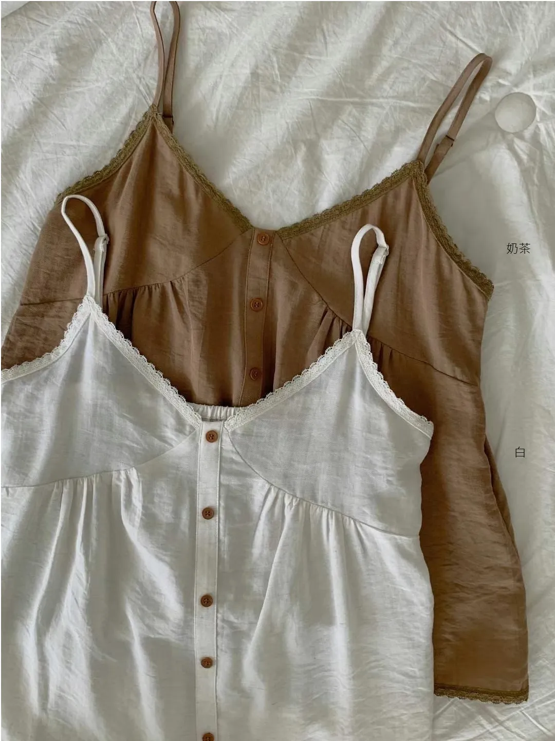 棉+聚酯 微皺質感面料 蕾絲滾邊V領 肩帶可調