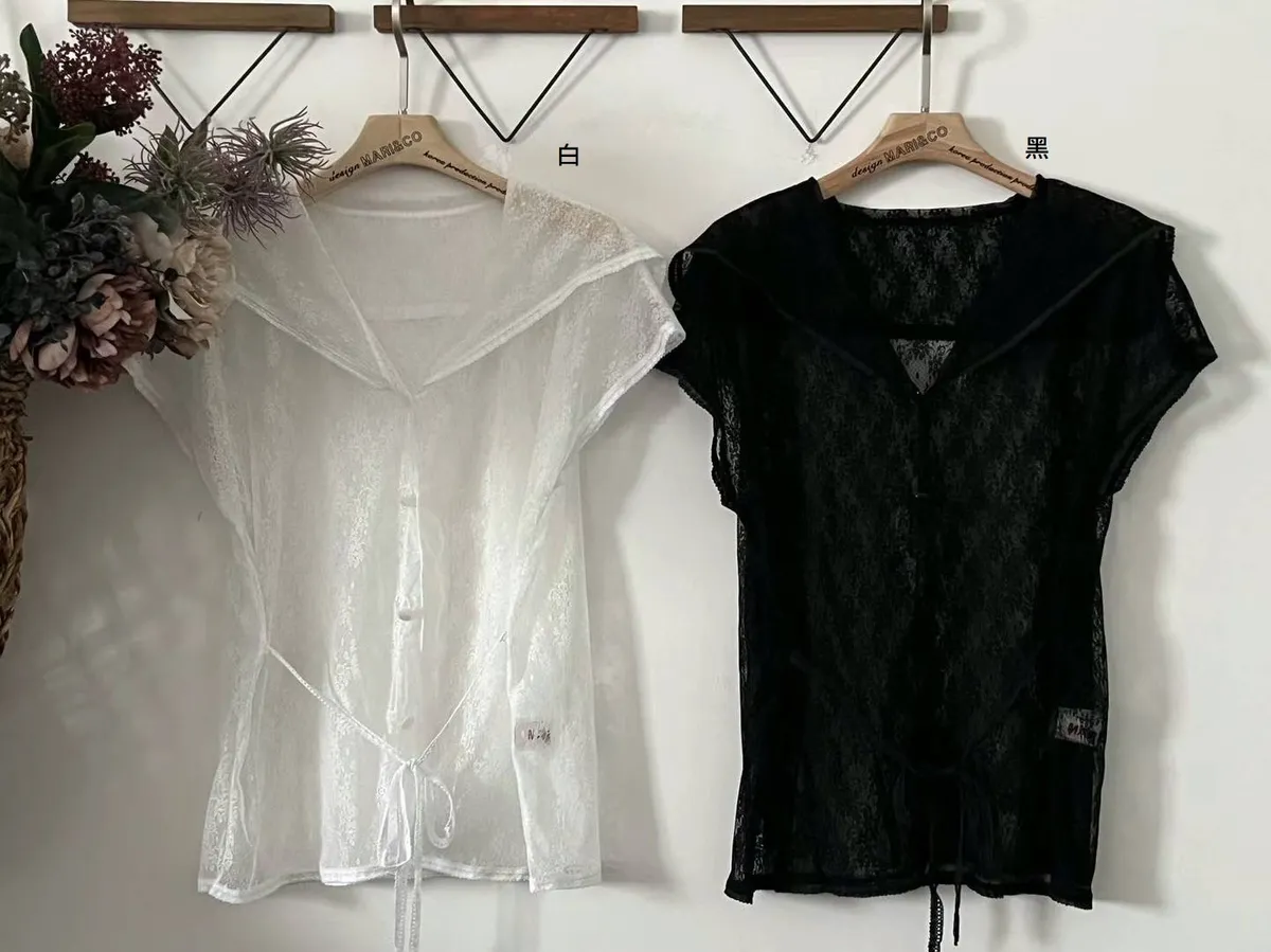 GG225精緻翻領柔軟蕾絲透光上衣 白 黑 官網價$890 線上價$860