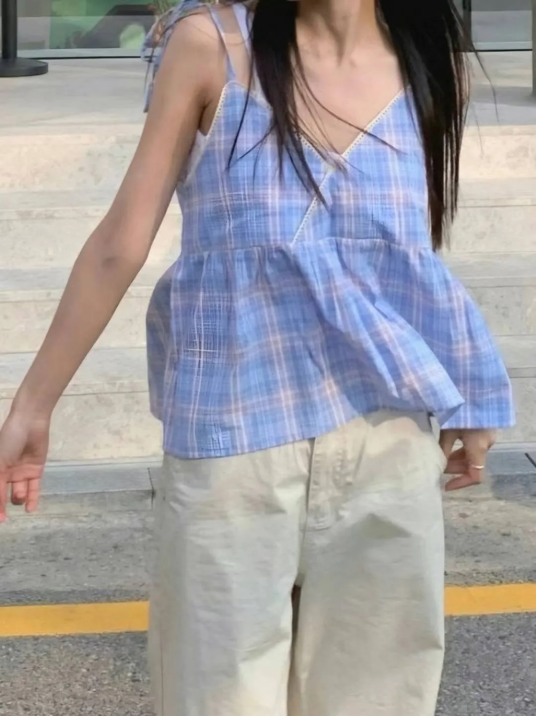 棉 滑順觸感 蕾絲滾邊 肩帶可綁調 白黑是純色 藍色格紋