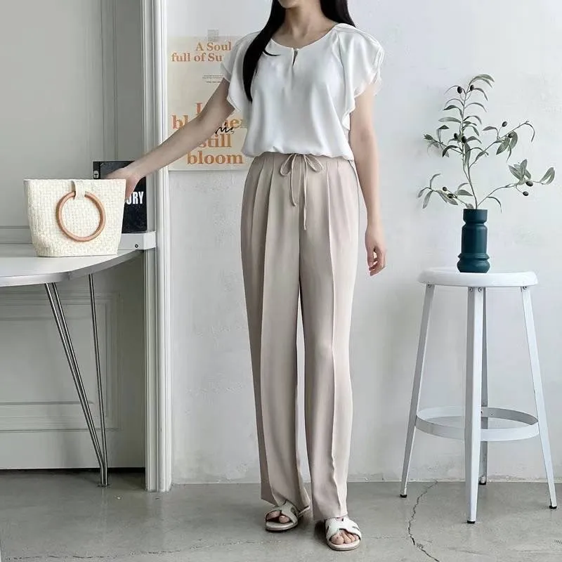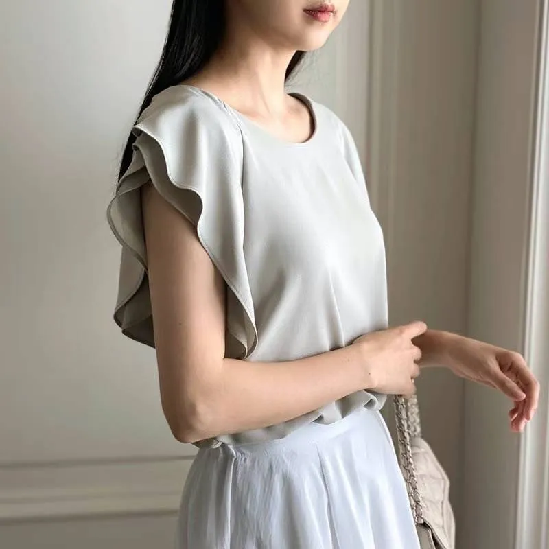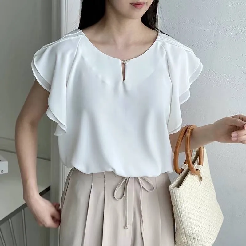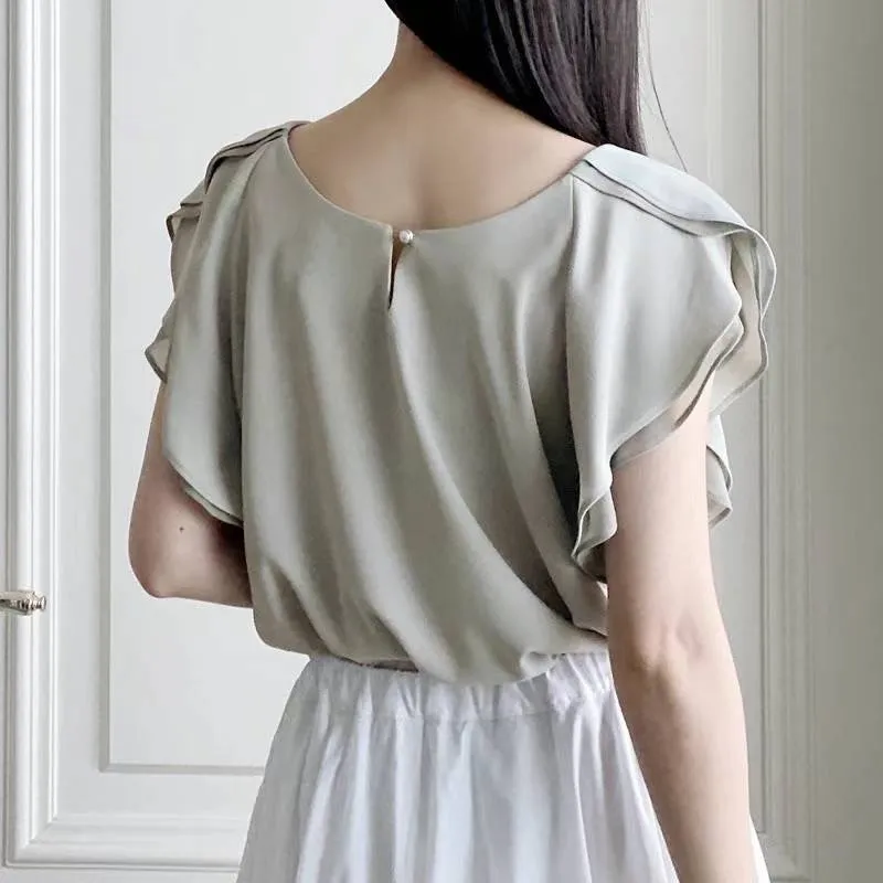 雪紡,後頸珍珠釦 輕盈光澤感 波浪氣質 層次袖口