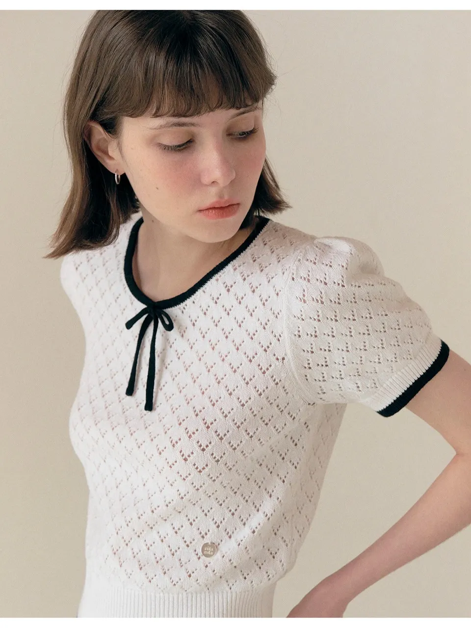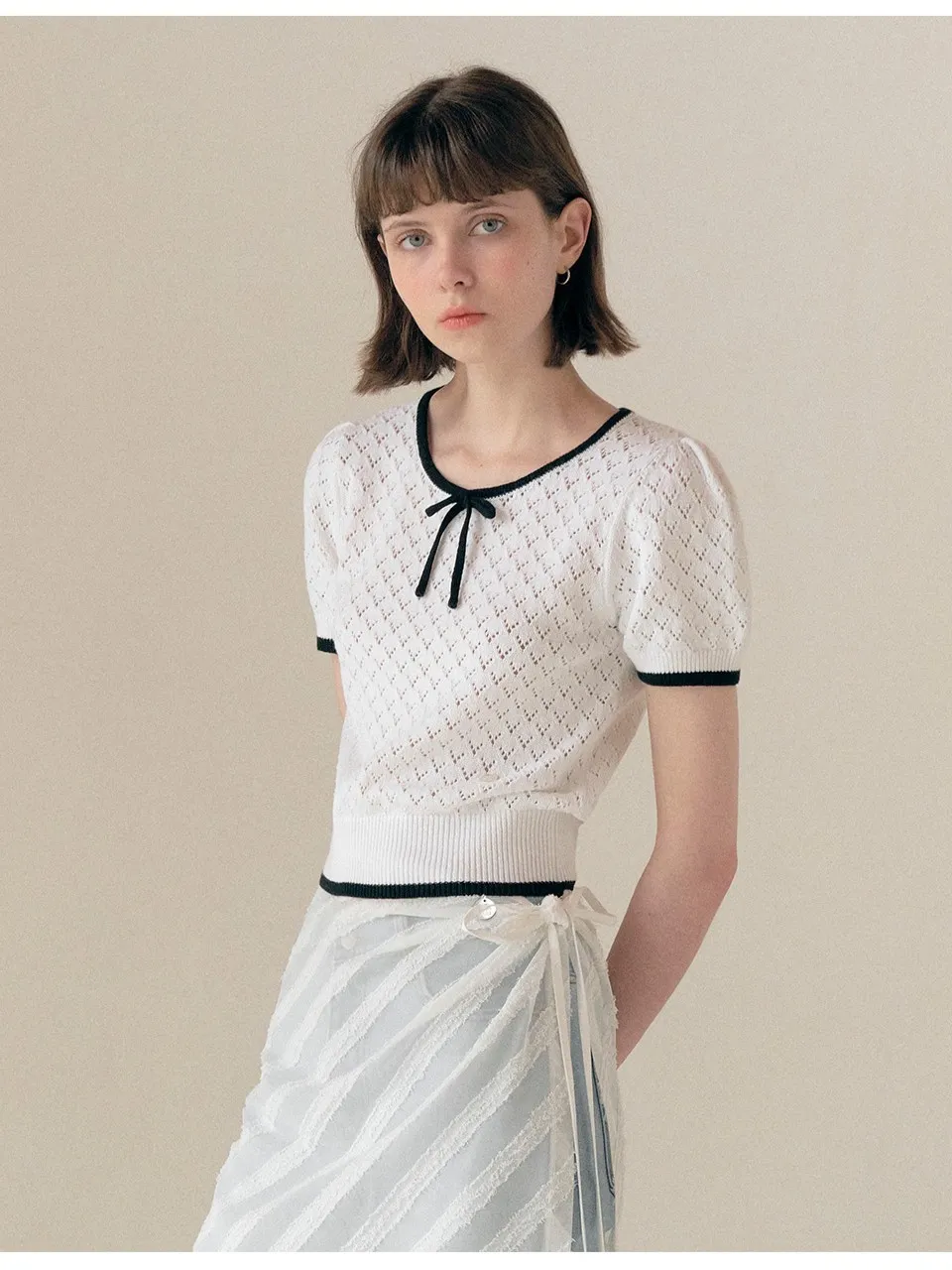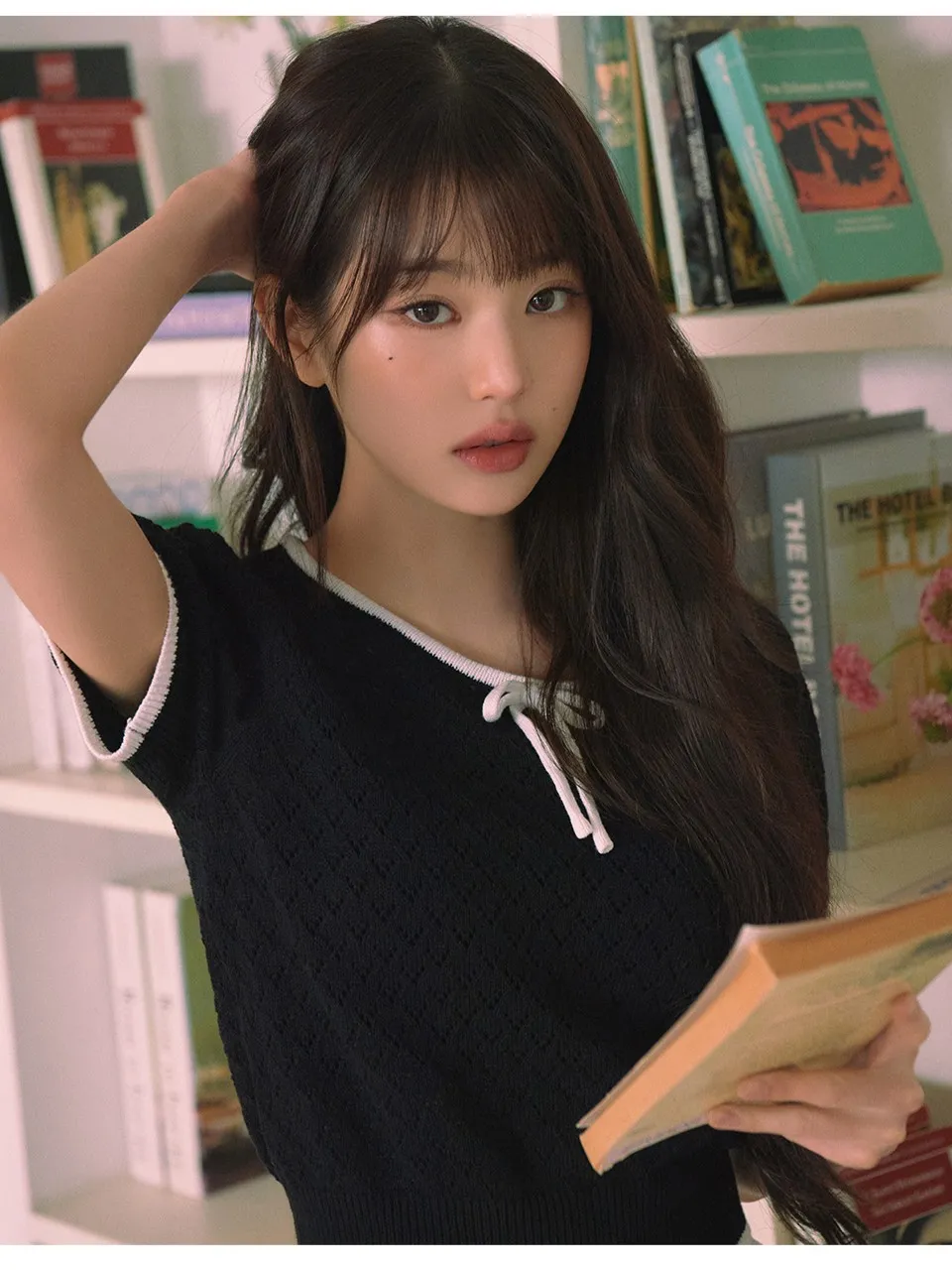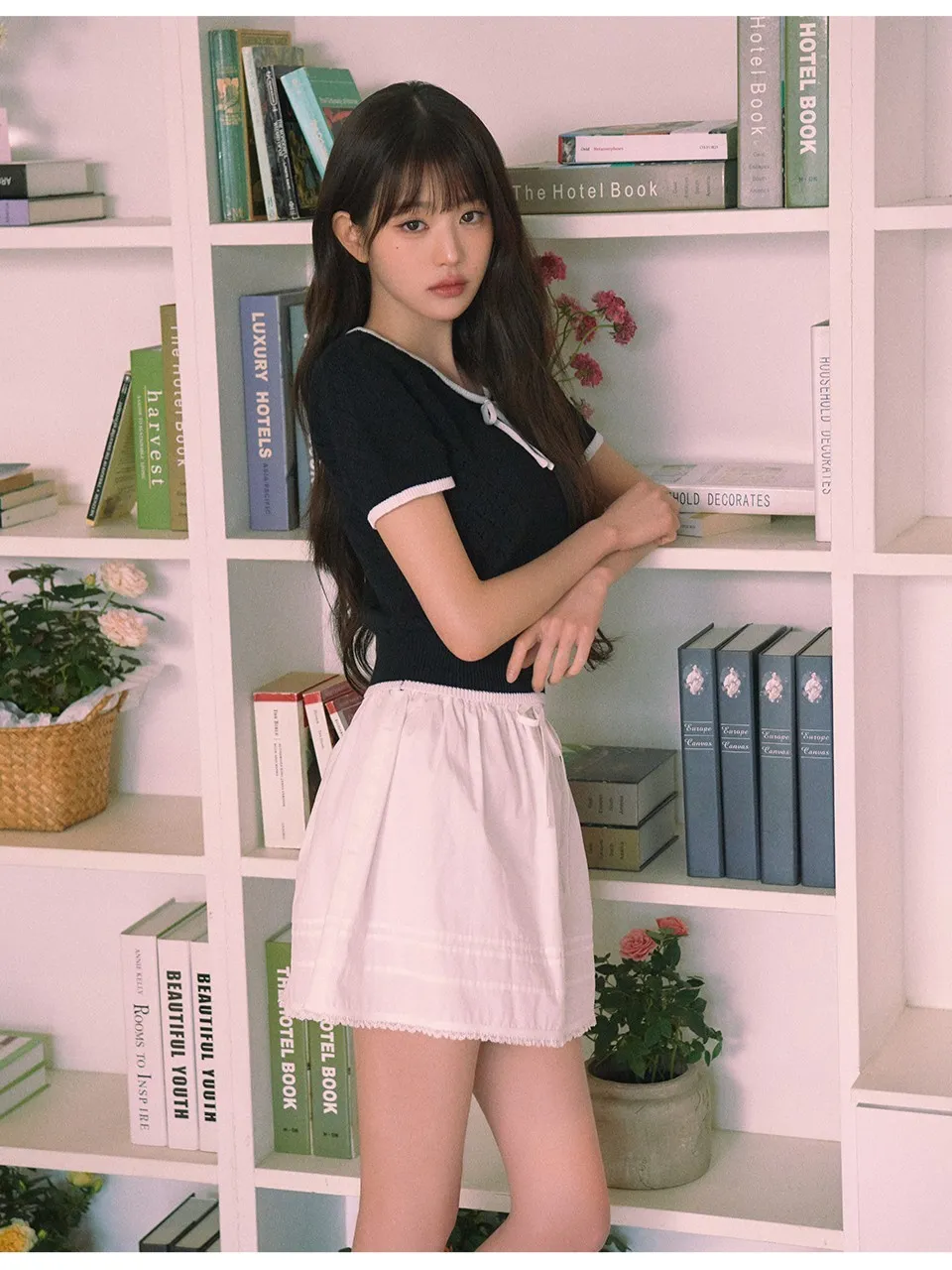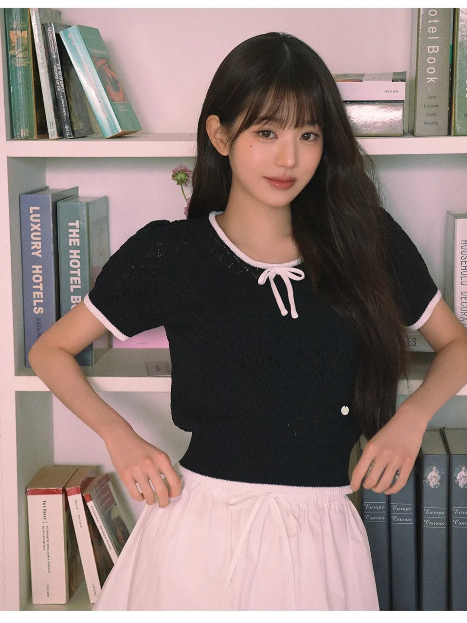 GM005胸綁帶滾邊針織短袖上衣 米 黑 官網價$1350 線上價$1320