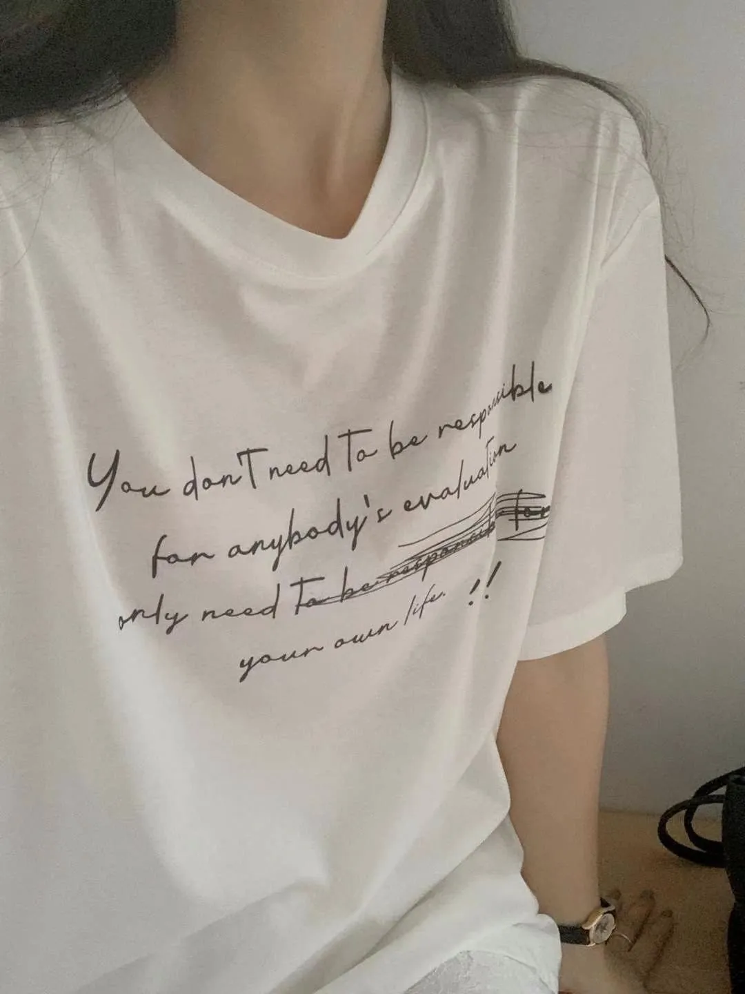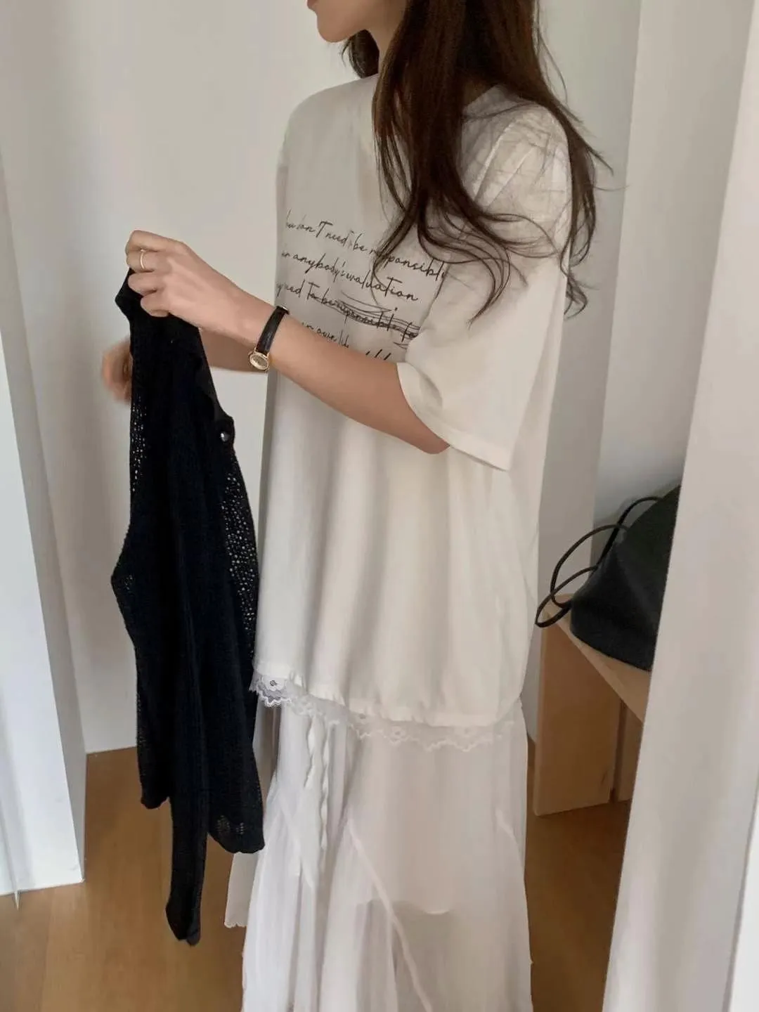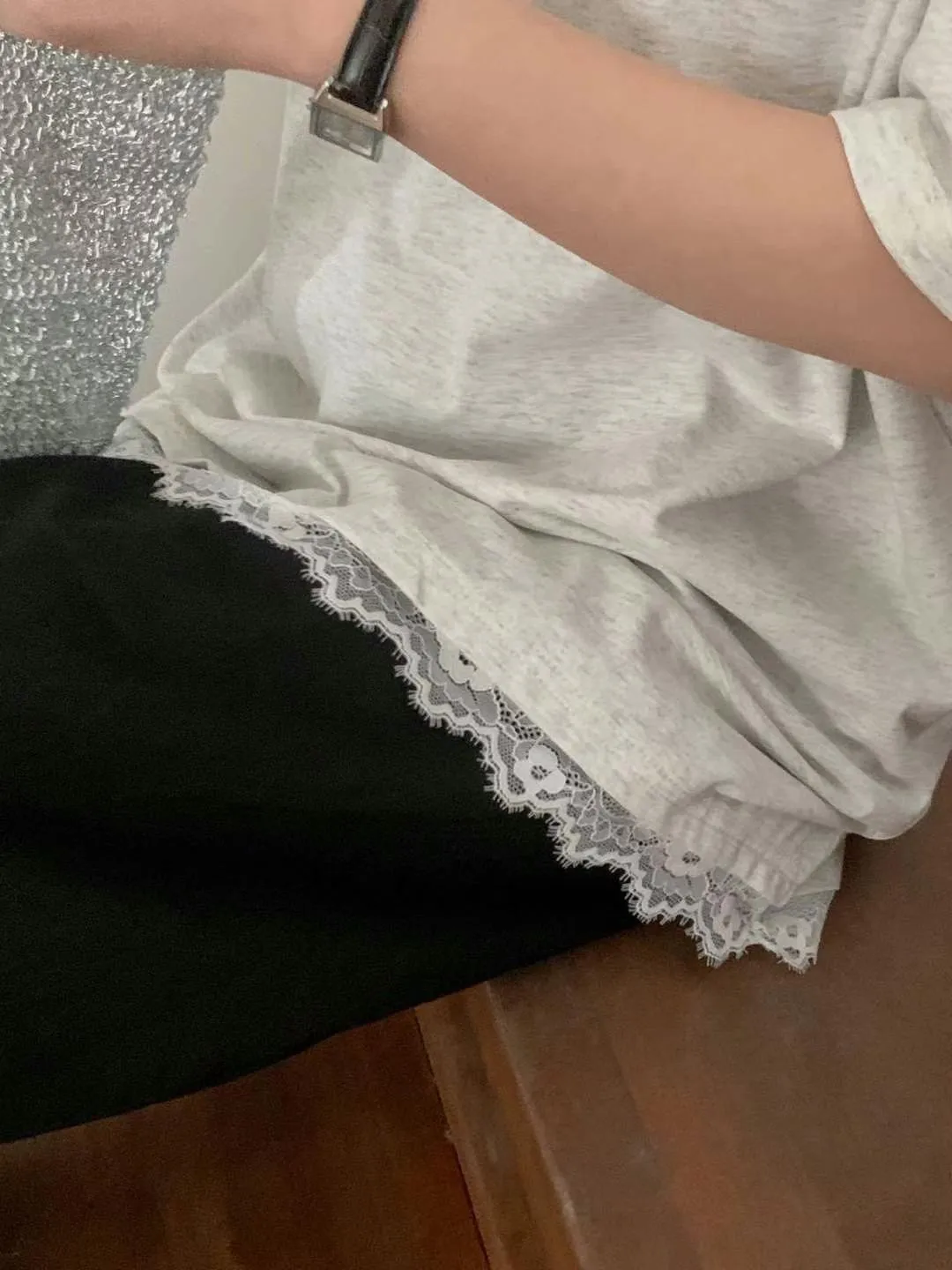 棉+人造絲+彈力 高級面料 觸感舒適 下擺拼接蕾絲 書寫英文
