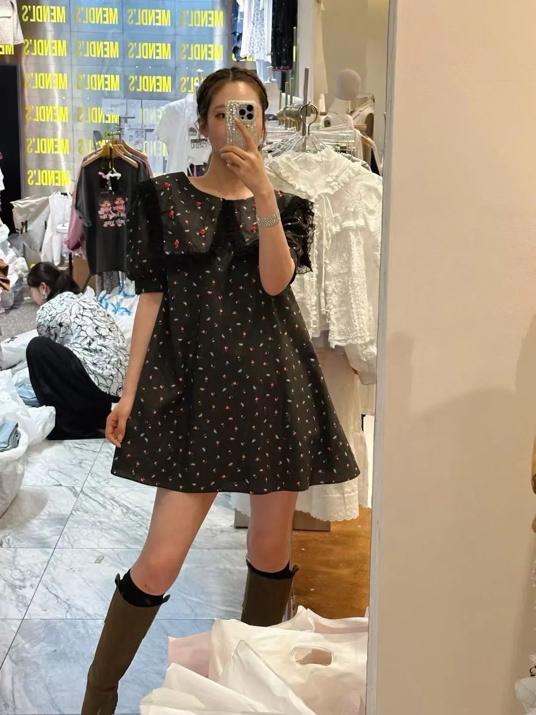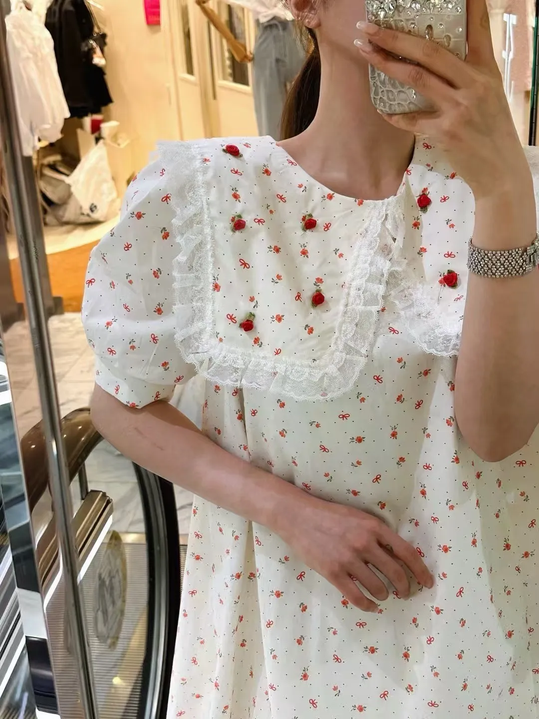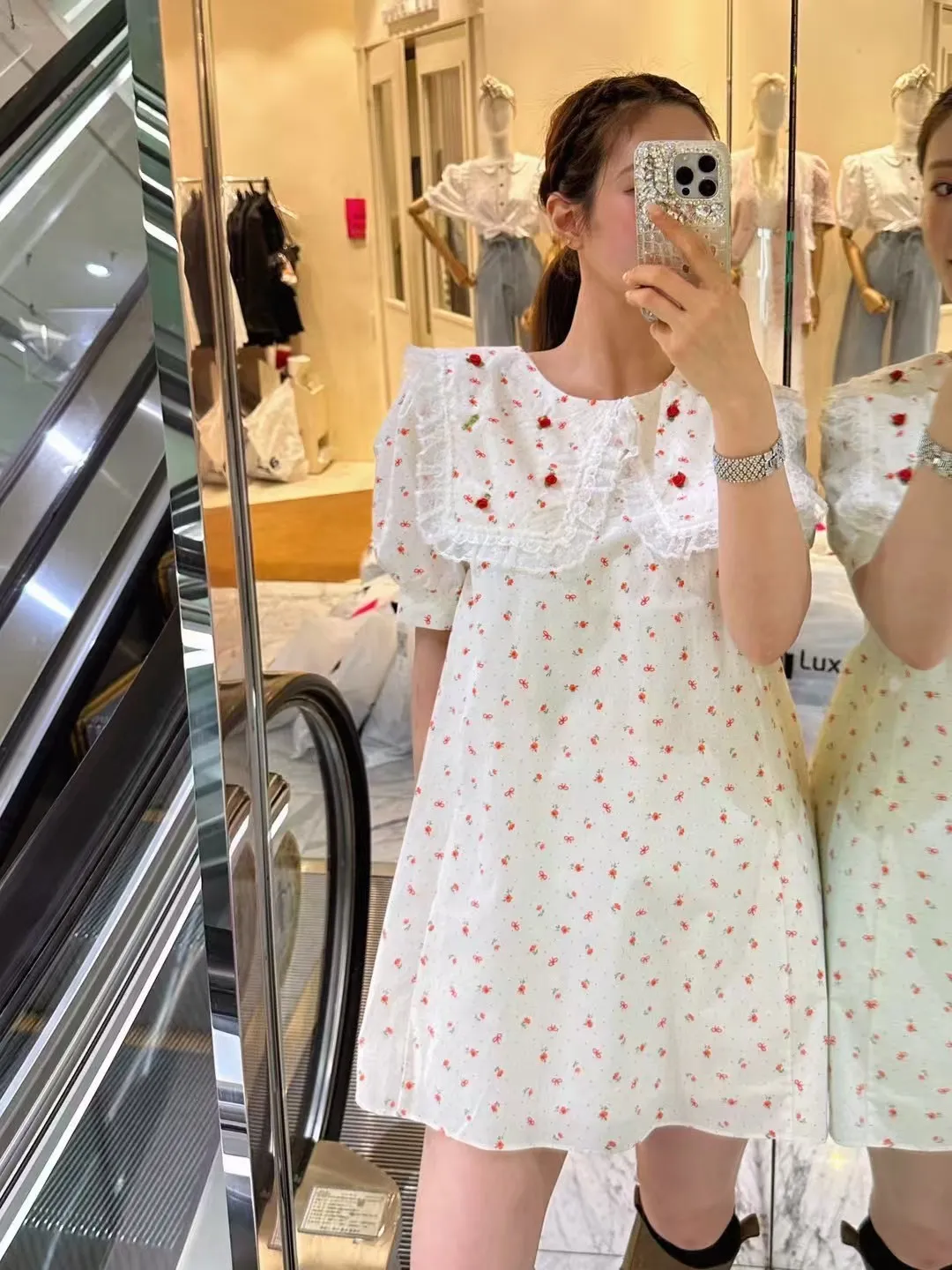 棉 立體小玫瑰花 蕾絲滾邊翻領 有內裡 度假百搭 後拉鍊穿脫
