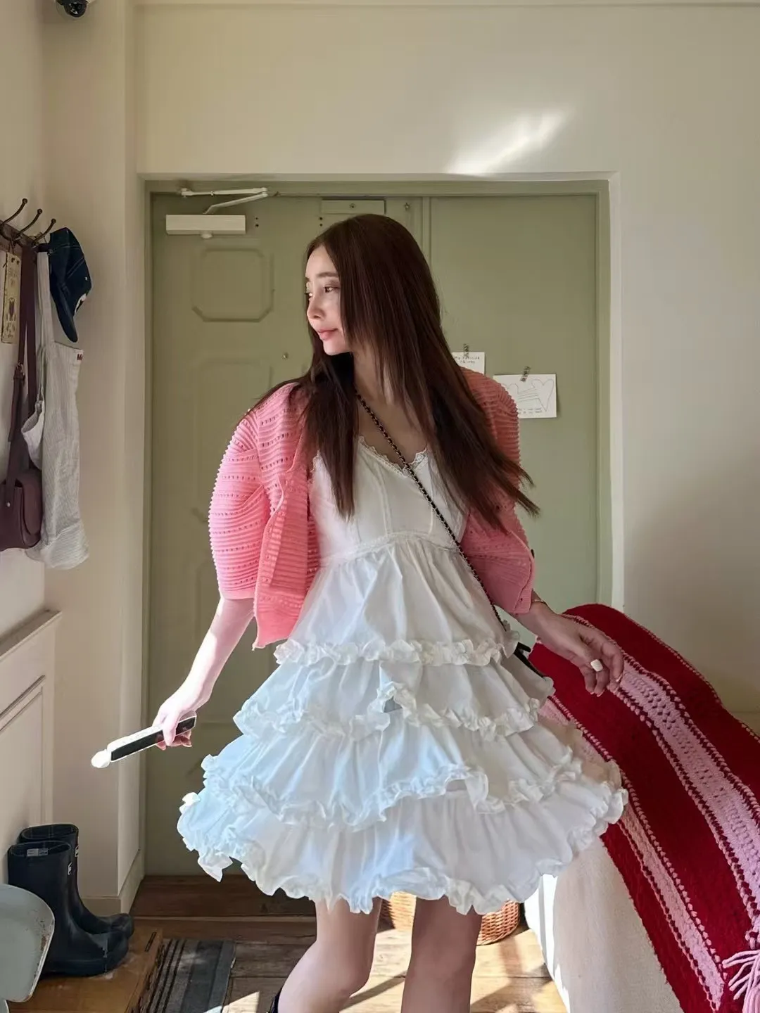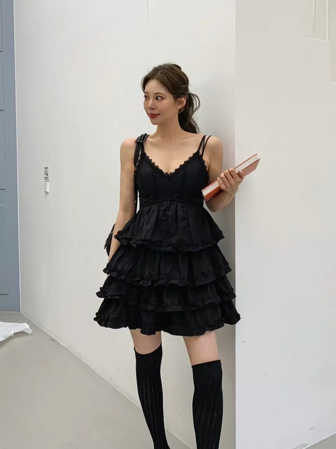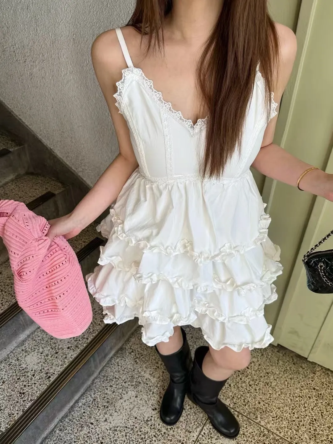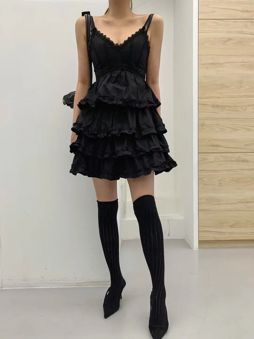 棉,肩帶可調 蕾絲V領 蛋糕裙襬 無口袋 後拉鍊穿脫