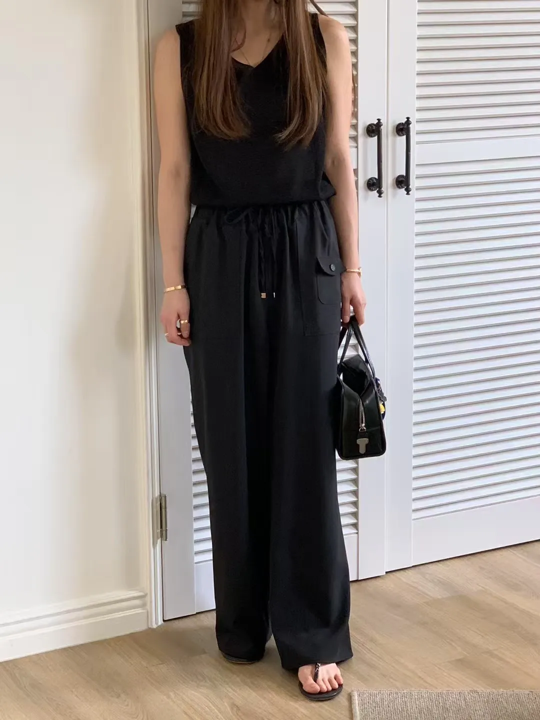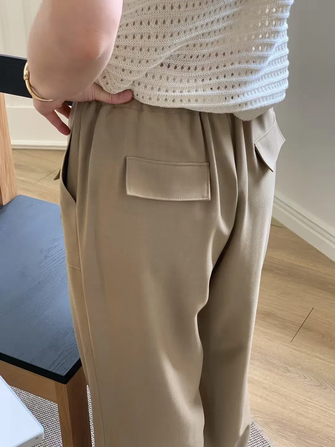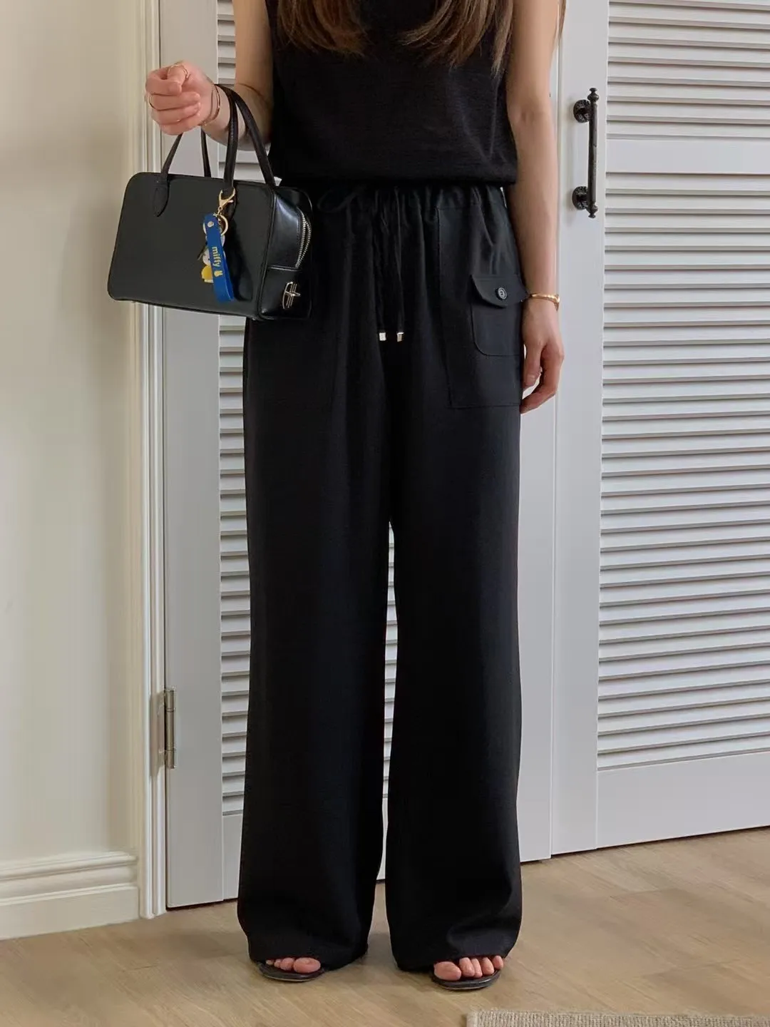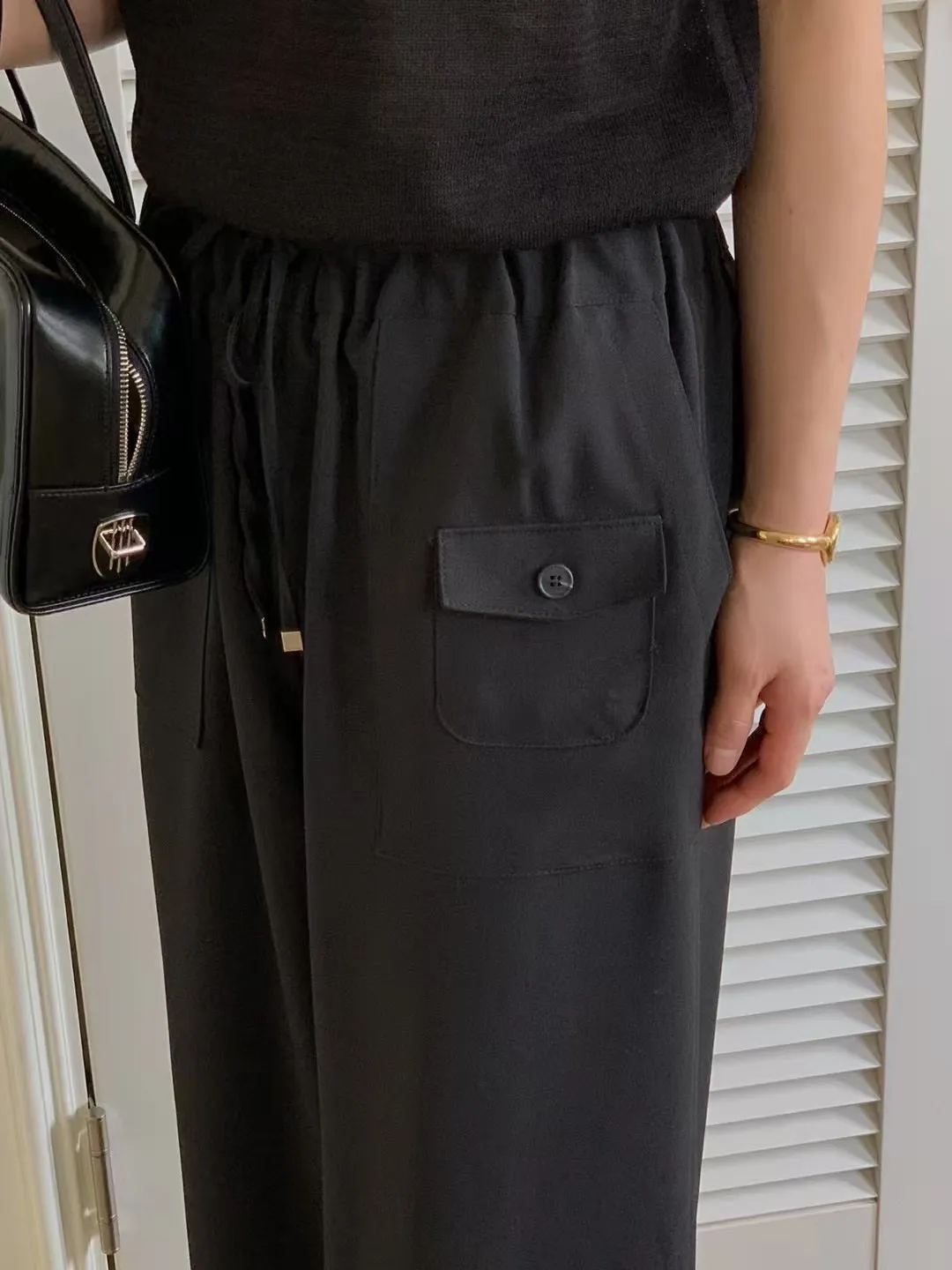 聚酯+彈力 全腰鬆緊有抽繩 側腿前小口袋 有口袋
