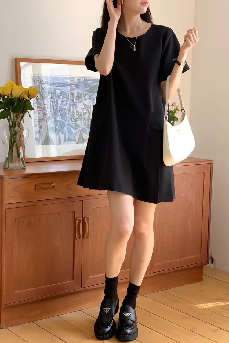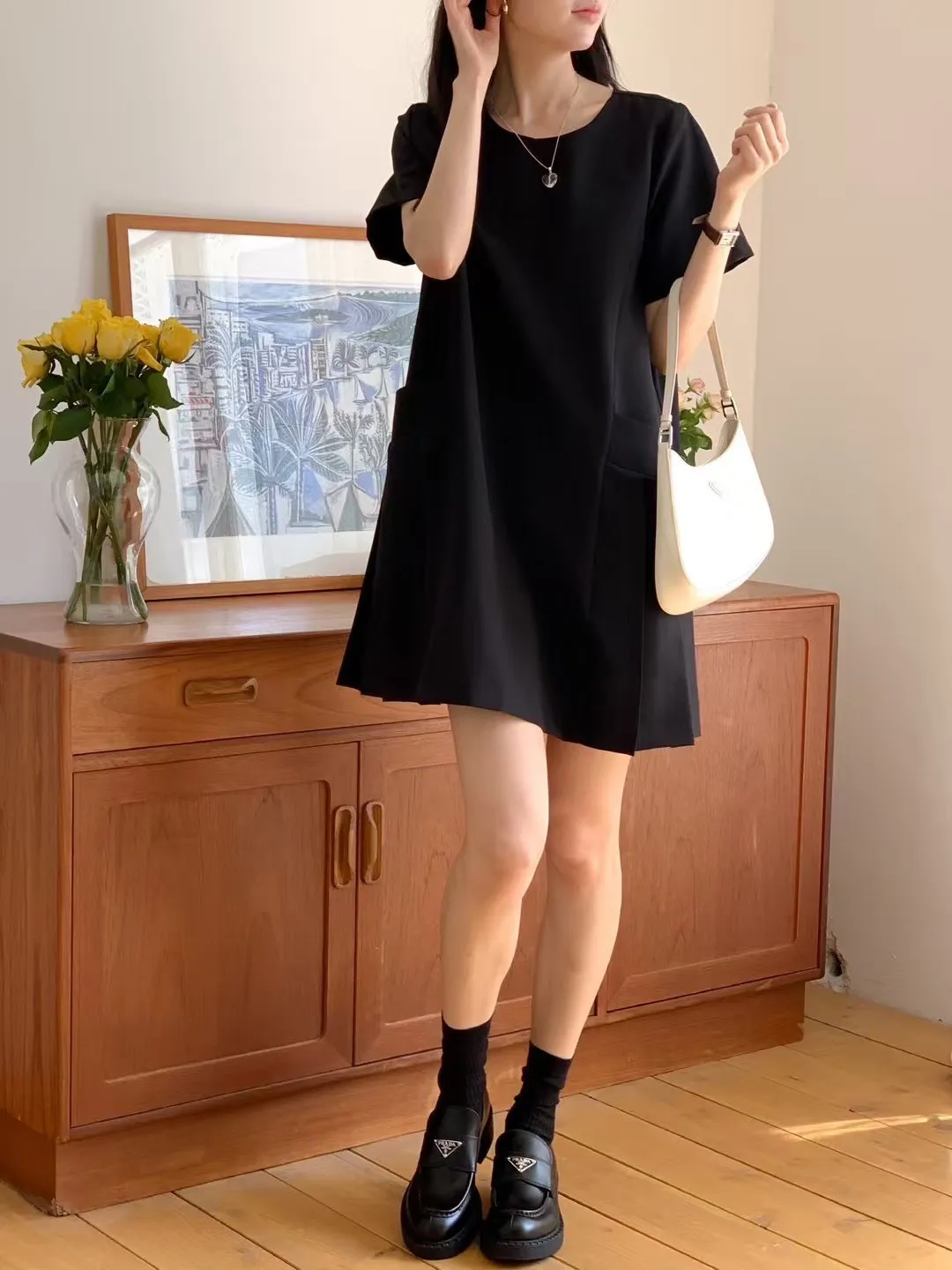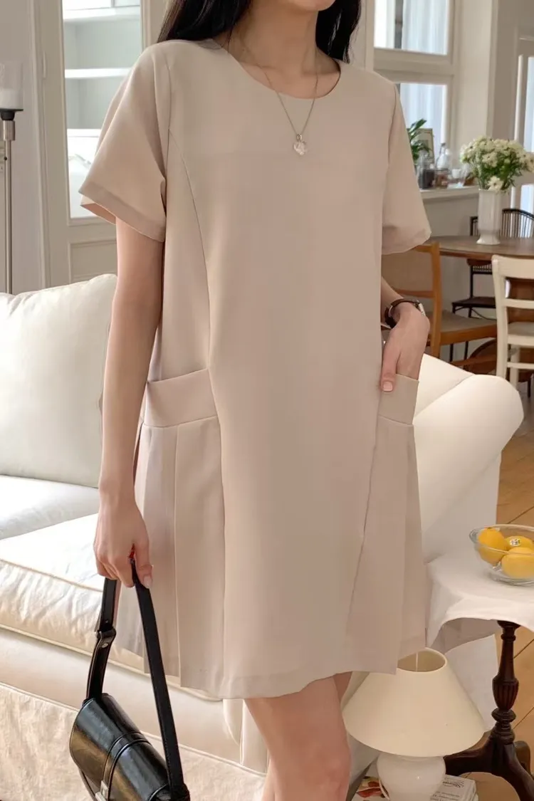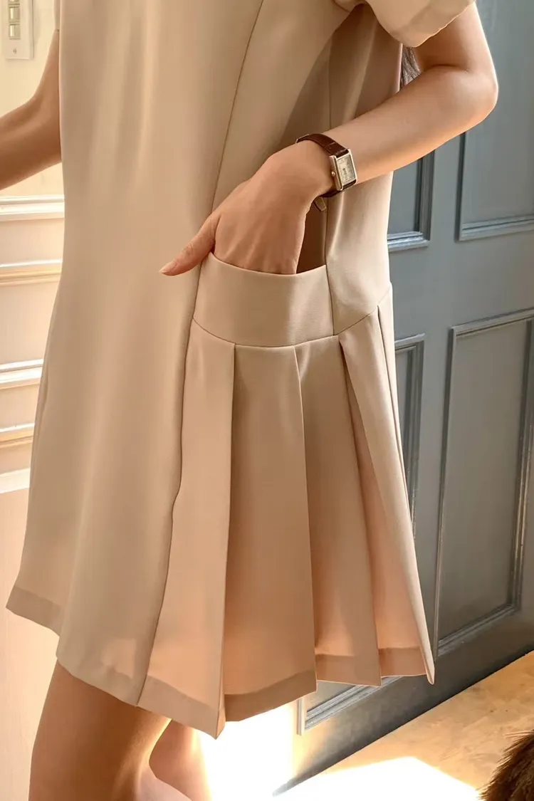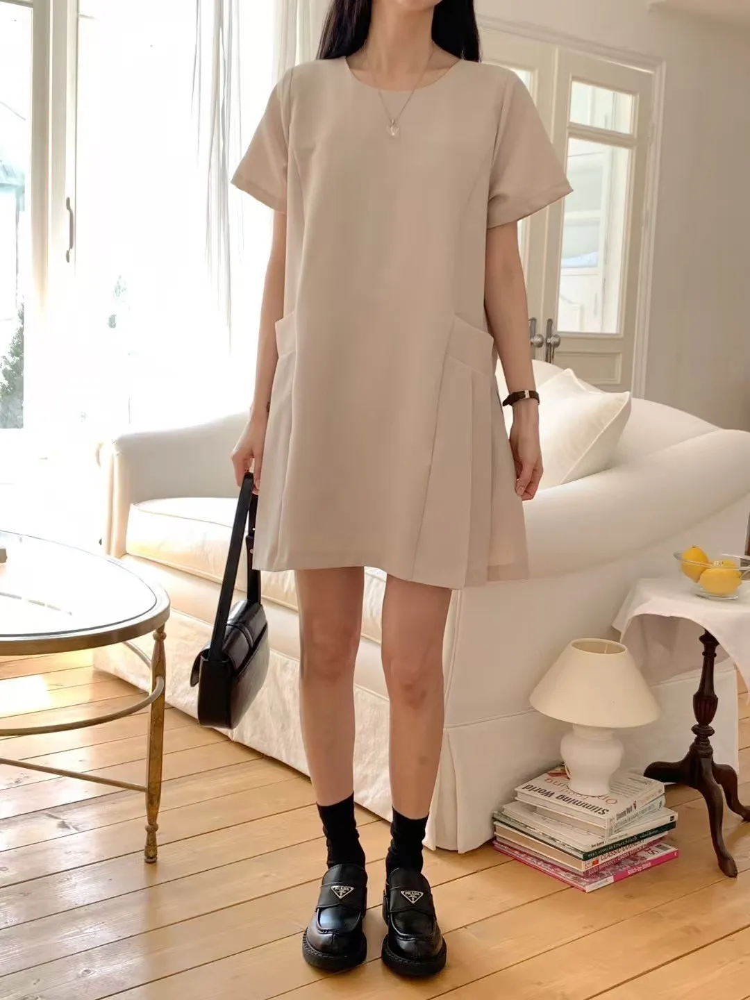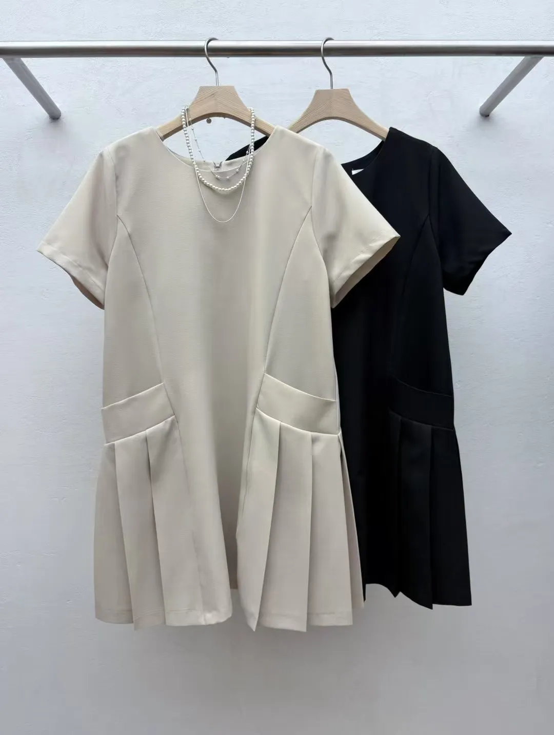 聚酯 不易皺面料 有口袋有內裡 側百褶裙擺 後拉鍊穿脫 適合夏天 L號友善